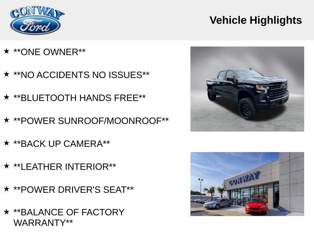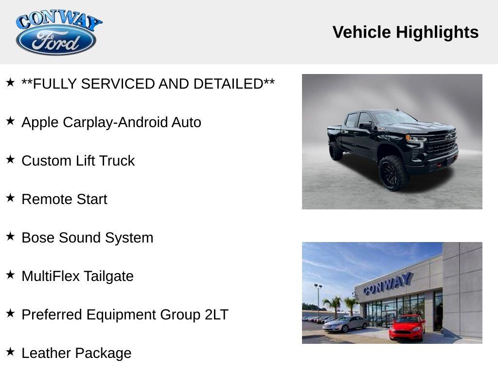 **ONE OWNER**, **NO ACCIDENTS NO ISSUES**, **BLUETOOTH HANDS FREE**, **POWER SUNROOF/MOONROOF**, **BACK UP CAMERA**, **LEATHER INTERIOR**, **POWER DRIVER'S SEAT**, **BALANCE OF FACTORY WARRANTY**, **FULLY SERVICED AND DETAILED**, Apple Carplay-Android Auto, Custom Lift Truck, Remote Start, Bose Sound System, MultiFlex Tailgate, Silverado 1500 LT Trail Boss, 4D Crew Cab, EcoTec3 5.3L V8, 10-Speed Automatic, 4WD, Black Leather, 10-Way Power Driver Seat w/Lumbar, 12.3" Multicolor Reconfigurable Digital Display, 120-Volt Bed Mounted Power Outlet, 120-Volt Interior Power Outlet, 2 USB Data Ports, 4-Wheel Disc Brakes, 6-Speaker Audio System, ABS brakes, Air Conditioning, All-Weather Floor Liner (LPO) (AAK), Auto High-beam Headlights, Auto-Locking Rear Differential, Automatic temperature control, Bluetooth® For Phone, Brake assist, Chevrolet Connected Access Capable, Color-Keyed Carpeting Floor Covering, Compass, Convenience Package, Convenience Package II, Deep-Tinted Glass, Delay-off headlights, Driver door bin, Driver vanity mirror, Dual Exhaust w/Polished Outlets, Dual front impact airbags, Dual front side impact airbags, Dual Rear USB Ports (Charge Only), Dual Zone Auto A/C, Dual-Zone Automatic Climate Control, Electric Rear-Window Defogger, Electrical Steering Column Lock, Electronic Cruise Control, Electronic Stability Control, EZ Lift Power Lock & Release Tailgate, Following Distance Indicator, Forward Collision Alert, Front fog lights, Front LED Fog Lamps, Front Pedestrian Braking, Front reading lights, Front wheel independent suspension, Fully automatic headlights, HD Rear Vision Camera, Heated door mirrors, Heated Driver & Front Outboard Passenger Seats, Heated Power-Adjustable Outside Mirrors, Heated Steering Wheel, High Gloss Black Mirror Caps, Hill Descent Control, Hitch Guidance, Hitch Guidance w/Hitch View, In-Vehicle Trailering System App, Inside Rear-View Mirror w/Tilt, Integrated Trailer Brake Controller, IntelliBeam Automatic High Beam On/Off, Keyless Open & Start, Lane Keep Assist w/Lane Departure Warning, Leather Package, Leather-Appointed Front Seat Trim, LED Cargo Area Lighting, Low tire pressure warning, Multi-Flex Tailgate, OnStar & Chevrolet Connected Services Capable, Panic alarm, Passenger door bin, Performance Red Recovery Hooks, Power door mirrors, Power driver seat, Power Front Windows w/Driver Express Up/Down, Power Front Windows w/Passenger Express Down, Power Rear Windows w/Express Down, Power Sliding Rear Window w/Rear Defogger, Power Sunroof, Power Tailgate, Power windows, Preferred Equipment Group 2LT, Premium Bose 7-Speaker Sound System, Radio data system, Radio: Chevrolet Infotainment 3 Premium System, Rear 60/40 Folding Bench Seat (Folds Up), Rear step bumper, Remote keyless entry, Remote Vehicle Starter System, SiriusXM w/360L, Standard Tailgate, Steering Wheel Audio Controls, Steering wheel mounted audio controls, Tachometer, Telescoping steering wheel, Theft Deterrent System (Unauthorized Entry), Traction control, Trailering Package, Trip computer, Universal Home Remote, Up-Level Rear Seat w/Storage Package, Variably intermittent wipers, Wheels: 20" x 9" High Gloss Black Painted Alum, Wi-Fi Hot Spot Capable, Wrapped Steering Wheel.