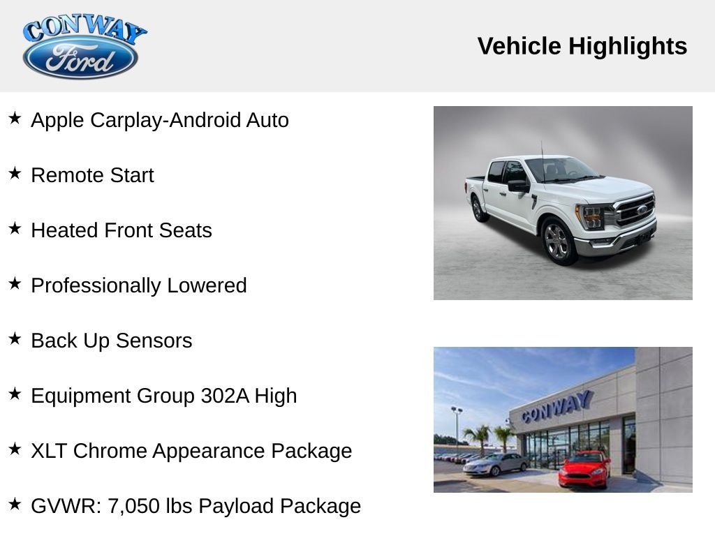 **ONE OWNER**, **NO ACCIDENTS NO ISSUES**, **BLUETOOTH HANDS FREE**, **BACK UP CAMERA**, **POWER DRIVER'S SEAT**, **BLIND SPOT MONITOR**, **BALANCE OF FACTORY WARRANTY**, **FULLY SERVICED AND DETAILED**, Apple Carplay-Android Auto, Remote Start, Heated Front Seats, Professionally Lowered, Back Up Sensors, F-150 XLT, 4D SuperCrew, 5.0L V8, 4WD, Oxford White, Baja Tan Cloth, 10-Way Power Driver & Passenger Seats, 2-Bar Style Grille w/Chrome 2 Minor Bars, 3.31 Axle Ratio, 4-Wheel Disc Brakes, 8" Productivity Screen in Instrument Cluster, ABS brakes, Air Conditioning, Auto High-beam Headlights, Auto-Dimming Rear-View Mirror, Brake assist, Bright Polished Step Bars, Bumpers: chrome, Chrome Door & Tailgate Handles w/Body-Color Bezel, Chrome Single-Tip Exhaust, Class IV Trailer Hitch Receiver, Compass, Cruise Control, Delay-off headlights, Driver door bin, Driver vanity mirror, Dual front impact airbags, Dual front side impact airbags, Dual Zone Electronic Automatic Temperature Control, Electronic Stability Control, Equipment Group 302A High, Exterior Parking Camera Rear, Front fog lights, Front reading lights, Front wheel independent suspension, Fully automatic headlights, GVWR: 7,050 lbs Payload Package, Heated door mirrors, Heated Front Seats, Intelligent Access w/Push Button Start, LED Reflector Headlamps, LED Sideview Mirror Spotlights, Low tire pressure warning, Onboard 400W Outlet, Outside temperature display, Panic alarm, Passenger door bin, Passenger vanity mirror, Power door mirrors, Power Glass Heated Sideview Mirrors, Power windows, Radio data system, Radio: AM/FM SiriusXM w/360L, Rear step bumper, Rear Under-Seat Storage, Remote keyless entry, Remote Start System w/Remote Tailgate Release, SecuriCode Drivers Side Keyless-Entry Keypad, Steering wheel mounted audio controls, SYNC 4 w/Enhanced Voice Recognition, Tachometer, Telescoping steering wheel, Traction control, Trip computer, Variably intermittent wipers, Wheels: 20" Chrome-Like PVD, Wrapped Steering Wheel, XLT Chrome Appearance Package, Zone Lighting. Priced below KBB Fair Purchase Price!