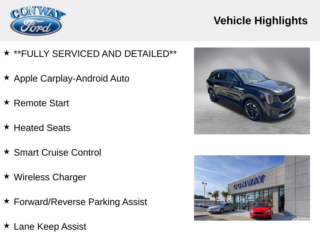 **ONE OWNER**, **NO ACCIDENTS NO ISSUES**, **BLUETOOTH HANDS FREE**, **BACK UP CAMERA**, **LEATHER INTERIOR**, **POWER DRIVER'S SEAT**, **BLIND SPOT MONITOR**, **BALANCE OF FACTORY WARRANTY**, **FULLY SERVICED AND DETAILED**, Apple Carplay-Android Auto, Remote Start, Heated Seats, Smart Cruise Control, Wireless Charger, Forward/Reverse Parking Assist, Lane Keep Assist, Sorento S, 4D Sport Utility, 2.5L I4 DGI DOHC 16V LEV3-SULEV30 191hp, FWD, Ebony Black, Black Leather, 4-Wheel Disc Brakes, ABS brakes, Adaptive Cruise Control, Air Conditioning, AM/FM radio: SiriusXM, Android Auto, Auto High-beam Headlights, Automatic temperature control, Brake assist, Bumpers: body-color, Delay-off headlights, Driver door bin, Driver vanity mirror, Dual front impact airbags, Dual front side impact airbags, Dual Zone Auto A/C, Electronic Stability Control, Exterior Parking Camera Rear, Four wheel independent suspension, Front Bucket Seats, Front reading lights, Fully automatic headlights, Heated Seats, Knee airbag, Leather Shift Knob, Leather steering wheel, Low tire pressure warning, Outside temperature display, Panic alarm, Passenger door bin, Power door mirrors, Power driver seat, Power windows, Radio data system, Radio: AM/FM Audio System, Rear window defroster, Rear window wiper, Remote keyless entry, Smart Key w/ Push Button and Remote Start, Spoiler, Steering wheel mounted audio controls, SynTex Artificial Leather Seat Trim, Tachometer, Telescoping steering wheel, Traction control, Trip computer, Variably intermittent wipers, Wheels: 7.5J x 18" Alloy w/Machine Finish.