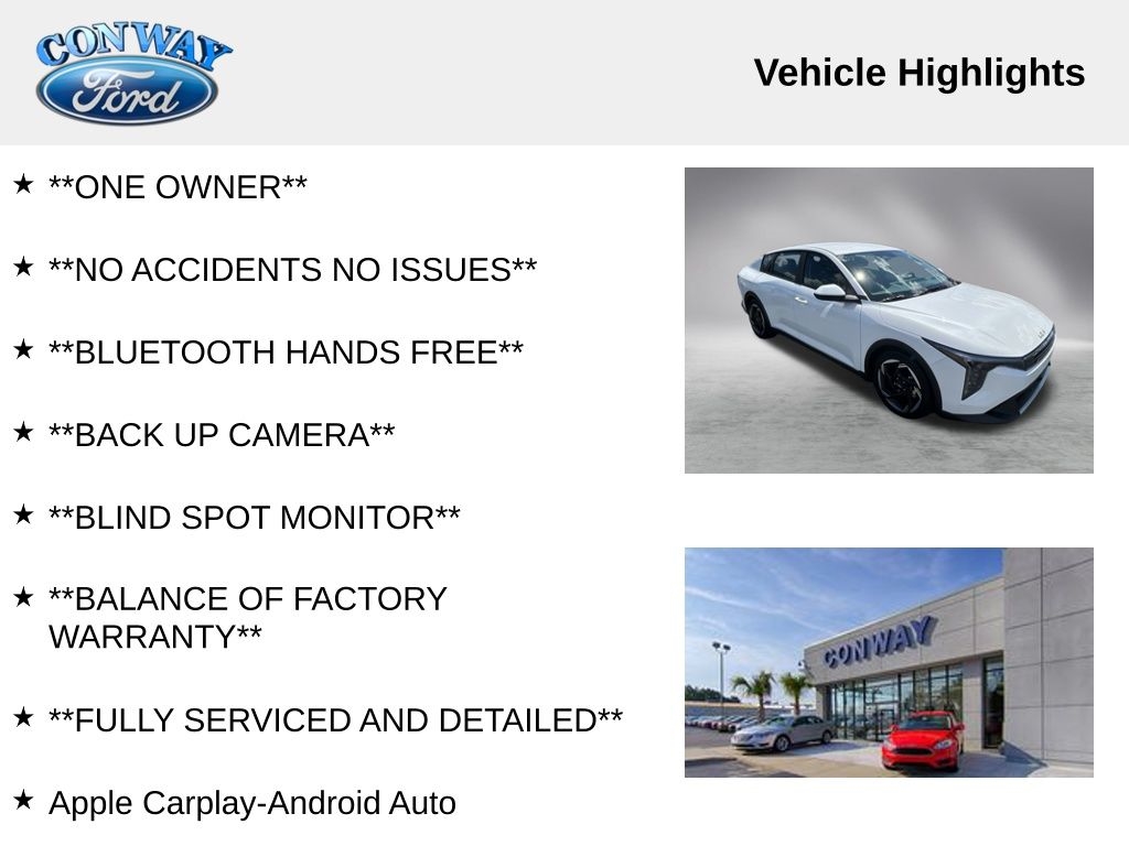**ONE OWNER**, **NO ACCIDENTS NO ISSUES**, **BLUETOOTH HANDS FREE**, **BACK UP CAMERA**, **BLIND SPOT MONITOR**, **BALANCE OF FACTORY WARRANTY**, **FULLY SERVICED AND DETAILED**, Apple Carplay-Android Auto, Remote Start, Dual Zone Auto Climate Control, Wireless Phone Charger, Lane Keep Assist, Smart Cruise Control, K4 EX, 4D Sedan, 2.0L I4 MPI, FWD, Snow White Pearl, 4-Wheel Disc Brakes, ABS brakes, Adaptive Cruise Control, Air Conditioning, AM/FM radio: SiriusXM, Auto High-beam Headlights, Automatic temperature control, Brake assist, Bumpers: body-color, Delay-off headlights, Driver door bin, Driver vanity mirror, Dual front impact airbags, Dual front side impact airbags, Dual Zone Auto A/C, Electronic Stability Control, Front Bucket Seats, Front reading lights, Front wheel independent suspension, Fully automatic headlights, Heated door mirrors, Low tire pressure warning, Outside temperature display, Panic alarm, Passenger door bin, Power door mirrors, Power windows, Radio data system, Radio: 12.3" Touchscreen Audio Display, Rear window defroster, Remote keyless entry, Steering wheel mounted audio controls, Tachometer, Telescoping steering wheel, Trip computer, Upgraded Cloth Seat Trim, Variably intermittent wipers, Wheels: 17" x 7.0J Black Machined Alloy.