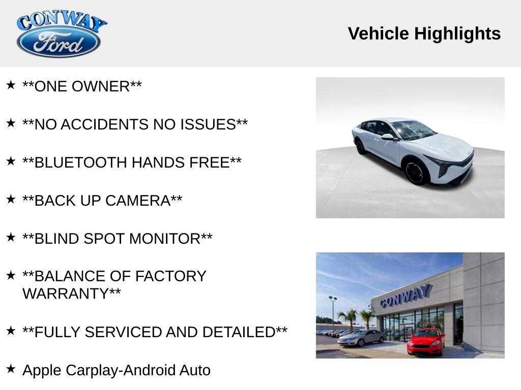 **ONE OWNER**, **NO ACCIDENTS NO ISSUES**, **BLUETOOTH HANDS FREE**, **BACK UP CAMERA**, **BLIND SPOT MONITOR**, **BALANCE OF FACTORY WARRANTY**, **FULLY SERVICED AND DETAILED**, Apple Carplay-Android Auto, Remote Start, Dual Zone Auto Climate Control, Wireless Phone Charger, Lane Keep Assist, Smart Cruise Control, K4 EX, 4D Sedan, 2.0L I4 MPI, FWD, Snow White Pearl, 4-Wheel Disc Brakes, ABS brakes, Adaptive Cruise Control, Air Conditioning, AM/FM radio: SiriusXM, Auto High-beam Headlights, Automatic temperature control, Brake assist, Bumpers: body-color, Delay-off headlights, Driver door bin, Driver vanity mirror, Dual front impact airbags, Dual front side impact airbags, Dual Zone Auto A/C, Electronic Stability Control, Front Bucket Seats, Front reading lights, Front wheel independent suspension, Fully automatic headlights, Heated door mirrors, Low tire pressure warning, Outside temperature display, Panic alarm, Passenger door bin, Power door mirrors, Power windows, Radio data system, Radio: 12.3" Touchscreen Audio Display, Rear window defroster, Remote keyless entry, Steering wheel mounted audio controls, Tachometer, Telescoping steering wheel, Trip computer, Upgraded Cloth Seat Trim, Variably intermittent wipers, Wheels: 17" x 7.0J Black Machined Alloy.