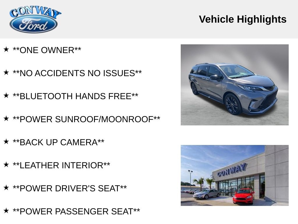 **ONE OWNER**, **NO ACCIDENTS NO ISSUES**, **BLUETOOTH HANDS FREE**, **POWER SUNROOF/MOONROOF**, **BACK UP CAMERA**, **LEATHER INTERIOR**, **POWER DRIVER'S SEAT**, **POWER PASSENGER SEAT**, **BLIND SPOT MONITOR**, **NAVIGATION**, **BALANCE OF FACTORY WARRANTY**, **FULLY SERVICED AND DETAILED**, Apple Carplay-Android Auto, Toyota Safety Sense, Dynamic Radar Cruise Control, Lane Departure Warning, Dual Power Side Doors, Premium Audio w/ Navigation and 8 Speakers, 2nd Row Captains Chairs, Sienna XSE 7 Passenger, 4D Passenger Van, FWD, 4-Wheel Disc Brakes, 8 Speakers, ABS brakes, Adaptive Cruise Control, Air Conditioning, AM/FM radio: SiriusXM, Apple CarPlay/Android Auto, Auto High-beam Headlights, Automatic temperature control, Brake assist, Bumpers: body-color, Compass, Delay-off headlights, Door auto-latch, Driver door bin, Driver vanity mirror, Dual front impact airbags, Dual front side impact airbags, Dual Zone Auto A/C, Electronic Stability Control, Exterior Parking Camera Rear, Four wheel independent suspension, Front fog lights, Front Heated Bucket Seats, Front reading lights, Fully automatic headlights, Garage door transmitter: HomeLink, Heated door mirrors, Knee airbag, Lane Departure Warning System, Leather Shift Knob, Leather steering wheel, Low tire pressure warning, Navigation System, Outside temperature display, Panic alarm, Passenger door bin, Passenger vanity mirror, Power door mirrors, Power driver seat, Power Liftgate, Power moonroof, Power passenger seat, Power windows, Radio data system, Radio: Premium Audio w/Navigation, Rear air conditioning, Rear dual zone A/C, Rear reading lights, Rear window defroster, Rear window wiper, Reclining 3rd row seat, SofTex Seat Trim, Spoiler, Tachometer, Telescoping steering wheel, Traction control, Trip computer, Variably intermittent wipers, Wheels: 20" Dark Alloy. Priced below KBB Fair Purchase Price!
