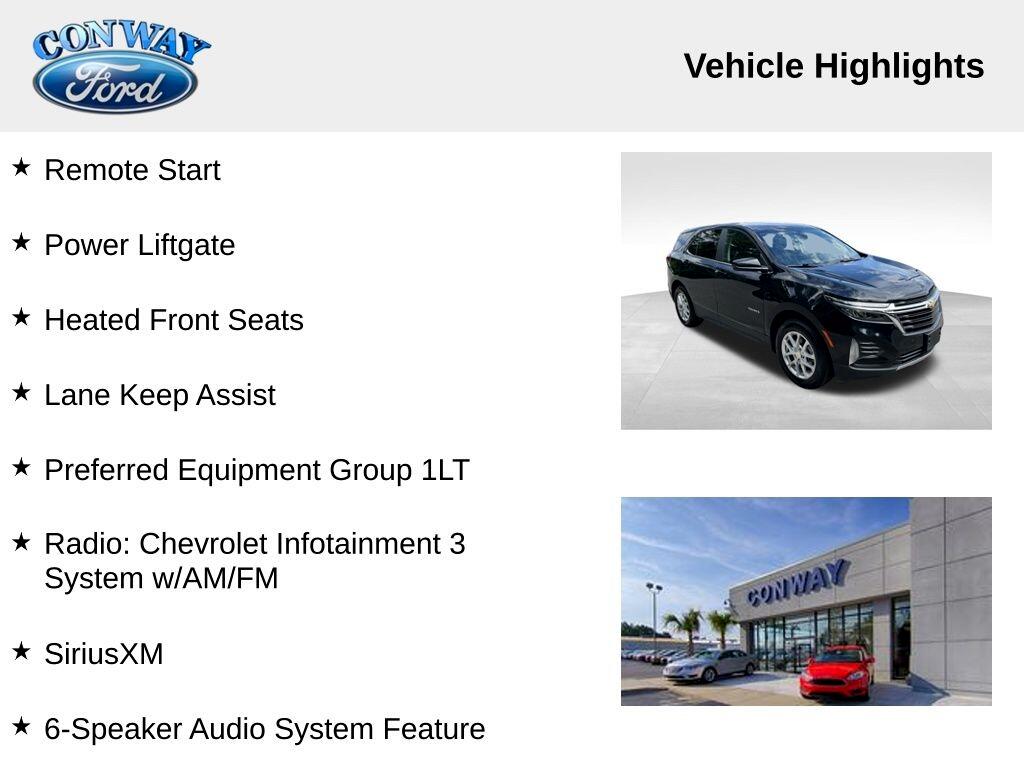 **ONE OWNER**, **BLUETOOTH HANDS FREE**, **BACK UP CAMERA**, **POWER DRIVER'S SEAT**, **BLIND SPOT MONITOR**, **BALANCE OF FACTORY WARRANTY**, **FULLY SERVICED AND DETAILED**, Apple Carplay-Android Auto, Remote Start, Power Liftgate, Heated Front Seats, Lane Keep Assist, Equinox LT All Wheel Drive, 4D Sport Utility, 1.5L DOHC, AWD, Mosaic Black Metallic, 17" Aluminum Wheels, 2 Rear USB Charging-Only Ports, 2 USB Ports & Auxiliary Input Jack, 4-Wheel Disc Brakes, 6-Speaker Audio System Feature, ABS brakes, Air Conditioning, Auto High-beam Headlights, Automatic temperature control, Bluetooth® For Phone, Brake assist, Bumpers: body-color, Compass, Cruise Control, Delay-off headlights, Driver 8-Way Power Seat Adjuster, Driver door bin, Dual front impact airbags, Dual front side impact airbags, Dual Zone Auto A/C, Electronic Stability Control, Four wheel independent suspension, Front Bucket Seats, Front Passenger 4-Way Manual Seat Adjuster, Front reading lights, Fully automatic headlights, Heated door mirrors, Heated Driver & Front Passenger Seats, Low tire pressure warning, Outside temperature display, Panic alarm, Passenger door bin, Power door mirrors, Power driver seat, Power Liftgate, Power windows, Preferred Equipment Group 1LT, Radio data system, Radio: Chevrolet Infotainment 3 System w/AM/FM, Rear window defroster, Rear window wiper, Remote keyless entry, SiriusXM, Spoiler, Steering wheel mounted audio controls, Tachometer, Telescoping steering wheel, Traction control, Trip computer, Variably intermittent wipers.