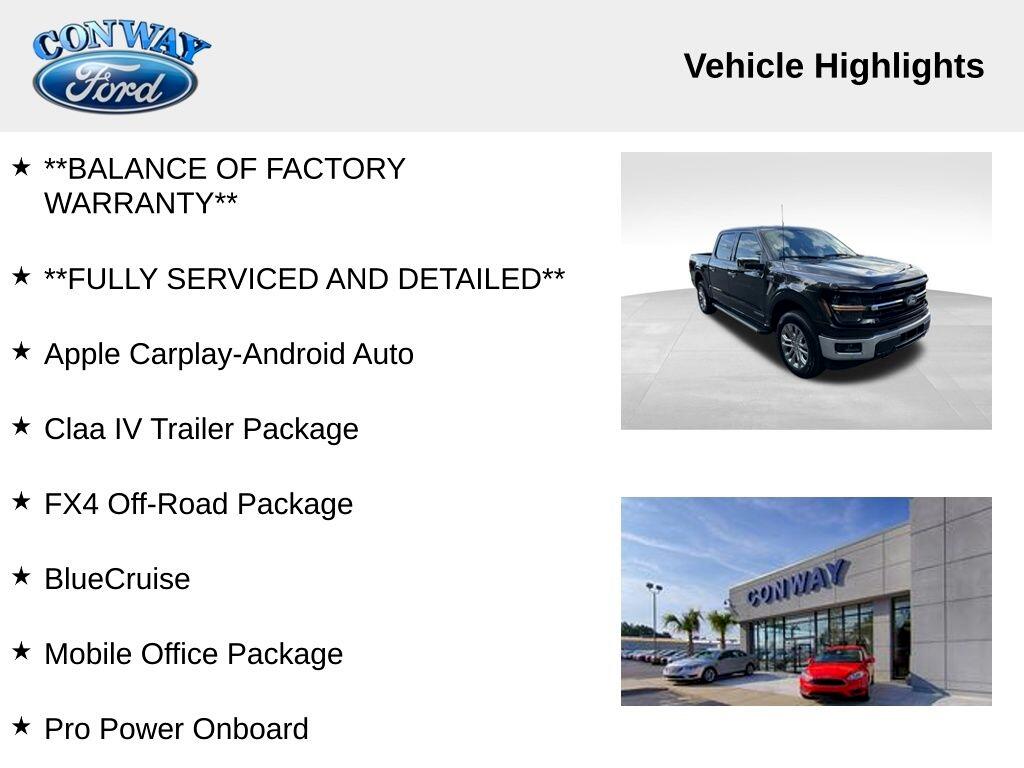 **ONE OWNER**, **NO ACCIDENTS NO ISSUES**, **BLUETOOTH HANDS FREE**, **BACK UP CAMERA**, **POWER DRIVER'S SEAT**, **POWER PASSENGER SEAT**, **BLIND SPOT MONITOR**, **LOCAL TRADE IN**, **BALANCE OF FACTORY WARRANTY**, **FULLY SERVICED AND DETAILED**, Apple Carplay-Android Auto, Claa IV Trailer Package, FX4 Off-Road Package, BlueCruise, Mobile Office Package, Pro Power Onboard, Lane Keep Assist, FordPass Connect, Back Up Sensors, F-150 XLT, 4D SuperCrew, 3.5L PowerBoost Full-Hybrid V6, 4WD, Black W/Smoked Truffle Cloth, 4 Pickup Box Tie-Down Plates, 4-Wheel Disc Brakes, 400W Cab & Bed Outlets, 4x4 FX4 Off-Road Bodyside Decal, ABS brakes, Adaptive Cruise Control w/Stop & Go, Air Conditioning, AM/FM radio: SiriusXM with 360L, Auto High-beam Headlights, Auto-Dimming Rear-View Mirror, Automatic temperature control, Bed Utility Package, Brake assist, Bumpers: chrome, Cloth 40/Console/40 Front Seat, Cloth 40/Console/40 Front Seats, Compass, Console Worksurface, Delay-off headlights, Driver door bin, Driver vanity mirror, Dual front impact airbags, Dual front side impact airbags, Dual Zone Auto A/C, Electronic Locking w/3.73 Axle Ratio, Electronic Stability Control, Equipment Group 302A Mid, Ford BlueCruise Equipped (90-Day Trial), Front fog lights, Front reading lights, Front wheel independent suspension, Fully automatic headlights, FX4 Off-Road Package, Heated door mirrors, Heated Front Seats, Hill Descent Control, Integrated Trailer Brake Controller, Intelligent Access w/Push Button Start, LED Box Lighting, Low tire pressure warning, Mobile Office Package, Monotube Rear Shocks, Off-Road Tuned Front Shock Absorbers, Outside temperature display, Panic alarm, Partitioned Lockable Rear Storage, Passenger door bin, Passenger vanity mirror, Power door mirrors, Power driver seat, Power Glass Heated Sideview Mirrors, Power windows, Power-Sliding Rear Window, Pro Power Onboard - 7.2KW, Radio data system, Radio: AM/FM SiriusXM w/360L, Rear step bumper, Rear window defroster, Remote keyless entry, Remote Start System w/Remote Tailgate Release, Rock Crawl Mode, Speed Sign Recognition, Steering wheel mounted audio controls, SYNC 4 w/Enhanced Voice Recognition, Tachometer, Tailgate Step w/Tailgate Work Surface, Telescoping steering wheel, Tough Bed Spray-In Bedliner, Tow/Haul Package, Tray Style Floor Liner, Trip computer, Variably intermittent wipers, Wheel Well Liner, Wheels: 20" Chrome-Like PVD.