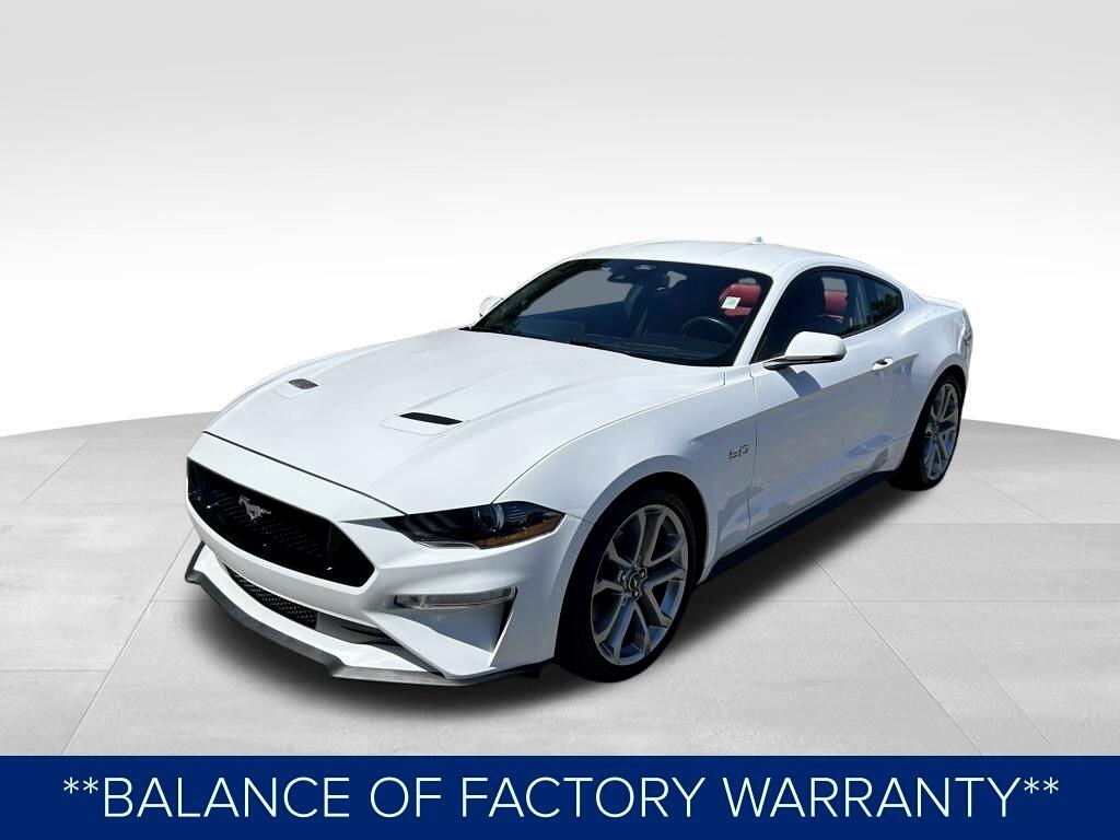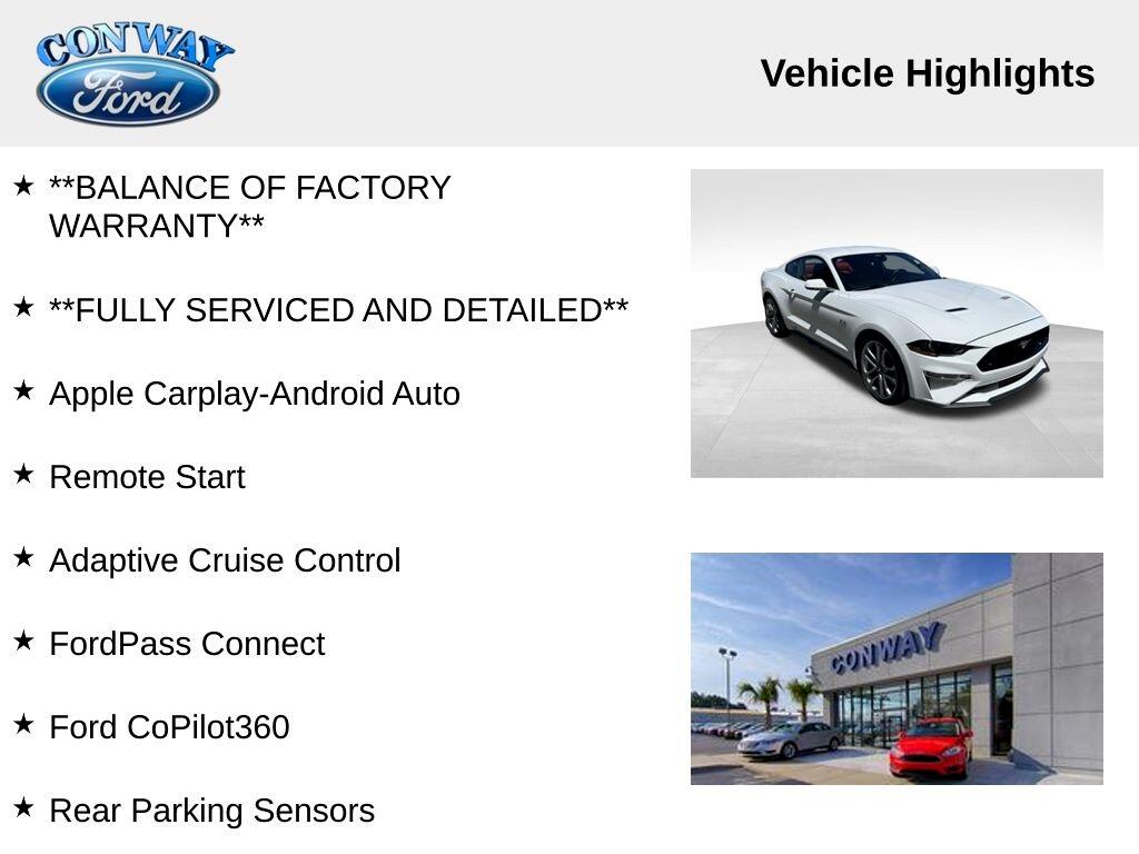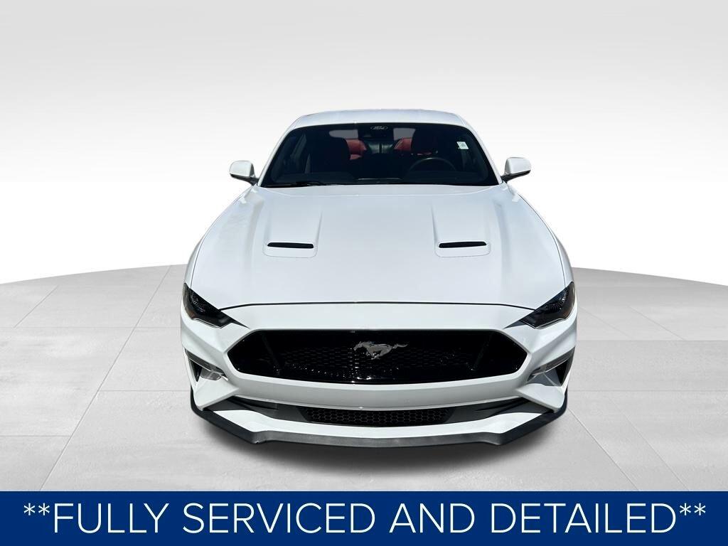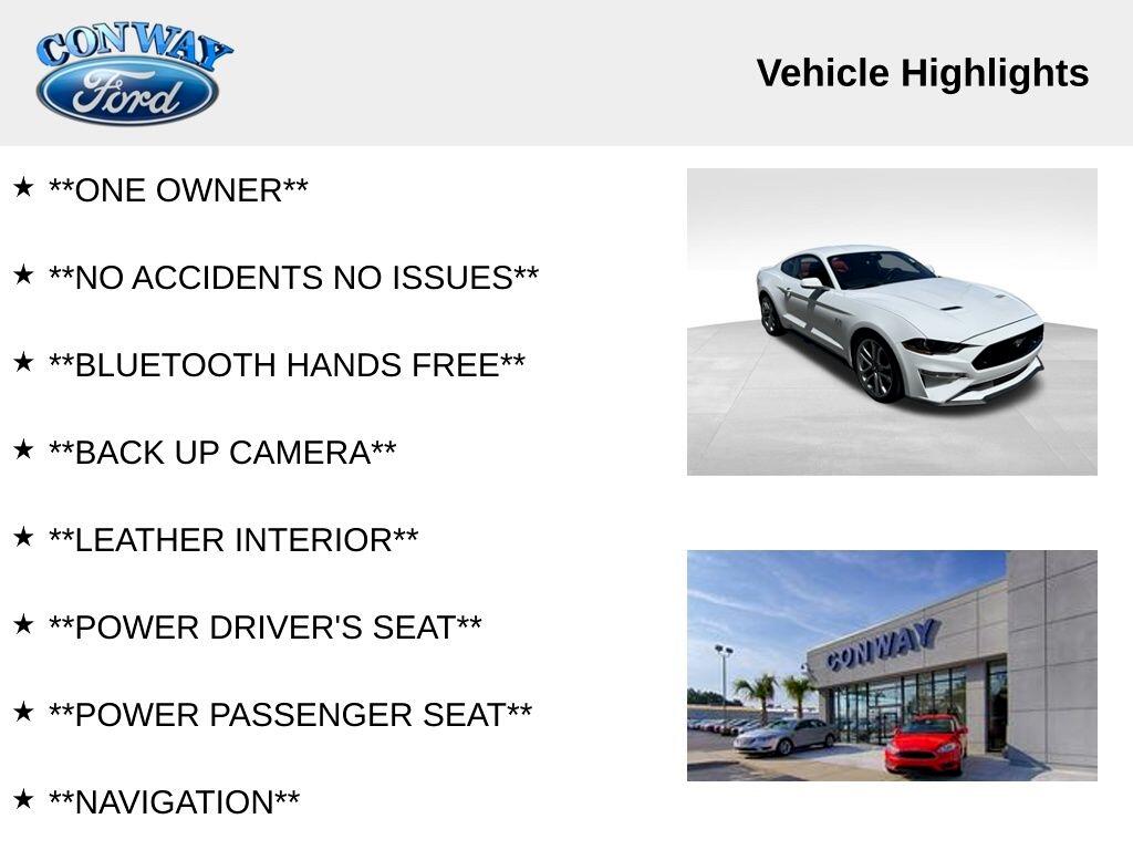**ONE OWNER**, **NO ACCIDENTS NO ISSUES**, **BLUETOOTH HANDS FREE**, **BACK UP CAMERA**, **LEATHER INTERIOR**, **POWER DRIVER'S SEAT**, **POWER PASSENGER SEAT**, **NAVIGATION**, **BALANCE OF FACTORY WARRANTY**, **FULLY SERVICED AND DETAILED**, Apple Carplay-Android Auto, Remote Start, Adaptive Cruise Control, FordPass Connect, Ford CoPilot360, Rear Parking Sensors, Track Apps, Rain Sensing Wipers, Mustang GT Premium, 2D Coupe, 5.0L V8 Ti-VCT, 10-Speed Automatic, Oxford White, Showstopper Red Leather, 12" LCD Digital Instrument Cluster w/MyColor, 20" Wheels, 3.15 Limited Slip Rear Axle Ratio, 4-Wheel Disc Brakes, ABS brakes, Adaptive Cruise Control, Air Conditioning, AM/FM Stereo, Auto High-beam Headlights, Automatic temperature control, Brake assist, Bumpers: body-color, Climate Controlled Heated/Cooled Front Seats, Compass, Delay-off headlights, Driver door bin, Driver vanity mirror, Dual front impact airbags, Dual front side impact airbags, Dual Zone Auto A/C, Electronic Stability Control, Equipment Group 401A, Exterior Parking Camera Rear, Ford Safe & Smart Package, Four wheel independent suspension, Front fog lights, Front reading lights, Fully automatic headlights, Heated Steering Wheel, Integrated Turn Signals, Knee airbag, Leather Shift Knob, Leather-Trimmed Bucket Seats, Leather-Trimmed Bucket Seats w/Color Accents, Low tire pressure warning, Memory Driver Seat, Mirrors & Ambient Lighting, Navigation System, Panic alarm, Passenger door bin, Passenger vanity mirror, Power door mirrors, Power driver seat, Power windows, Radio data system, Rain sensing wipers, Rear Parking Sensors, Rear window defroster, Remote keyless entry, SiriusXM Radio, Steering wheel mounted audio controls, SYNC 3 Communications & Entertainment System, Tachometer, Telescoping steering wheel, Trip computer, Variably intermittent wipers, Voice-Activated Touch-Screen Navigation System, Wheels: 20" x 9" Premium-Painted Aluminum.