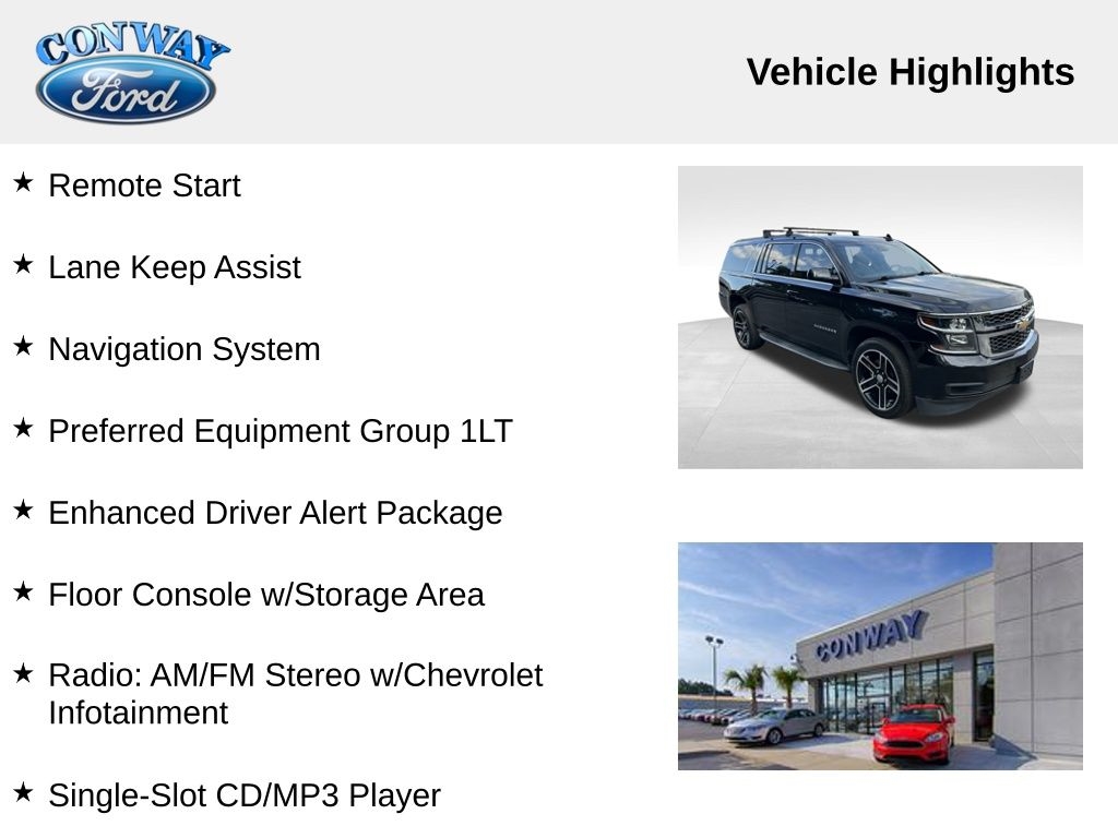 **BLUETOOTH HANDS FREE**, **BACK UP CAMERA**, **LEATHER INTERIOR**, **POWER DRIVER'S SEAT**, **POWER PASSENGER SEAT**, **NAVIGATION**, **FULLY SERVICED AND DETAILED**, Apple Carplay-Android Auto, Remote Start, Lane Keep Assist, Suburban LT, 4D Sport Utility, EcoTec3 5.3L V8, 6-Speed Automatic Electronic with Overdrive, 4WD, 12-Volt Auxiliary Power Outlet (5), 1st & 2nd Row Color-Keyed Carpeted Floor Mats, 2nd Row 60/40 Split-Folding Manual Bench, 3rd Row Manual 60/40 Split-Folding Fold Flat Bench, 4-Wheel Antilock Disc Brakes, 4-Wheel Disc Brakes, 6-Way Power Front Passenger Seat Adjuster, ABS brakes, Air Conditioning, AM/FM radio: SiriusXM, Apple CarPlay/Android Auto, Auto High-beam Headlights, Auto-Dimming Inside Rear-View Mirror, Automatic temperature control, Black Assist Steps, Bose Premium Audio System Feature, Brake assist, Bumpers: body-color, Color-Keyed Carpeting Floor Covering, Compass, Delay-off headlights, Driver door bin, Driver Inboard & Front Passenger Airbags, Driver vanity mirror, Dual front impact airbags, Dual front side impact airbags, Dual Zone Auto A/C, Electronic Cruise Control w/Set & Resume Speed, Electronic Stability Control, Enhanced Driver Alert Package, Extended-Range Remote Keyless Entry, Exterior Parking Camera Rear, Floor Console w/Storage Area, Forward Collision Alert, Front wheel independent suspension, HD Radio, Heated door mirrors, Heated Front Reclining Bucket Seats, IntelliBeam w/Automatic High Beam On/Off, Lane Keep Assist w/Lane Departure Warning, Leather-Appointed Seat Trim, Leather-Wrapped Steering Wheel, Low Speed Forward Automatic Braking, Low tire pressure warning, Memory Settings, Navigation System, Outside temperature display, Panic alarm, Passenger door bin, Power door mirrors, Power driver seat, Power Liftgate, Power passenger seat, Power windows, Power-Adjustable Accelerator & Brake Pedals, Preferred Equipment Group 1LT, Radio: AM/FM Stereo w/Chevrolet Infotainment, Rear air conditioning, Rear Park Assist w/Audible Warning, Rear reading lights, Rear window defroster, Rear window wiper, Remote keyless entry, Remote Vehicle Start, Roof-Mounted Luggage Rack Side Rails, Safety Alert Seat, Single-Slot CD/MP3 Player, SiriusXM Radio, Spoiler, Steering wheel mounted audio controls, Tachometer, Telescoping steering wheel, Traction control, Trip computer, Universal Home Remote, Variably intermittent wipers.