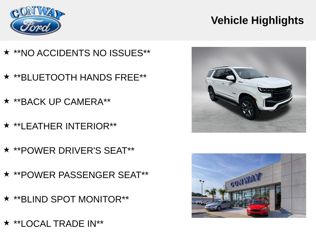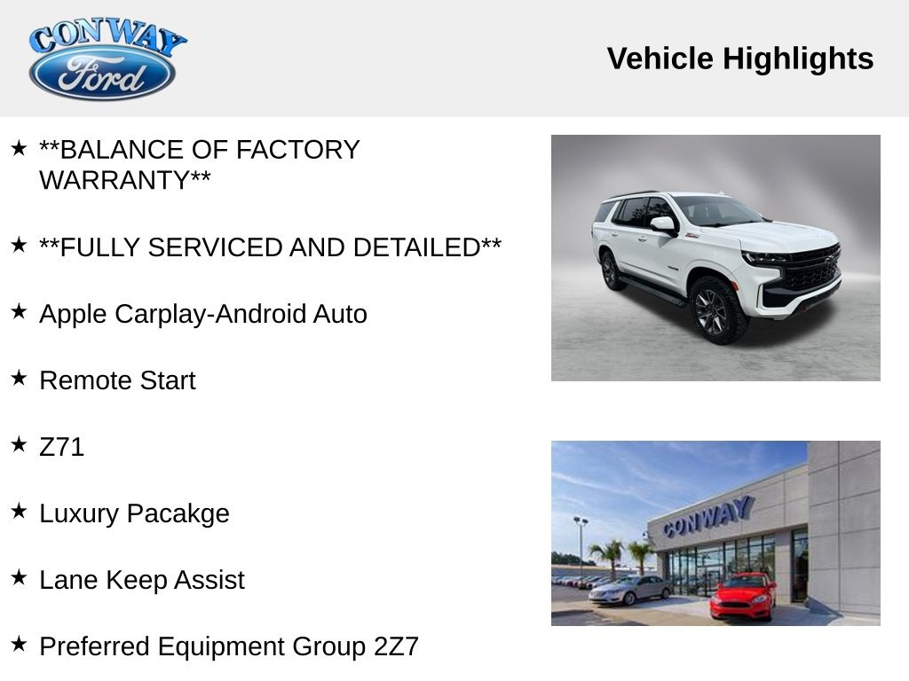 **NO ACCIDENTS NO ISSUES**, **BLUETOOTH HANDS FREE**, **BACK UP CAMERA**, **LEATHER INTERIOR**, **POWER DRIVER'S SEAT**, **POWER PASSENGER SEAT**, **BLIND SPOT MONITOR**, **LOCAL TRADE IN**, **BALANCE OF FACTORY WARRANTY**, **FULLY SERVICED AND DETAILED**, Apple Carplay-Android Auto, Remote Start, Z71, Luxury Pacakge, Lane Keep Assist, Tahoe Z71, 4D Sport Utility, EcoTec3 5.3L V8, 10-Speed Automatic with Overdrive, 4WD, Summit White, 1st & 2nd Row Color-Keyed Carpeted Floor Mats, 2-Speed Active Electronic AutoTrac Transfer Case, 2nd Row Pwr Release 60/40 Split-Folding Bench Seat, 3rd Row 60/40 Power-Folding Split-Bench Seat, 4-Wheel Disc Brakes, ABS brakes, Air Conditioning, Apple CarPlay/Android Auto, Auto High-beam Headlights, Auto-Dimming Inside Rear-View Mirror, Automatic temperature control, Black Tubular Assist Steps, Bose 9-Speaker Stereo Audio System Feature, Brake assist, Bright Front & Rear Door Sill Plates, Bumpers: body-color, Color-Keyed Carpeting Floor Covering, Compass, Cruise Control, Delay-off headlights, Driver & Front Outboard Passenger Airbags, Driver Alert Package, Driver door bin, Driver vanity mirror, Dual front impact airbags, Dual front side impact airbags, Dual Zone Auto A/C, Electronic Stability Control, Enhanced Driver Information Center, Floor Console w/Storage Area, Four wheel independent suspension, Front High-Approach Angle Fascia, Front reading lights, Fully automatic headlights, Garage door transmitter, Hands-Free Rear Power Programmable Liftgate, HD Surround Vision, Heated 2nd Row Outboard Seats, Heated door mirrors, Heated Driver & Front Passenger Seats, Heated Steering Wheel, Hill Descent Control, Infotainment Display, Lane Change Alert w/Side Blind Zone Alert, Leather-Appointed Seat Trim, LED Daytime Running Lamps, Low tire pressure warning, Luxury Package, Memory Settings, Memory Settings for Driver, Outside Heated Power-Adjustable Mirrors, Outside temperature display, Panic alarm, Passenger door bin, Passenger vanity mirror, Power door mirrors, Power driver seat, Power Folding 3rd row seats: split-bench, Power Liftgate, Power Release 2nd Row Bucket Seats, Power Tilt & Telescopic Steering Column, Power windows, Preferred Equipment Group 2Z7, Radio: Chevrolet Infotainment 3 Premium System, Rear air conditioning, Rear Cross Traffic Alert, Rear Pedestrian Alert, Rear reading lights, Rear window defroster, Rear window wiper, Red Horizontal-Mounted Recovery Hooks, Remote keyless entry, Remote Start, SiriusXM Radio w/360L, Spoiler, Steering wheel mounted audio controls, Tachometer, Telescoping steering wheel, Traction control, Trip computer, Universal Home Remote, Variably intermittent wipers, Wheels: 20" x 9" Machined Aluminum, Wireless Charging, Wrapped Steering Wheel. Priced below KBB Fair Purchase Price!