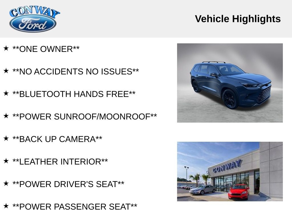**ONE OWNER**, **NO ACCIDENTS NO ISSUES**, **BLUETOOTH HANDS FREE**, **POWER SUNROOF/MOONROOF**, **BACK UP CAMERA**, **LEATHER INTERIOR**, **POWER DRIVER'S SEAT**, **POWER PASSENGER SEAT**, **BLIND SPOT MONITOR**, **LOCAL TRADE IN**, **BALANCE OF FACTORY WARRANTY**, **FULLY SERVICED AND DETAILED**, Apple Carplay-Android Auto, JBL Sound w/11 Speakers, Heated and Cooled Front Seats-Heated 2nd Row, Panoramic View Camera, Panoramic Sunroof, Rain Sensing Wipers, Grand Highlander Limited XP Package, 4D Sport Utility, 2.4L 4-Cylinder, FWD, Storm Cloud, Black w/Leather Seat Trim, 11 Speakers, 20" Premium Painted Wheels, 4-Wheel Disc Brakes, ABS brakes, Adaptive Cruise Control, Air Conditioning, AM/FM radio: SiriusXM, Apple CarPlay/Android Auto, Auto High-beam Headlights, Automatic temperature control, Brake assist, Bumpers: body-color, Delay-off headlights, Driver door bin, Driver vanity mirror, Dual front impact airbags, Dual front side impact airbags, Dual Zone Auto A/C, Electronic Stability Control, Exterior Parking Camera Rear, Four wheel independent suspension, Front fog lights, Front reading lights, Fully automatic headlights, Garage door transmitter: HomeLink, Heated door mirrors, Heated Rear Seats, Heated Seats, Heated steering wheel, Illuminated entry, Knee airbag, Leather Shift Knob, Leather steering wheel, Low tire pressure warning, Memory seat, Outside temperature display, Panic alarm, Panoramic Roof, Passenger door bin, Passenger vanity mirror, Power door mirrors, Power driver seat, Power Folding 3rd row seats: split-bench, Power Liftgate, Power passenger seat, Power windows, Rain sensing wipers, Rear air conditioning, Rear reading lights, Rear window defroster, Remote keyless entry, Spoiler, Steering wheel mounted audio controls, Tachometer, Telescoping steering wheel, Traction control, Trip computer, Turn signal indicator mirrors, Variably intermittent wipers. Priced below KBB Fair Purchase Price!
