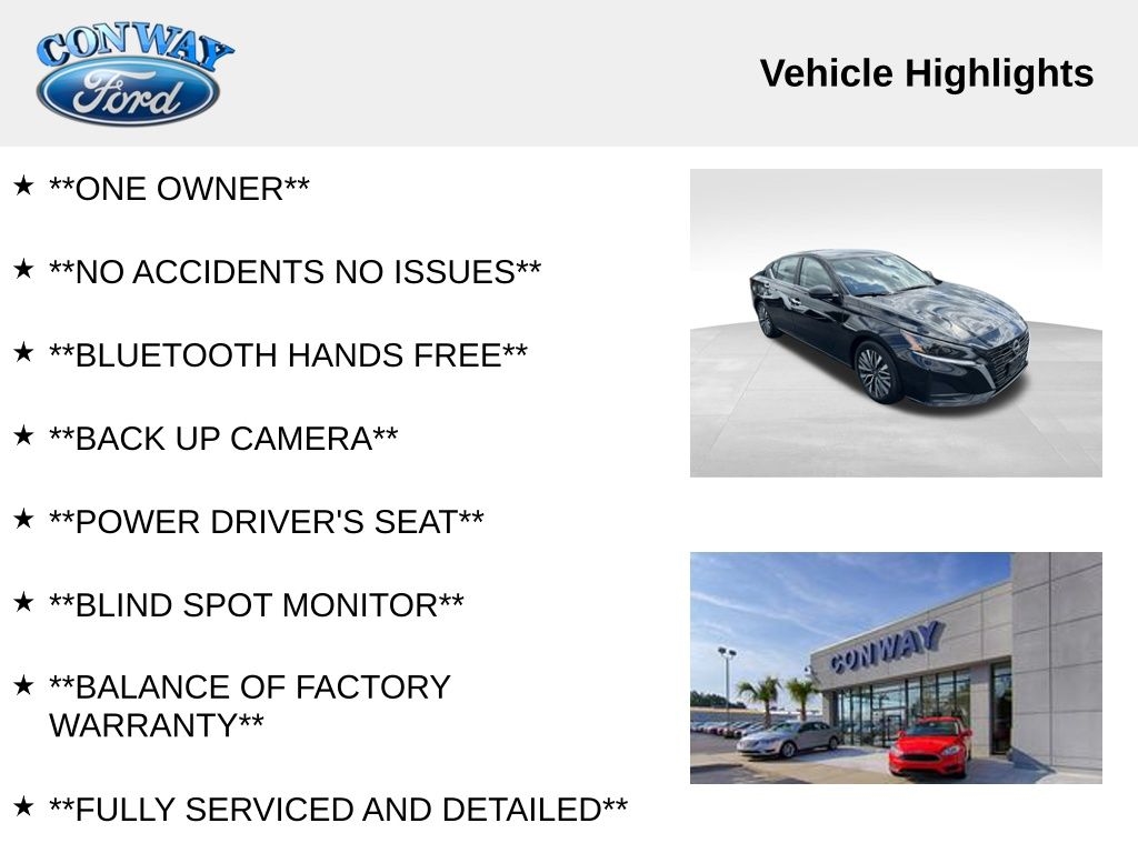 **ONE OWNER**, **NO ACCIDENTS NO ISSUES**, **BLUETOOTH HANDS FREE**, **BACK UP CAMERA**, **POWER DRIVER'S SEAT**, **BLIND SPOT MONITOR**, **BALANCE OF FACTORY WARRANTY**, **FULLY SERVICED AND DETAILED**, Apple Carplay-Android Auto, Remote Start, Back Up Sensors, Lane Departure Warning, Altima 2.5 SV, 4D Sedan, 2.5L 4-Cylinder DOHC 16V, FWD, Super Black Clearcoat, 17" Alloy Wheels, 4-Wheel Disc Brakes, ABS brakes, Air Conditioning, AM/FM radio: SiriusXM, Auto High-beam Headlights, Blind Spot Warning, Brake assist, Bumpers: body-color, Cloth Seat Trim, Cruise Control, Delay-off headlights, Driver door bin, Driver vanity mirror, Dual front impact airbags, Dual front side impact airbags, Electronic Stability Control, Four wheel independent suspension, Front Bucket Seats, Front reading lights, Fully automatic headlights, Knee airbag, Low tire pressure warning, NissanConnect featuring Apple CarPlay, Panic alarm, Passenger door bin, Power door mirrors, Power driver seat, Power windows, Radio data system, Radio: AM/FM Audio System, Rear Parking Sensors, Rear window defroster, Remote keyless entry, Steering wheel mounted audio controls, Tachometer, Telescoping steering wheel, Variably intermittent wipers. Priced below KBB Fair Purchase Price!