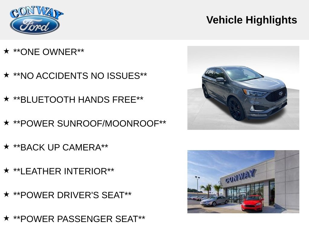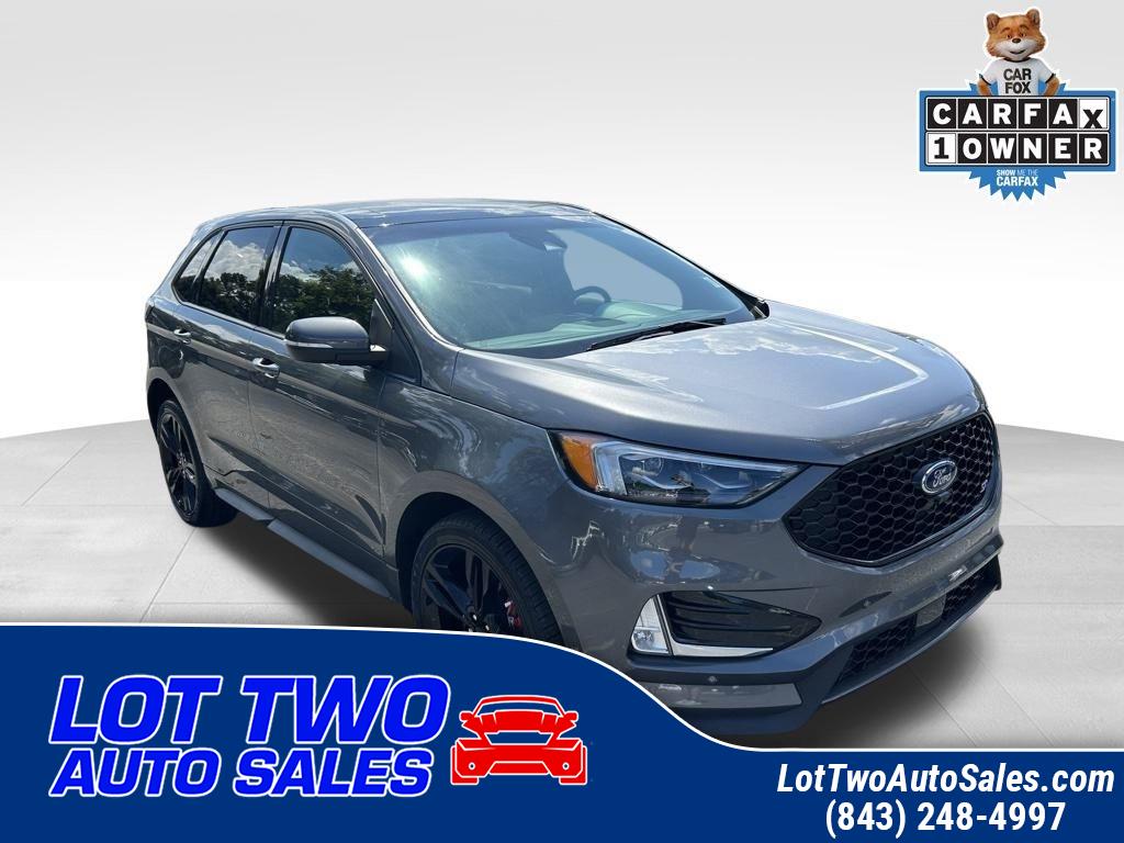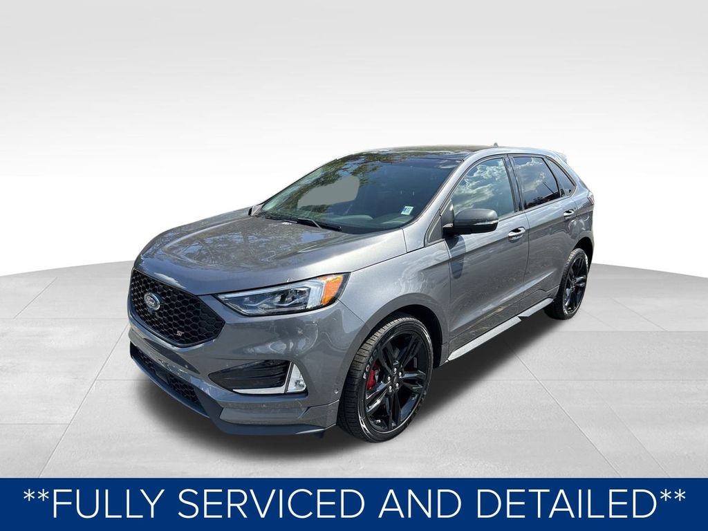 **ONE OWNER**, **NO ACCIDENTS NO ISSUES**, **BLUETOOTH HANDS FREE**, **POWER SUNROOF/MOONROOF**, **BACK UP CAMERA**, **LEATHER INTERIOR**, **POWER DRIVER'S SEAT**, **POWER PASSENGER SEAT**, **NAVIGATION**, **BALANCE OF FACTORY WARRANTY**, **FULLY SERVICED AND DETAILED**, Apple Carplay-Android Auto, Remote Start, ST Performance Brake System, Panoramic Sunroof, Adaptive Cruise Control, Evasive Steering Assist, Heated and Cooled Seats, Back Up Sensors, Ford CoPilot 360, FordPass Connect, Ford Performance Tuned Suspension, Edge ST, 4D Sport Utility, 2.7L V6 EcoBoost, AWD, Carbonized Gray Metallic, Black Leather, 110V/150W AC Power Outlet, 4-Wheel Disc Brakes, ABS brakes, Adaptive Cruise Control w/Stop & Go, Adaptive LED Headlamps, Auto High-beam Headlights, Auto-Dimming Driver's Sideview Mirror, Brake assist, Brushless Radiator Cooling Fan, Bumpers: body-color, Compass, Connected Built-In Navigation, Cooled Front Seats, Delay-off headlights, Driver door bin, Driver vanity mirror, Dual front impact airbags, Dual front side impact airbags, Electronic Stability Control, Enhanced Active Park Assist, Equipment Group 401A, Evasive Steering Assist, Foot Activated Hands-Free Liftgate, FordPass Connect, Four wheel independent suspension, Front & Rear Vented Disc Brakes, Front 180-Degree Camera w/Split View, Front Bucket Seats, Front fog lights, Front reading lights, Fully automatic headlights, Heated door mirrors, Heated Rear Seats, Heated Seats, Heated Steering Wheel, Illuminated entry, Knee airbag, Lane Centering, Leather-Trimmed Heated ST Bolstered Bucket Seats, Low tire pressure warning, Memory seat, Navigation System, Outside temperature display, Painted Colorado Red Brake Calipers, Panic alarm, Panoramic Vista Roof, Passenger door bin, Passenger vanity mirror, Performance Brake Pads, Perimeter Alarm, Power door mirrors, Power driver seat, Power Liftgate, Power passenger seat, Power Tilt/Telescoping Steering Column w/Memory, Power windows, Rain sensing wipers, Rear Parking Sensors, Rear reading lights, Rear window wiper, Remote keyless entry, Remote Start System, Spoiler, ST Performance Brake Package, Steering wheel mounted audio controls, Tachometer, Telescoping steering wheel, Traction control, Trip computer, Universal Garage Door Opener (UGDO), Wheels: 21" Premium Gloss Black-Painted Alum w/66P, Wireless Charging Pad.