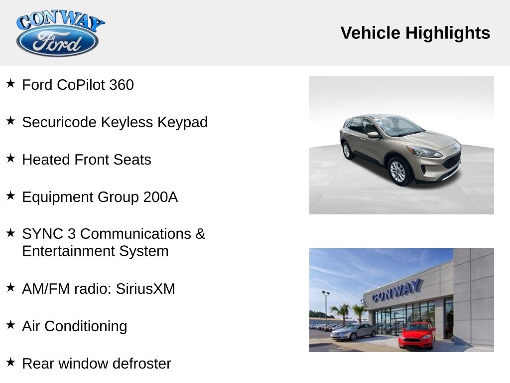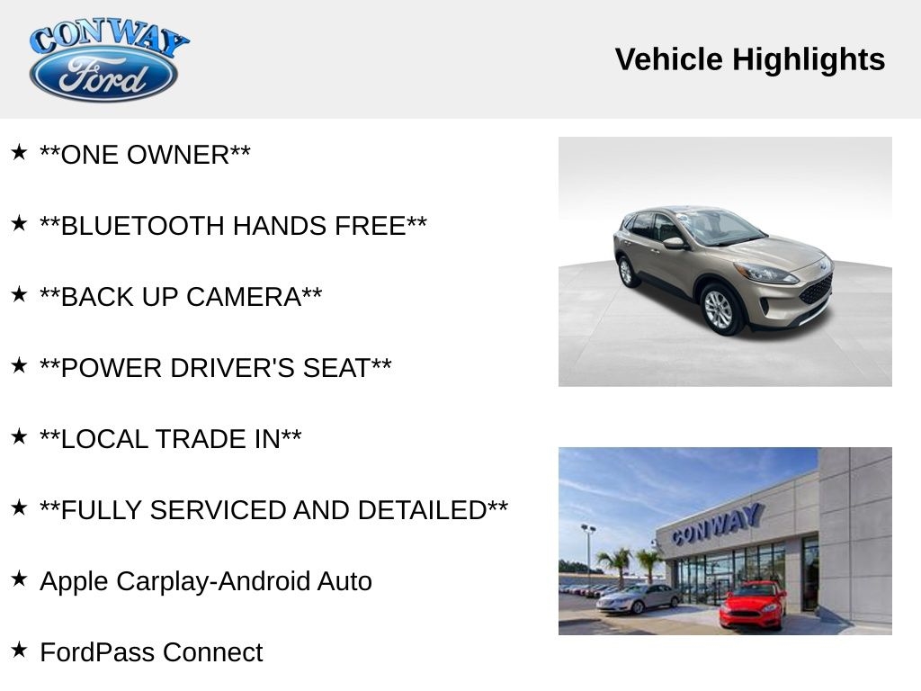 **ONE OWNER**, **BLUETOOTH HANDS FREE**, **BACK UP CAMERA**, **POWER DRIVER'S SEAT**, **LOCAL TRADE IN**, **FULLY SERVICED AND DETAILED**, Apple Carplay-Android Auto, FordPass Connect, Ford CoPilot 360, Securicode Keyless Keypad, Heated Front Seats, Escape SE, 4D Sport Utility, 1.5L EcoBoost, Desert Gold Metallic, Sandstone w/Heated Unique Cloth Front Bucket Seats, 4-Wheel Disc Brakes, ABS brakes, Air Conditioning, AM/FM radio: SiriusXM, Auto High-beam Headlights, Automatic temperature control, Brake assist, Bumpers: body-color, Compass, Cruise Control, Delay-off headlights, Driver door bin, Driver vanity mirror, Dual front impact airbags, Dual front side impact airbags, Electronic Stability Control, Equipment Group 200A, Exterior Parking Camera Rear, FordPass Connect, Four wheel independent suspension, Front Bucket Seats, Front reading lights, Heated door mirrors, Heated Seats, Heated Unique Cloth Front Bucket Seats, Knee airbag, Low tire pressure warning, Outside temperature display, Panic alarm, Passenger door bin, Passenger vanity mirror, Power door mirrors, Power driver seat, Power windows, Rear window defroster, Rear window wiper, Remote keyless entry, Steering wheel mounted audio controls, SYNC 3 Communications & Entertainment System, Tachometer, Telescoping steering wheel, Trip computer, Variably intermittent wipers, Wheels: 17" Shadow Silver-Painted Aluminum.