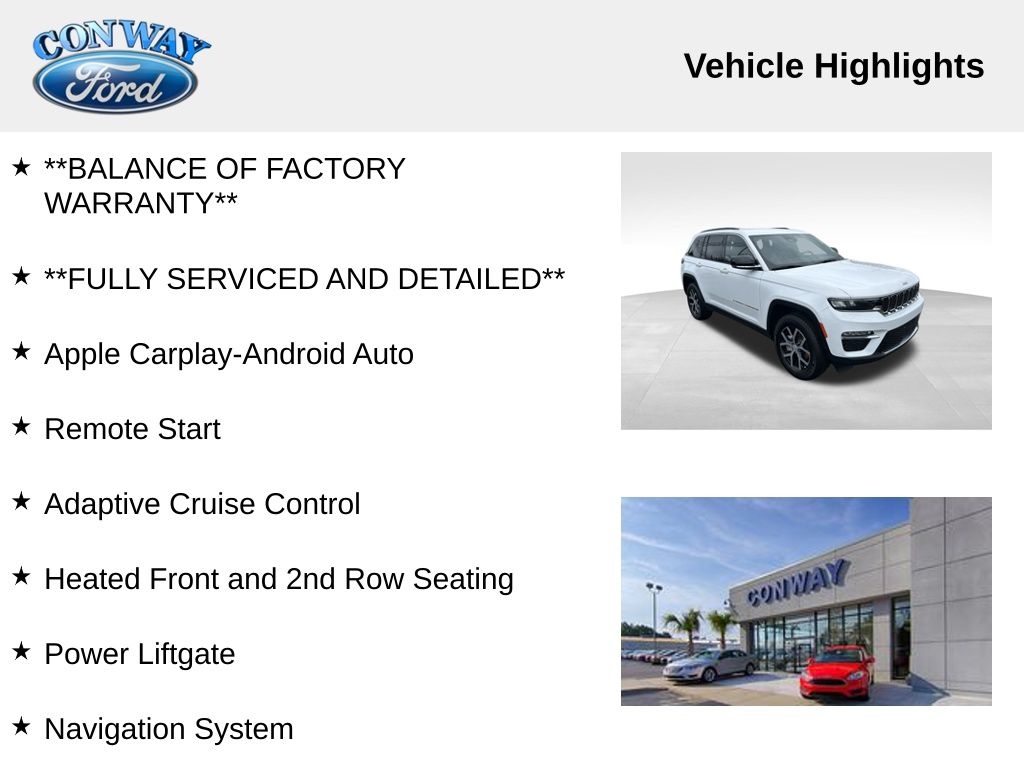 **NO ACCIDENTS NO ISSUES**, **BLUETOOTH HANDS FREE**, **BACK UP CAMERA**, **LEATHER INTERIOR**, **POWER DRIVER'S SEAT**, **POWER PASSENGER SEAT**, **BLIND SPOT MONITOR**, **NAVIGATION**, **BALANCE OF FACTORY WARRANTY**, **FULLY SERVICED AND DETAILED**, Apple Carplay-Android Auto, Remote Start, Adaptive Cruise Control, Heated Front and 2nd Row Seating, Power Liftgate, Grand Cherokee Limited, 4D Sport Utility, 3.6L V6 24V VVT, 4WD, Bright White Clearcoat, Global Black Artificial Leather, 4-Wheel Disc Brakes, ABS brakes, Adaptive Cruise Control, Air Conditioning, AM/FM radio: SiriusXM with 360L, Auto High-beam Headlights, Automatic temperature control, Brake assist, Bumpers: body-color, Capri Leatherette Seats, Compass, Delay-off headlights, Driver door bin, Driver vanity mirror, Dual front impact airbags, Dual front side impact airbags, Dual Zone Auto A/C, Electronic Stability Control, Four wheel independent suspension, Front Bucket Seats, Front reading lights, Garage door transmitter, Heated door mirrors, Heated Rear Seats, Heated Seats, Heated steering wheel, Knee airbag, Low tire pressure warning, Memory seat, Navigation System, Outside temperature display, Panic alarm, ParkView Rear Back-Up Camera, Passenger door bin, Passenger vanity mirror, Power door mirrors, Power driver seat, Power Liftgate, Power passenger seat, Power windows, Quick Order Package 23E, Radio data system, Radio: Uconnect 5 Nav w/10.1" Display, Rear reading lights, Rear window defroster, Rear window wiper, Remote keyless entry, Spoiler, Steering wheel mounted audio controls, Tachometer, Telescoping steering wheel, Traction control, Trip computer, Variably intermittent wipers, Wheels: 18" x 8" Polished/Painted Aluminum.