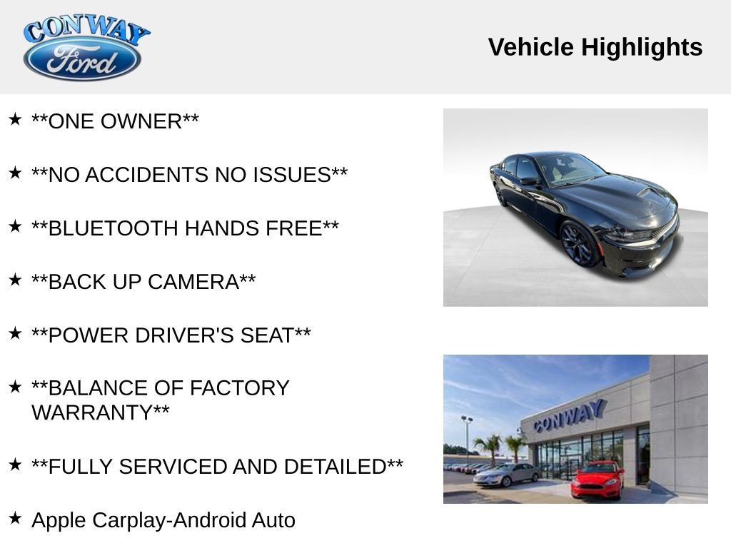 **ONE OWNER**, **NO ACCIDENTS NO ISSUES**, **BLUETOOTH HANDS FREE**, **BACK UP CAMERA**, **POWER DRIVER'S SEAT**, **BALANCE OF FACTORY WARRANTY**, **FULLY SERVICED AND DETAILED**, Apple Carplay-Android Auto, Remote Start, Blacktop Package, Rear Park Assist, Charger GT Blacktop, 4D Sedan, 3.6L V6 24V VVT, Pitch Black Clearcoat, Black Cloth, 4-Wheel Disc Brakes, 4G LTE Wi-Fi Hot Spot, 8.4" Touchscreen Display, ABS brakes, Air Conditioning, AM/FM radio: SiriusXM, Apple CarPlay/Android Auto, Automatic temperature control, Black 1-Piece Performance Spoiler, Black Badge, Black Dodge Grille Badge, Blacktop Package, Brake assist, Bumpers: body-color, Compass, Cruise Control, Delay-off headlights, Driver door bin, Driver vanity mirror, Dual front impact airbags, Dual front side impact airbags, Dual Zone Auto A/C, Electronic Stability Control, Four wheel independent suspension, Front Bucket Seats, Front reading lights, Fully automatic headlights, Gloss Black I/P Cluster Trim Rings, HD Radio, Heated door mirrors, Knee airbag, Leather Shift Knob, Low tire pressure warning, Outside temperature display, Panic alarm, ParkView Rear Back-Up Camera, Passenger door bin, Passenger vanity mirror, Power 2-Way Driver Lumbar Adjust, Power 8-Way Driver Seat, Power door mirrors, Power windows, Quick Order Package 2EH, Radio: Uconnect 4C w/8.4" Display, Rear window defroster, Remote keyless entry, Rhombi 2-Pc Wheel Center Cap, Satin Black Charger Decklid Badge, Satin Black Dodge Tail Lamp Badge, Spoiler, Steering wheel mounted audio controls, Tachometer, Telescoping steering wheel, Traction control, Trip computer, Variably intermittent wipers, Wheels: 20" x 8" Black Noise Painted.