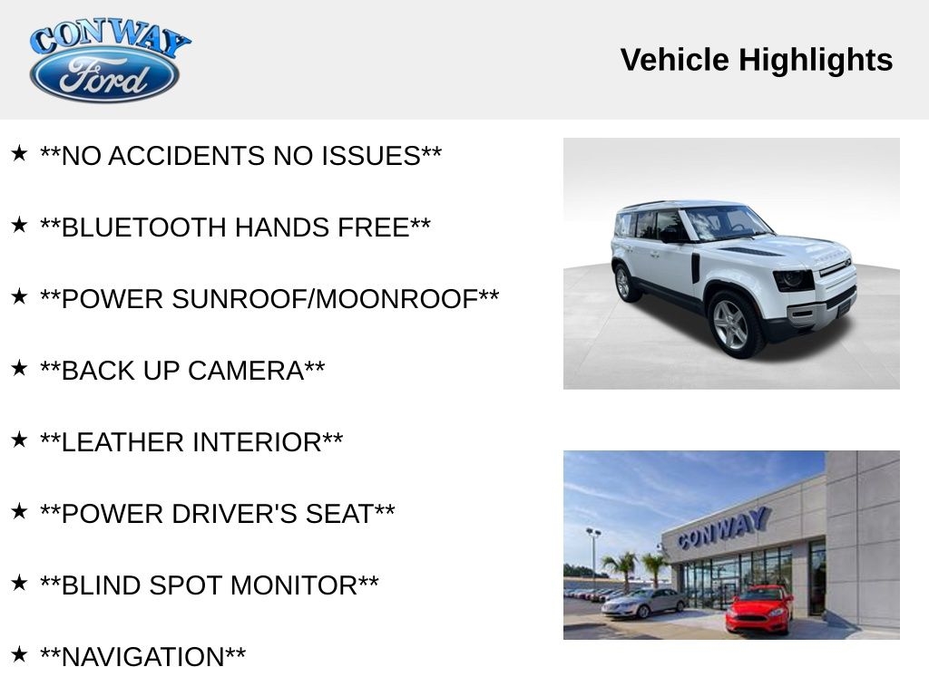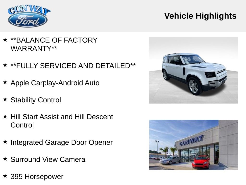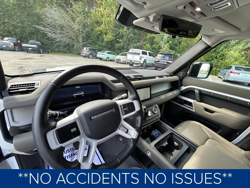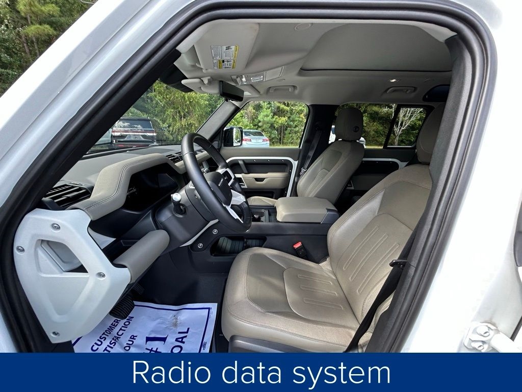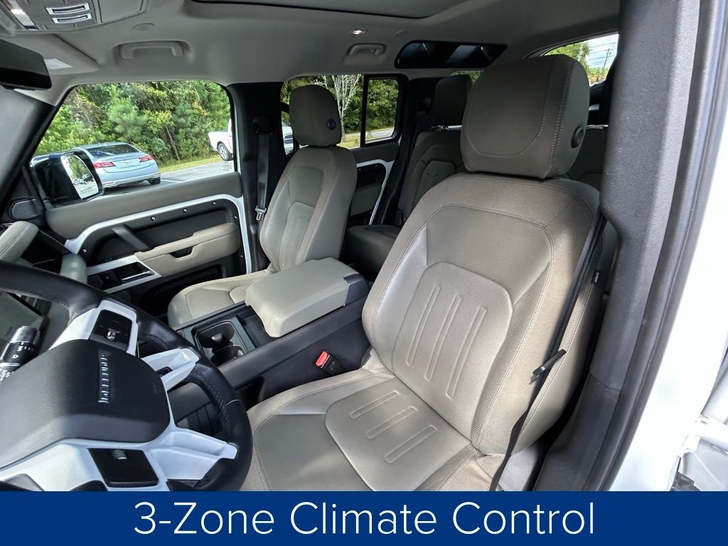 **NO ACCIDENTS NO ISSUES**, **BLUETOOTH HANDS FREE**, **POWER SUNROOF/MOONROOF**, **BACK UP CAMERA**, **LEATHER INTERIOR**, **POWER DRIVER'S SEAT**, **BLIND SPOT MONITOR**, **NAVIGATION**, **BALANCE OF FACTORY WARRANTY**, **FULLY SERVICED AND DETAILED**, Apple Carplay-Android Auto, Stability Control, Hill Start Assist and Hill Descent Control, Integrated Garage Door Opener, Surround View Camera, 395 Horsepower, Lane Keep Assist, Adaptive Cruise Control, Front and Rear Parking Sensors, Heated and Cooled Front Seats, Defender 110 SE, 4D Sport Utility, 3.0L I6, 4WD, Khaki w/Windsor Leather Seat Trim, 11 Speakers, 12-Way Heated Electric Memory Seats, 3-Zone Climate Control, 4-Wheel Disc Brakes, ABS brakes, Adaptive Cruise Control, Air Conditioning, Auto High-beam Headlights, Automatic temperature control, Brake assist, Bumpers: body-color, Compass, Cruise Control, Delay-off headlights, Driver Assist Pack, Driver door bin, Driver vanity mirror, Dual front impact airbags, Dual front side impact airbags, Electronic Stability Control, Four wheel independent suspension, Front Bucket Seats, Front fog lights, Front reading lights, Fully automatic headlights, Garage door transmitter: HomeLink, Grained Leather Seat Trim, Heated door mirrors, Leather Shift Knob, Leather steering wheel, Low tire pressure warning, Navigation system: Connected Navigation PIVI Pro, Opening Panoramic Sunroof, Outside temperature display, Panic alarm, Passenger door bin, Passenger vanity mirror, Power door mirrors, Power driver seat, Power passenger seat, Power windows, Radio data system, Radio: 400W 11 Speaker Meridian Sound System, Rear reading lights, Rear window defroster, Rear window wiper, Remote keyless entry, SiriusXM Satellite Radio & HD Radio, Steering wheel memory, Steering wheel mounted audio controls, Tachometer, Telescoping steering wheel, Traction control, Trip computer, Variably intermittent wipers. Priced below KBB Fair Purchase Price!