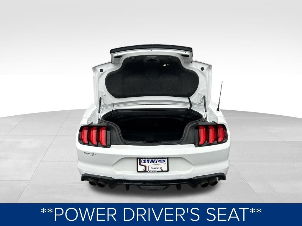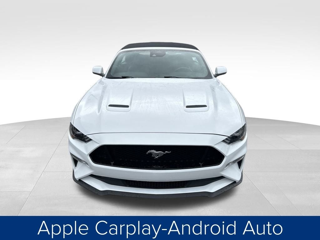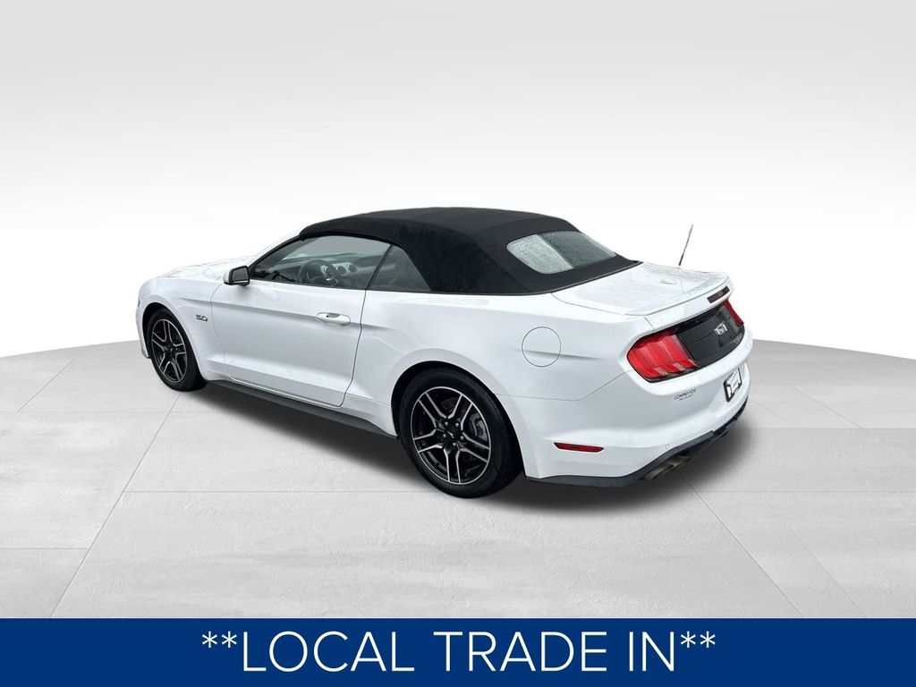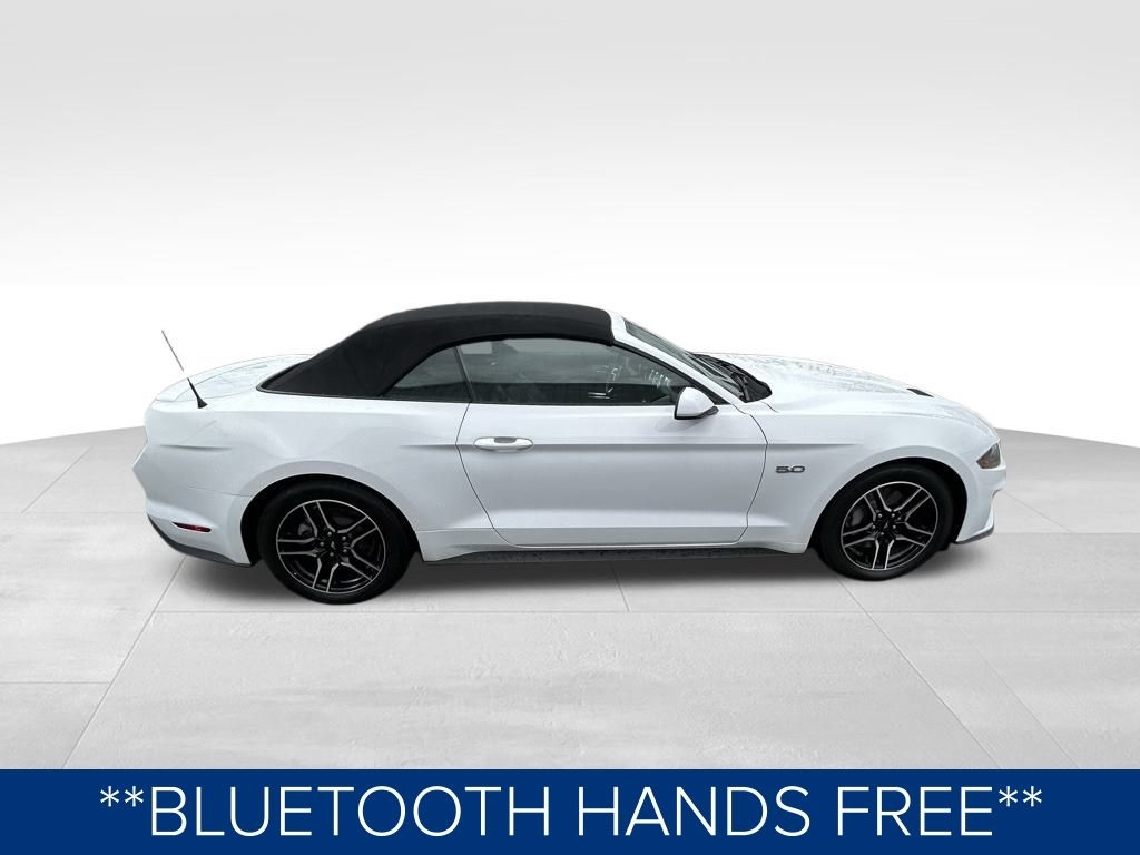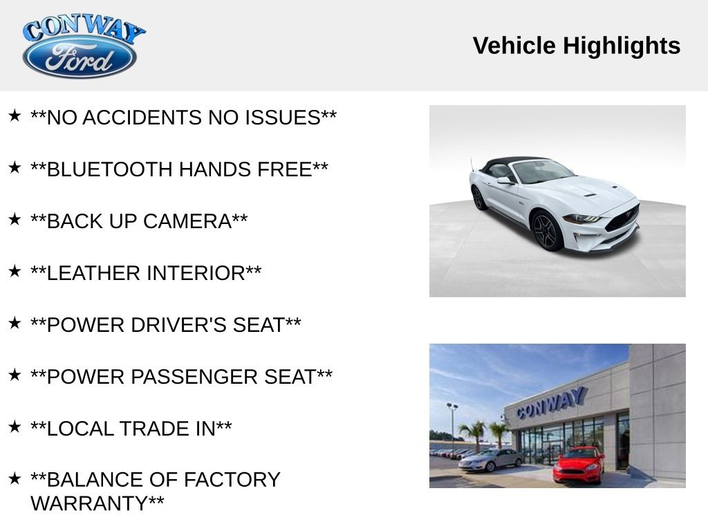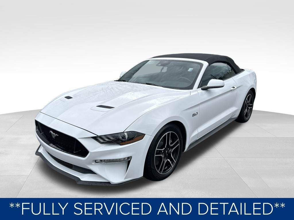 **NO ACCIDENTS NO ISSUES**, **BLUETOOTH HANDS FREE**, **BACK UP CAMERA**, **LEATHER INTERIOR**, **POWER DRIVER'S SEAT**, **POWER PASSENGER SEAT**, **LOCAL TRADE IN**, **BALANCE OF FACTORY WARRANTY**, **FULLY SERVICED AND DETAILED**, Apple Carplay-Android Auto, FordPass Connect, Ford CoPilot360, Rear Parking Sensors, Heated and Cooled Front Seats, Mustang GT Premium, 2D Convertible, 5.0L V8 Ti-VCT, Oxford White, Ebony w/Leather-Trimmed Bucket Seats, 3.15 Limited Slip Rear Axle Ratio, 4-Wheel Disc Brakes, ABS brakes, Air Conditioning, AM/FM radio: SiriusXM, Auto High-beam Headlights, Automatic temperature control, Brake assist, Bumpers: body-color, Climate Controlled Heated/Cooled Front Seats, Compass, Convertible roof lining, Cruise Control, Delay-off headlights, Driver door bin, Driver vanity mirror, Dual front impact airbags, Dual front side impact airbags, Dual Zone Auto A/C, Electronic Stability Control, Equipment Group 400A, Exterior Parking Camera Rear, Four wheel independent suspension, Front fog lights, Front reading lights, Fully automatic headlights, Garage door transmitter, Glass rear window, Heated door mirrors, Heated Seats, Knee airbag, Leather Shift Knob, Leather-Trimmed Bucket Seats, Low tire pressure warning, Outside temperature display, Passenger door bin, Passenger vanity mirror, Power convertible roof, Power door mirrors, Power driver seat, Power windows, Radio data system, Rain sensing wipers, Rear Parking Sensors, Rear window defroster, Remote keyless entry, SiriusXM Radio, Spoiler, Steering wheel mounted audio controls, SYNC 3 Communications & Entertainment System, Tachometer, Telescoping steering wheel, Traction control, Trip computer, Variably intermittent wipers, Wheels: 18" x 8" Machined-Face Aluminum.