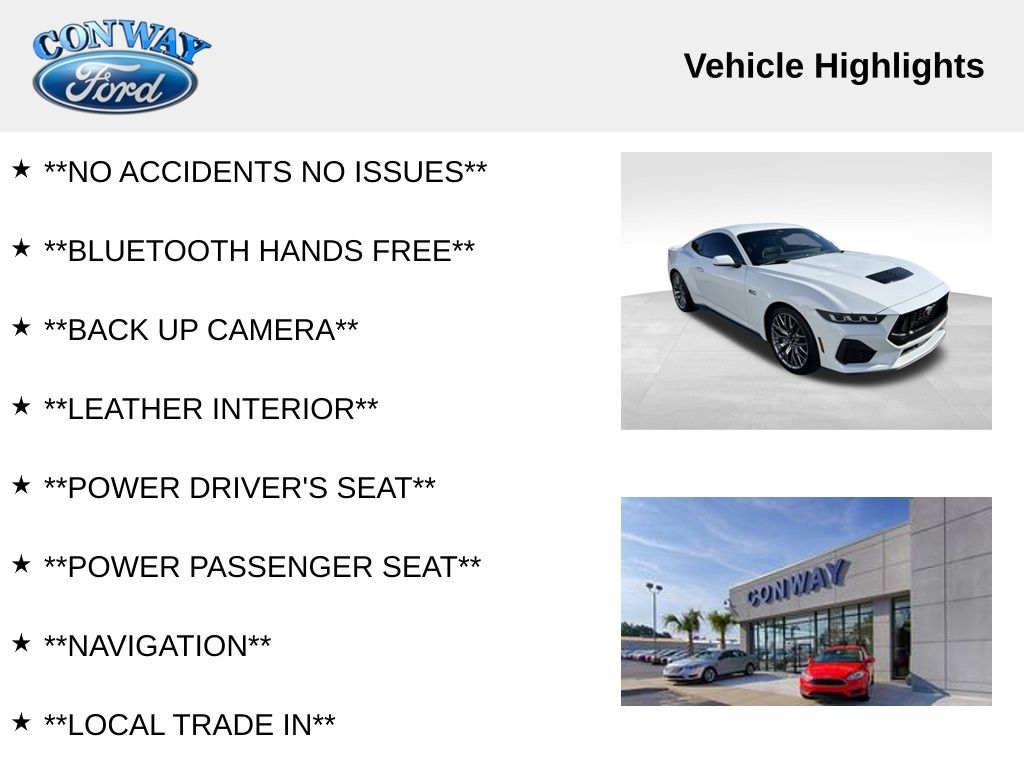 **NO ACCIDENTS NO ISSUES**, **BLUETOOTH HANDS FREE**, **BACK UP CAMERA**, **LEATHER INTERIOR**, **POWER DRIVER'S SEAT**, **POWER PASSENGER SEAT**, **NAVIGATION**, **LOCAL TRADE IN**, **BALANCE OF FACTORY WARRANTY**, **FULLY SERVICED AND DETAILED**, Apple Carplay-Android Auto, Remote Start, Ford CoPilot360 Assist+, FordPass Connect, Back Up Sensors, B&O 12 Speaker System, Heated and Cooled Front Leather Seats, Mustang GT Premium, 2D Coupe, 5.0L V8 Ti-VCT, 10-Speed Automatic, Oxford White, Black Onyx Leather, 3.55 Limited Slip Rear Axle, 4-Wheel Disc Brakes, ABS brakes, Air Conditioning, AM/FM Stereo, Auto High-beam Headlights, Automatic temperature control, B&O Sound System by Bang & Olufsen w/12 Speakers, Brake assist, Bumpers: body-color, Climate Controlled Heated/Cooled Front Seats, Compass, Connected Navigation, Cruise Control, Delay-off headlights, Driver door bin, Driver vanity mirror, Dual front impact airbags, Dual Zone Auto A/C, Electronic Stability Control, Equipment Group 400A Standard Package, Exterior Parking Camera Rear, Ford Co-Pilot360 Assist+, Four wheel independent suspension, Front reading lights, Fully automatic headlights, HD Radio, Heated steering wheel, Illuminated entry, Knee airbag, Leather Shift Knob, Leather steering wheel, Leather-Trimmed Bucket Seats, Low tire pressure warning, Overhead console, Panic alarm, Passenger door bin, Power door mirrors, Power driver seat, Power windows, Pre-Collision Assist w/Automatic Emergency Braking, Radio data system, Rain sensing wipers, Rear Parking Sensors, Rear window defroster, Remote keyless entry, SiriusXM w/360L, Steering wheel mounted audio controls, SYNC 4, Tachometer, Telescoping steering wheel, Trip computer, Variably intermittent wipers, Wheels: 20" x 9" Premium-Painted Aluminum.