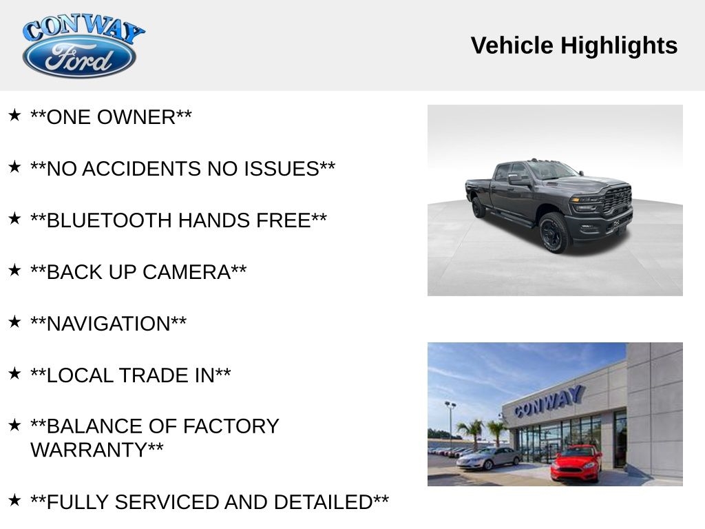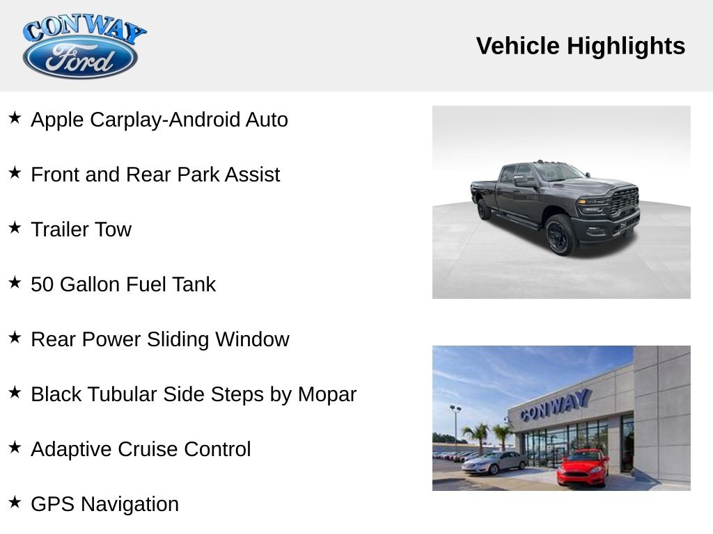 **ONE OWNER**, **NO ACCIDENTS NO ISSUES**, **BLUETOOTH HANDS FREE**, **BACK UP CAMERA**, **NAVIGATION**, **LOCAL TRADE IN**, **BALANCE OF FACTORY WARRANTY**, **FULLY SERVICED AND DETAILED**, Apple Carplay-Android Auto, Front and Rear Park Assist, Trailer Tow, 50 Gallon Fuel Tank, Rear Power Sliding Window, Black Tubular Side Steps by Mopar, Adaptive Cruise Control, 3500 Tradesman, 4D Crew Cab, 6.4L V8, 4WD, Granite Crystal Metallic Clearcoat, 115V Auxiliary Front Power Outlet, 12" Touchscreen Display, 2 Way Rear Headrest Seat, 4 Way Front Headrests, 4-Wheel Disc Brakes, 40/20/40 Split Bench Seat, 400W Inverter, 4G LTE Wi-Fi Hot Spot, 50 Gallon Fuel Tank, 5th Wheel/Gooseneck Towing Prep Group, ABS brakes, Adaptive Cruise Control, Air Conditioning ATC w/Dual Zone Control, Alexa Built-In, Apple CarPlay/Android Auto, Auto-Dimming Rear-View Mirror, Black Exterior Mirrors, Brake assist, Carpet Floor Covering, Clearance Lamps, Cloth 40/20/40 Bench Seat, Compass, Connected Travel & Traffic Services, Connectivity - US/Canada, Convenience Group, Delay-off headlights, Disassociated Touchscreen Display, Driver door bin, Dual front impact airbags, Dual front side impact airbags, Electronic Stability Control, Emergency Vehicle Alert System (EVAS), Engine Block Heater, Exterior 115V AC Outlet, Exterior Mirrors Courtesy Lamps, Exterior Mirrors w/Heating Element, Exterior Mirrors w/Supplemental Signals, For Details Visit DriveUconnect.com, For More Info, Call 800-643-2112, Front & Rear Floor Mats, Front Armrest w/Cupholders, Front fog lights, Front reading lights, Fully automatic headlights, Global Telematics Box Module (TBM), Google Android Auto, GPS Antenna Input, GPS Navigation, HD Radio, Integrated Voice Command w/Bluetooth, LED Tail Lamps, Low tire pressure warning, Manual Adjust 4-Way Driver Seat, Manual Adjust 4-Way Front Passenger Seat, Manual Folding Exterior Mirrors, Manual Telescoping Mirrors, Mirror Running Lights, Mopar Black Tubular Side Steps, Off-Road Information Pages, ParkSense Front/Rear Park Assist System, ParkView Rear Back-Up Camera, Passenger door bin, Power Adjust Mirrors, Power Heat Fold Telescopic Mirrors, Power windows, Power-Adjustable Convex Aux Mirrors, Quick Order Package 2UA Tradesman, Radio: Uconnect 5 Nav w/12.0" Display, Rear Folding Seat, Rear Power Sliding Window, Rear Wheelhouse Liners, Rear window defroster, Remote keyless entry, Remote USB Port - Charge Only, Selectable Tire Fill Alert, SiriusXM Radio Service, SiriusXM w/360L, Storage Tray, Tachometer, Tilt steering wheel, Tinted Acoustic Windshield Glass, Traction control, Tradesman Level 1 Equipment Group, Trailer Tow Pages, Wheels: 18" x 8.0" Black Painted Steel.