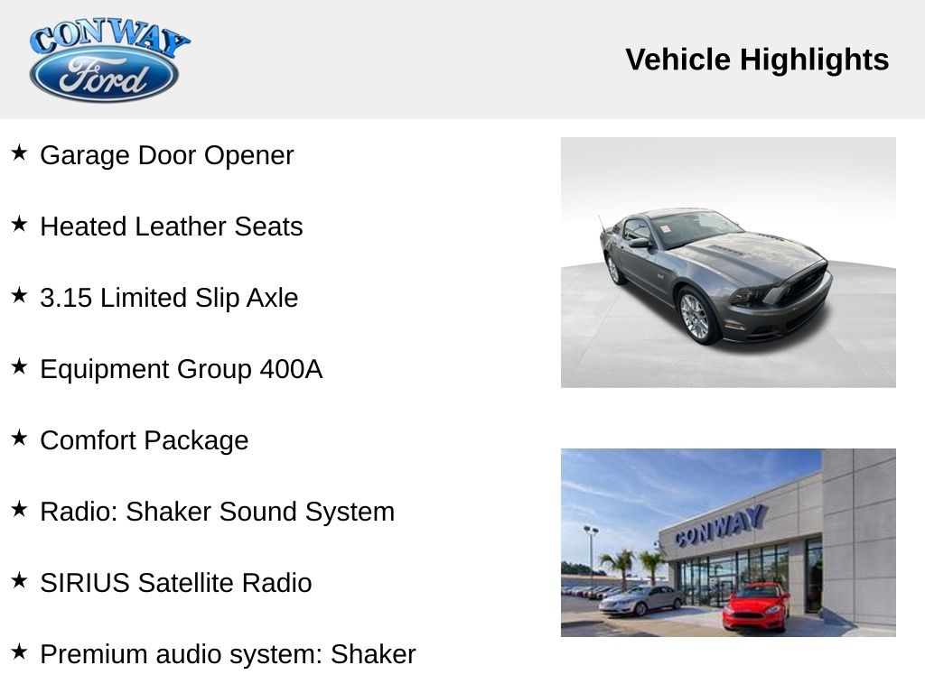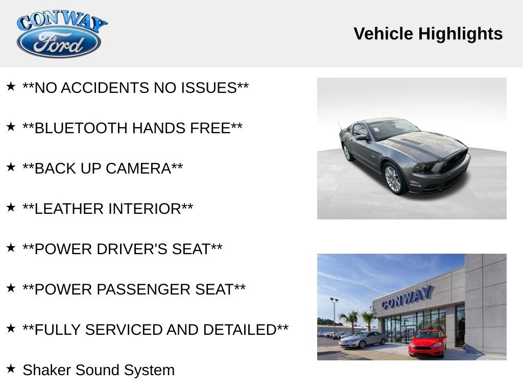 **NO ACCIDENTS NO ISSUES**, **BLUETOOTH HANDS FREE**, **BACK UP CAMERA**, **LEATHER INTERIOR**, **POWER DRIVER'S SEAT**, **POWER PASSENGER SEAT**, **FULLY SERVICED AND DETAILED**, Shaker Sound System, Garage Door Opener, Heated Leather Seats, 3.15 Limited Slip Axle, Mustang GT Premium Low Miles-Clean Carfax, 2D Coupe, 5.0L V8 Ti-VCT 32V, 6-Speed Automatic, RWD, Sterling Gray Metallic, Black Leather, 18" x 8" Polished Aluminum Wheels, 4-Way Power Passenger Seat, 4-Wheel Disc Brakes, ABS brakes, Air Conditioning, AM/FM radio: SiriusXM, Brake assist, Bumpers: body-color, CD player, Comfort Package, Compass, Cruise Control, Delay-off headlights, Driver door bin, Driver vanity mirror, Dual front impact airbags, Dual front side impact airbags, Electronic Stability Control, Equipment Group 400A, Front wheel independent suspension, Fully automatic headlights, Garage door transmitter, Heated Front Seats, Heated Side Mirrors w/Pony Projection Lights, Leather Bucket Seats, Low tire pressure warning, Panic alarm, Passenger door bin, Passenger vanity mirror, Power door mirrors, Power driver seat, Power windows, Premium audio system: Shaker, Radio: Shaker Sound System, Rear window defroster, Remote keyless entry, SIRIUS Satellite Radio, Spoiler, Steering wheel mounted audio controls, Tachometer, Tilt steering wheel, Traction control, Variably intermittent wipers.