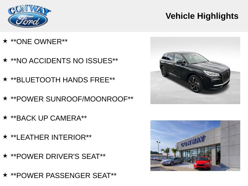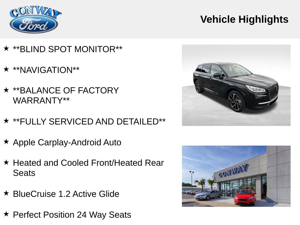 **ONE OWNER**, **NO ACCIDENTS NO ISSUES**, **BLUETOOTH HANDS FREE**, **POWER SUNROOF/MOONROOF**, **BACK UP CAMERA**, **LEATHER INTERIOR**, **POWER DRIVER'S SEAT**, **POWER PASSENGER SEAT**, **BLIND SPOT MONITOR**, **NAVIGATION**, **BALANCE OF FACTORY WARRANTY**, **FULLY SERVICED AND DETAILED**, Apple Carplay-Android Auto, Heated and Cooled Front/Heated Rear Seats, BlueCruise 1.2 Active Glide, Perfect Position 24 Way Seats, Heads-Up Display, Adaptive Suspension, Active Park Assist, Revel 14 Speaker Sound System, Corsair Grand Touring III One Owner-Clean Carfax, 4D Sport Utility, 2.5L i-VCT, AWD, Infinite Black Metallic Clearcoat, Ebony w/Premium Leather Heated/ Cooled Comfort Seats, 4-Wheel Disc Brakes, 60/40 EasyFold Rear Seat w/Power Seatback Release, ABS brakes, Active Park Assist 2.0, Adaptive Cruise Control, Adaptive suspension, Air Conditioning, AM/FM radio: SiriusXM, Auto Air Refresh (Ultra Fresh Cabin), Auto High-beam Headlights, Automatic temperature control, Brake assist, Bumpers: body-color, Compass, Delay-off headlights, Dual front impact airbags, Dual front side impact airbags, Electronic Stability Control, Equipment Group 302A, Four wheel independent suspension, Frameless Auto Dimming Rearview Mirror, Front reading lights, Fully automatic headlights, Hands-Free Liftgate, Head-Up Display, Heated door mirrors, Heated Rear Seat, Heated Seats, Heated Sideview Mirrors, Heated Steering Wheel, Heated/Ventilated Driver & Front Passenger Seats, Illuminated entry, Knee airbag, Lincoln BlueCruise 1.2, Low tire pressure warning, Memory seat, Navigation System, Outside temperature display, Panic alarm, Passenger door bin, Passenger vanity mirror, Perfect Position Seats (24-Way) w/Active Motion, Phone As A Key (PAAK), Power door mirrors, Power driver seat, Power Liftgate, Power moonroof: Panoramic Vista Roof, Power passenger seat, Power Tilt/Telescoping Steering Column w/Memory, Power windows, Premium Leather Heated Comfort Seats, Radio data system, Radio: Revel Audio System w/HD Radio & MP3, Rain Sensing Wipers, Rear Parking Sensors, Rear reading lights, Rear window wiper, Remote keyless entry, Spoiler, Steering wheel mounted A/C controls, Steering wheel mounted audio controls, SYNC 4 Communications & Entertainment System, Tachometer, Telescoping steering wheel, Traction control, Trip computer, Universal Garage Door Opener, Variably intermittent wipers, Wheels: 20" Bright Machined Aluminum, Windshield Wiper De-Icer, Wireless Charging Pad. Priced below KBB Fair Purchase Price!