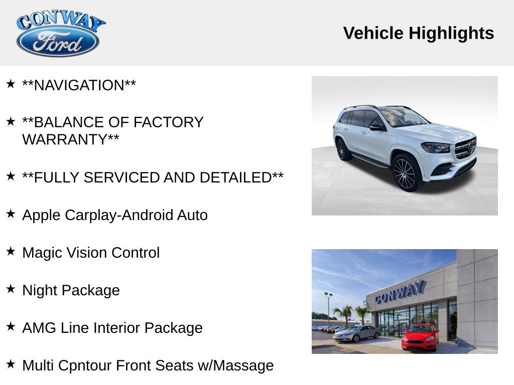 **ONE OWNER**, **NO ACCIDENTS NO ISSUES**, **BLUETOOTH HANDS FREE**, **POWER SUNROOF/MOONROOF**, **BACK UP CAMERA**, **LEATHER INTERIOR**, **POWER DRIVER'S SEAT**, **POWER PASSENGER SEAT**, **NAVIGATION**, **BALANCE OF FACTORY WARRANTY**, **FULLY SERVICED AND DETAILED**, Apple Carplay-Android Auto, Magic Vision Control, Night Package, AMG Line Interior Package, Multi Cpntour Front Seats w/Massage, Panoramic Sunroof, AMG 22" Multi Spoke Wheels, Head-Up Display, Trailer Hitch, 2nd Row Captains Chairs, Temperature Controlled Cup Holders, GLS 450 4MATIC®, 4D Sport Utility, I6, 4MATIC®, Diamond White Bright $1750, Macchiato Beige/Black w/Leather Upholstery, 4-Wheel Disc Brakes, 6-Seat Configuration, ABS brakes, Acoustic Comfort Package, Active Blind Spot Assist, Active Brake Assist w/Cross-Traffic Function, Active Distance Assist DISTRONIC®, Active Emergency Stop Assist, Active Lane Change Assist, Active Lane Keeping Assist, Active Multicontour Front Seats w/Massage, Active Speed Limit Assist, Active Steering Assist, Active Stop & Go Assist, Adaptive Cruise Control, Air Conditioning, AM/FM radio: SiriusXM, AMG® Bodystyling, AMG® Line Exterior, Apple CarPlay®/Android Auto®, Auto High-beam Headlights, Automatic temperature control, Brake assist, Bumpers: body-color, Compass, Delay-off headlights, Driver Assistance Package Plus, Driver door bin, Driver vanity mirror, Dual front impact airbags, Dual front side impact airbags, Dual Zone Auto A/C, Electronic Stability Control, Evasive Steering Assist, Four wheel independent suspension, Front Bucket Seats, Front reading lights, Fully automatic headlights, Garage door transmitter: HomeLink, Head restraints memory, Head-Up Display, Heated & Cooled Front Cup Holders, Heated and Ventilated Power Front Seats w/Memory, Heated Armrest, Heated door mirrors, Heated Rear Armrests, Heated Seats, Heated Steering Wheel, Illuminated entry, Knee airbag, Leather Upholstery, Low tire pressure warning, MAGIC VISION CONTROL, Memory seat, Navigation system: MB Navigation, Night Package, Outside temperature display, Panic alarm, Panorama Sliding Sunroof, Passenger door bin, Passenger vanity mirror, Power door mirrors, Power driver seat, Power Liftgate, Power passenger seat, Power Rear-Window Sunshades, Power windows, PRE-SAFE® PLUS Rear-End Collision Protection, Premium audio system: MBUX, Radio: MBUX Multimedia System, Rain sensing wipers, Rapid Heating Front Seats, Rear air conditioning, Rear dual zone A/C, Rear reading lights, Rear window defroster, Rear window wiper, Remote keyless entry, Route-Based Speed Adaptation, Soft-Close Doors, Spoiler, Steering wheel memory, Steering wheel mounted audio controls, Tachometer, Telescoping steering wheel, Traction control, Traffic Sign Assist, Trailer Hitch, Trip computer, Variably intermittent wipers, Ventilated front seats, Warmth & Comfort Package, Wheels: 22" AMG® Multispoke w/Black Accents. Priced below KBB Fair Purchase Price!