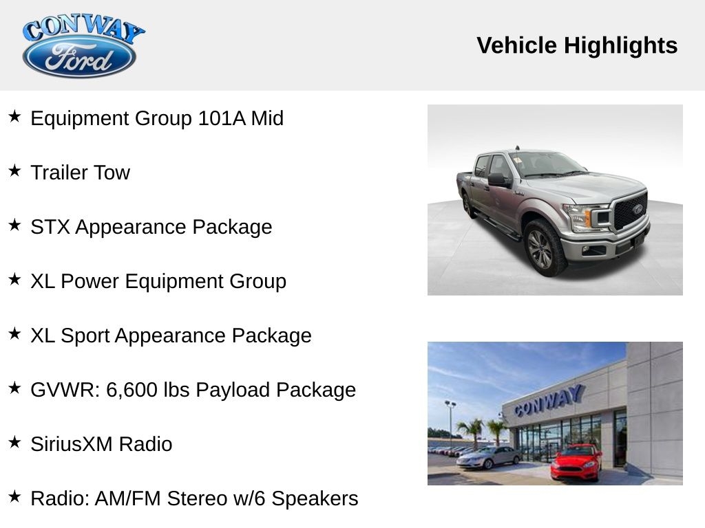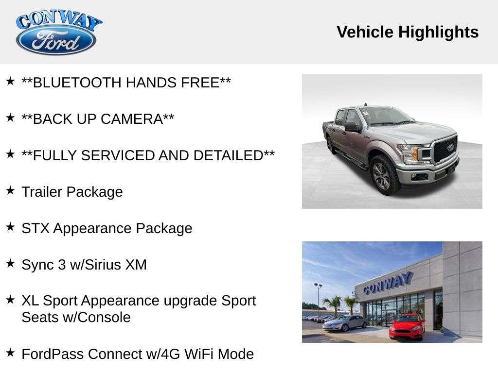 **BLUETOOTH HANDS FREE**, **BACK UP CAMERA**, **FULLY SERVICED AND DETAILED**, Trailer Package, STX Appearance Package, Sync 3 w/Sirius XM, XL Sport Appearance upgrade Sport Seats w/Console, FordPass Connect w/4G WiFi Mode, F-150 XL, 4D SuperCrew, 4WD, Iconic Silver Metallic, Medium Earth Gray Cloth, 20" Machined-Aluminum Wheels, 3.55 Axle Ratio, 4-Wheel Disc Brakes, 4.2" Productivity Screen in Instrument Cluster, ABS brakes, Air Conditioning, Auto High-beam Headlights, Body-Color Surround w/Black Mesh Insert Grille, Box Side Decals, Brake assist, Class IV Trailer Hitch Receiver, Cloth 40/Console/40 Front Seat, Compass, Cruise Control, Delay-off headlights, Driver door bin, Driver/Passenger Seat Back Pocket, Dual front impact airbags, Dual front side impact airbags, Electronic Stability Control, Equipment Group 101A Mid, Exterior Parking Camera Rear, Fog Lamps, FordPass Connect (4G), Front wheel independent suspension, GVWR: 6,600 lbs Payload Package, Illuminated Entry, Low tire pressure warning, Manual Driver/Passenger Lumbar, MyKey, Outside temperature display, Passenger door bin, Perimeter Alarm, Power Door Locks, Power Front & Rear Windows, Power Glass Sideview Mirrors w/Black Skull Caps, Power Tailgate Lock, Radio: AM/FM Stereo w/6 Speakers, Rear Window Defroster, Rear Window Fixed Privacy Glass, SiriusXM Radio, STX Appearance Package, SYNC, SYNC 3, Tachometer, Telescoping steering wheel, Trailer Tow, Unique Sport Cloth 40/20/40 Front-Seats, Upgraded Front Stabilizer Bar, Variably intermittent wipers, XL Power Equipment Group, XL Sport Appearance Package.