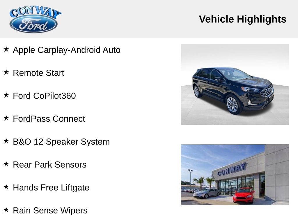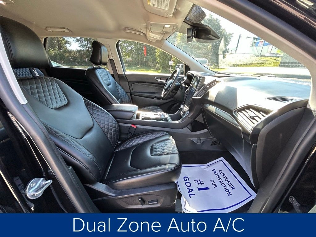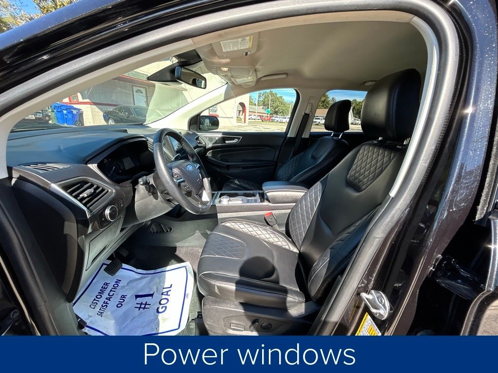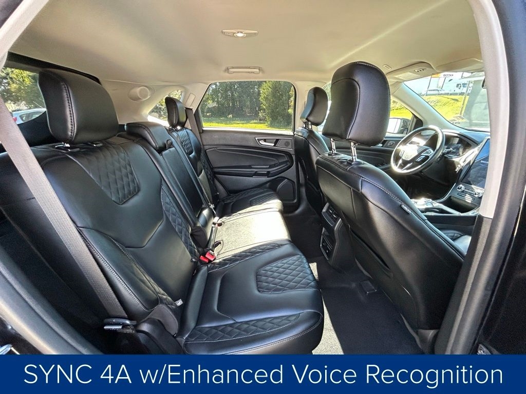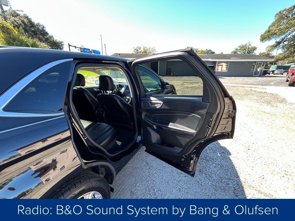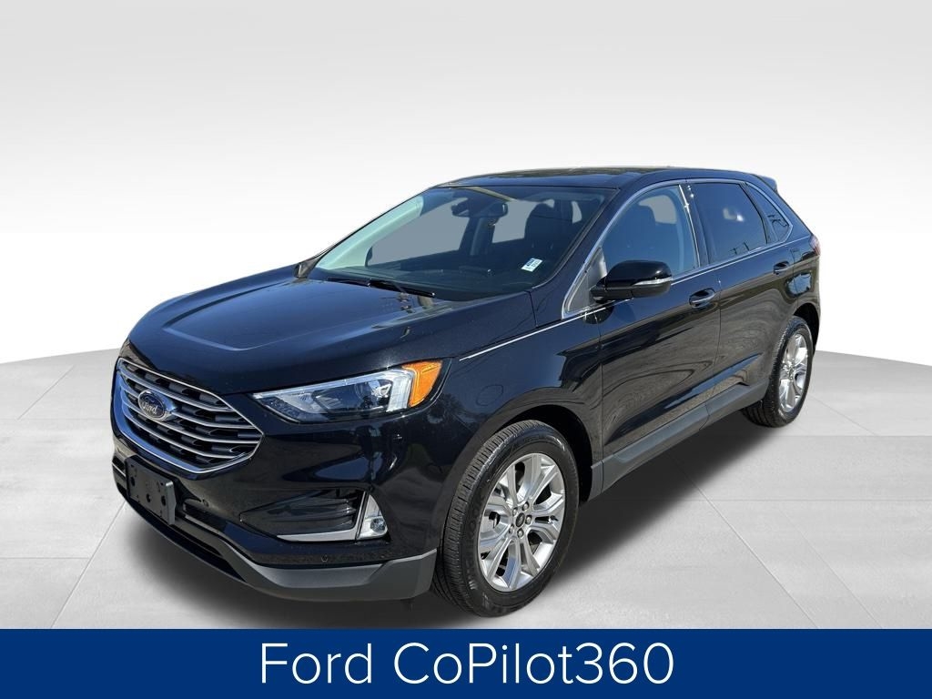 **ONE OWNER**, **BLUETOOTH HANDS FREE**, **BACK UP CAMERA**, **LEATHER INTERIOR**, **POWER DRIVER'S SEAT**, **POWER PASSENGER SEAT**, **BALANCE OF FACTORY WARRANTY**, **FULLY SERVICED AND DETAILED**, Apple Carplay-Android Auto, Remote Start, Ford CoPilot360, FordPass Connect, B&O 12 Speaker System, Rear Park Sensors, Hands Free Liftgate, Rain Sense Wipers, Edge Titanium, 4D Sport Utility, EcoBoost 2.0L I4 GTDi DOHC Turbocharged VCT, AWD, Agate Black Metallic, Ebony w/ActiveX-Trimmed Heated Sport Bucket Seats, 12 Speakers, 4-Wheel Disc Brakes, ABS brakes, ActiveX-Trimmed Heated Sport Bucket Seats, Air Conditioning, Auto High-beam Headlights, Automatic temperature control, Brake assist, Bumpers: body-color, Compass, Cruise Control, Delay-off headlights, Driver door bin, Driver vanity mirror, Dual front impact airbags, Dual front side impact airbags, Dual Zone Auto A/C, Electronic Stability Control, Equipment Group 300A, FordPass Connect, Four wheel independent suspension, Front Bucket Seats, Front fog lights, Front reading lights, Fully automatic headlights, Garage door transmitter, Heated door mirrors, Heated Seats, Heated steering wheel, Knee airbag, Leather steering wheel, Low tire pressure warning, Memory seat, Outside temperature display, Panic alarm, Passenger door bin, Passenger vanity mirror, Power door mirrors, Power driver seat, Power Liftgate, Power passenger seat, Power windows, Radio: B&O Sound System by Bang & Olufsen, Rain sensing wipers, Rear reading lights, Rear window defroster, Rear window wiper, Remote keyless entry, SiriusXM w/360L, Spoiler, Steering wheel mounted audio controls, SYNC 4A w/Enhanced Voice Recognition, Tachometer, Telescoping steering wheel, Traction control, Trip computer, Variably intermittent wipers, Wheels: 19" Luster Nickel-Painted Aluminum.
