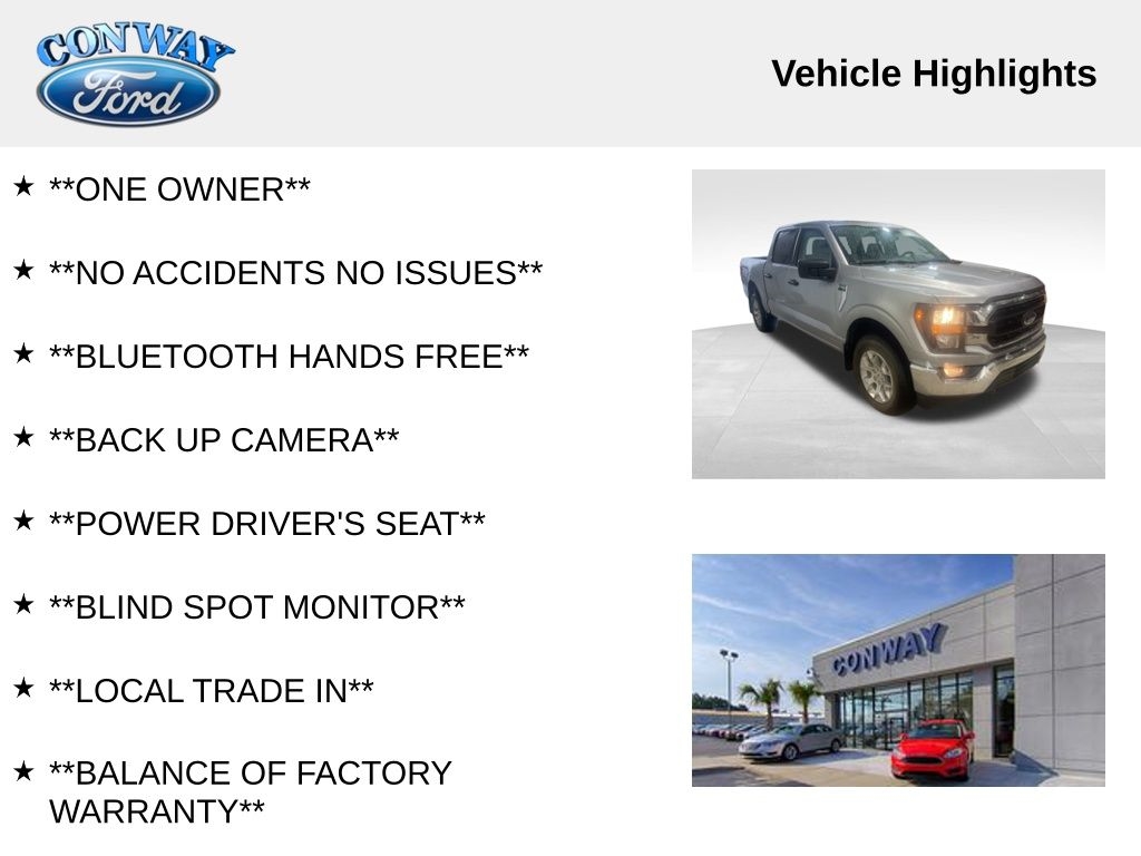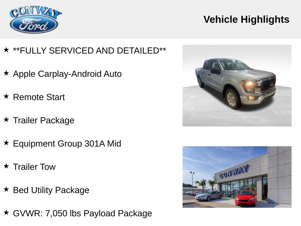 **ONE OWNER**, **NO ACCIDENTS NO ISSUES**, **BLUETOOTH HANDS FREE**, **BACK UP CAMERA**, **POWER DRIVER'S SEAT**, **BLIND SPOT MONITOR**, **LOCAL TRADE IN**, **BALANCE OF FACTORY WARRANTY**, **FULLY SERVICED AND DETAILED**, Apple Carplay-Android Auto, Remote Start, Trailer Package, F-150 XLT, 4D SuperCrew, 5.0L V8, 4WD, Iconic Silver Metallic, 18" Silver Painted Aluminum Wheels, 4-Wheel Disc Brakes, 8-Way Power Driver's Seat w/Power Lumbar, 8" Productivity Screen in Instrument Cluster, ABS brakes, Air Conditioning, Auto High-beam Headlights, Auto-Dimming Rear-View Mirror, Bed Utility Package, BoxLink, Brake assist, Bumpers: chrome, Class IV Trailer Hitch Receiver, Compass, Cruise Control, Delay-off headlights, Driver door bin, Driver vanity mirror, Dual front impact airbags, Dual front side impact airbags, Dual Zone Electronic Automatic Temperature Control, Electronic Locking w/3.31 Axle Ratio, Electronic Stability Control, Equipment Group 301A Mid, Front fog lights, Front reading lights, Front wheel independent suspension, GVWR: 7,050 lbs Payload Package, Heated door mirrors, Integrated Trailer Brake Controller, LED Box Lighting, Low tire pressure warning, Onboard 400W Outlet, Outside temperature display, Panic alarm, Passenger door bin, Passenger vanity mirror, Power door mirrors, Power windows, Pro Trailer Backup Assist & Pro Trailer Hitch Assist, Radio data system, Radio: AM/FM SiriusXM w/360L, Radio: AM/FM Stereo w/6 Speakers, Rear Under-Seat Storage, Remote keyless entry, SecuriCode Drivers Side Keyless-Entry Keypad, Steering wheel mounted audio controls, SYNC 4, SYNC 4 w/Enhanced Voice Recognition, Tachometer, Tailgate Step w/Tailgate Work Surface, Telescoping steering wheel, Traction control, Trailer Tow, Trip computer, Variably intermittent wipers, Wrapped Steering Wheel, Zone Lighting.