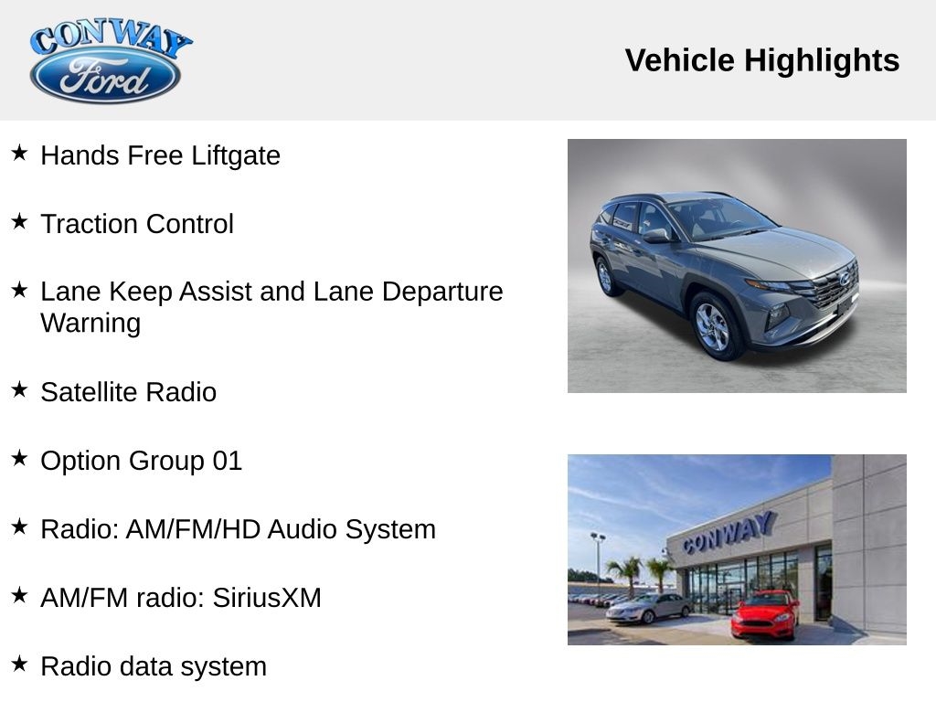 **ONE OWNER**, **NO ACCIDENTS NO ISSUES**, **BLUETOOTH HANDS FREE**, **BACK UP CAMERA**, **POWER DRIVER'S SEAT**, **BALANCE OF FACTORY WARRANTY**, **FULLY SERVICED AND DETAILED**, Apple Carplay-Android Auto, Hands Free Liftgate, Traction Control, Lane Keep Assist and Lane Departure Warning, Satellite Radio, Tucson SEL, 4D Sport Utility, 2.5L I4 DGI DOHC 16V LEV3-SULEV30 187hp, FWD, Hampton Gray, 4-Wheel Disc Brakes, ABS brakes, Adaptive Cruise Control, Air Conditioning, AM/FM radio: SiriusXM, Auto High-beam Headlights, Automatic temperature control, Brake assist, Bumpers: body-color, Delay-off headlights, Driver door bin, Driver vanity mirror, Dual Zone Auto A/C, Electronic Stability Control, Exterior Parking Camera Rear, Four wheel independent suspension, Front Bucket Seats, Front reading lights, Fully automatic headlights, Heated door mirrors, Heated Seats, Low tire pressure warning, Option Group 01, Outside temperature display, Panic alarm, Passenger door bin, Power door mirrors, Power driver seat, Power Liftgate, Power windows, Radio data system, Radio: AM/FM/HD Audio System, Rear window wiper, Remote keyless entry, Spoiler, Steering wheel mounted audio controls, Tachometer, Telescoping steering wheel, Traction control, Trip computer, Variably intermittent wipers. Priced below KBB Fair Purchase Price!