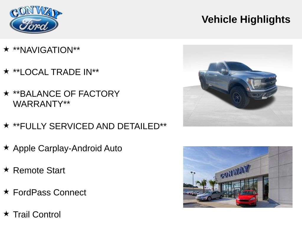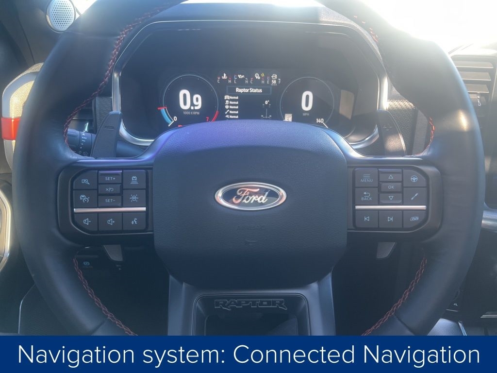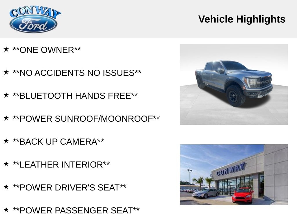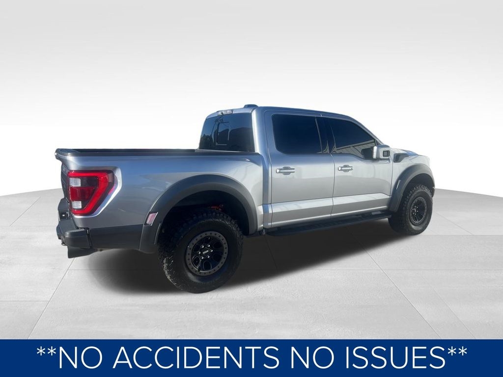 **ONE OWNER**, **NO ACCIDENTS NO ISSUES**, **BLUETOOTH HANDS FREE**, **POWER SUNROOF/MOONROOF**, **BACK UP CAMERA**, **LEATHER INTERIOR**, **POWER DRIVER'S SEAT**, **POWER PASSENGER SEAT**, **NAVIGATION**, **LOCAL TRADE IN**, **BALANCE OF FACTORY WARRANTY**, **FULLY SERVICED AND DETAILED**, Apple Carplay-Android Auto, Remote Start, FordPass Connect, Trail Control, Power Tailgate, Pro Power Onboard- 2kw, Toughbed Bedliner Spray-In, Panoramic Sunroof, In Vehicle Safe By Console Vault, 36 Gallon Fuel Tank, F-150 Raptor, 4D SuperCrew, 3.5L V6 EcoBoost, 10-Speed Automatic, 4WD, Silver Metallic, 17" Forged Aluminum Bead-Lock Capable Wheels, 18 Speakers, 4-Wheel Disc Brakes, ABS brakes, Adjustable pedals, Air Conditioning, AM/FM radio: SiriusXM with 360L, Auto High-beam Headlights, Auto tilt-away steering wheel, Automatic temperature control, Blue Interior Package, Brake assist, Bumpers: body-color, Compass, Cruise Control, Delay-off headlights, Driver door bin, Driver vanity mirror, Dual front impact airbags, Dual front side impact airbags, Dual Zone Auto A/C, Electronic Locking w/4.10 Axle Ratio, Electronic Stability Control, Equipment Group 801A Standard, Exterior Parking Camera Rear, Front Bucket Seats, Front fog lights, Front reading lights, Front wheel independent suspension, Fully automatic headlights, Garage door transmitter, GVWR: 7,300 lbs Payload Package, Heated door mirrors, Heated Rear Seats, Heated Seats, Heated steering wheel, Lane Departure Warning System, Leather Trim Seats w/Heated 2nd Row, Low tire pressure warning, Memory seat, Moonroof & Tailgate, Navigation system: Connected Navigation, Outside temperature display, Panic alarm, Partitioned Lockable Fold-Flat Storage, Passenger door bin, Passenger vanity mirror, Pedal memory, Power door mirrors, Power driver seat, Power passenger seat, Power Tailgate, Power windows, Pro Power Onboard - 2KW, Radio data system, Radio: B&O Unleashed Sound System by Bang & Olufsen, Rear step bumper, Rear window defroster, Recaro Unique Blue Accent 40/Console/40 Front Seats, Remote keyless entry, Steering wheel memory, Steering wheel mounted audio controls, SYNC 4 w/Enhanced Voice Recognition, Tachometer, Telescoping steering wheel, Tough Bed Spray-In Bedliner, Traction control, Trip computer, Turn signal indicator mirrors, Twin Panel Moonroof, Variably intermittent wipers, Ventilated front seats. Priced below KBB Fair Purchase Price!