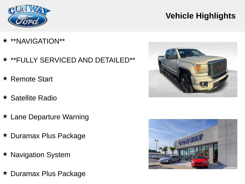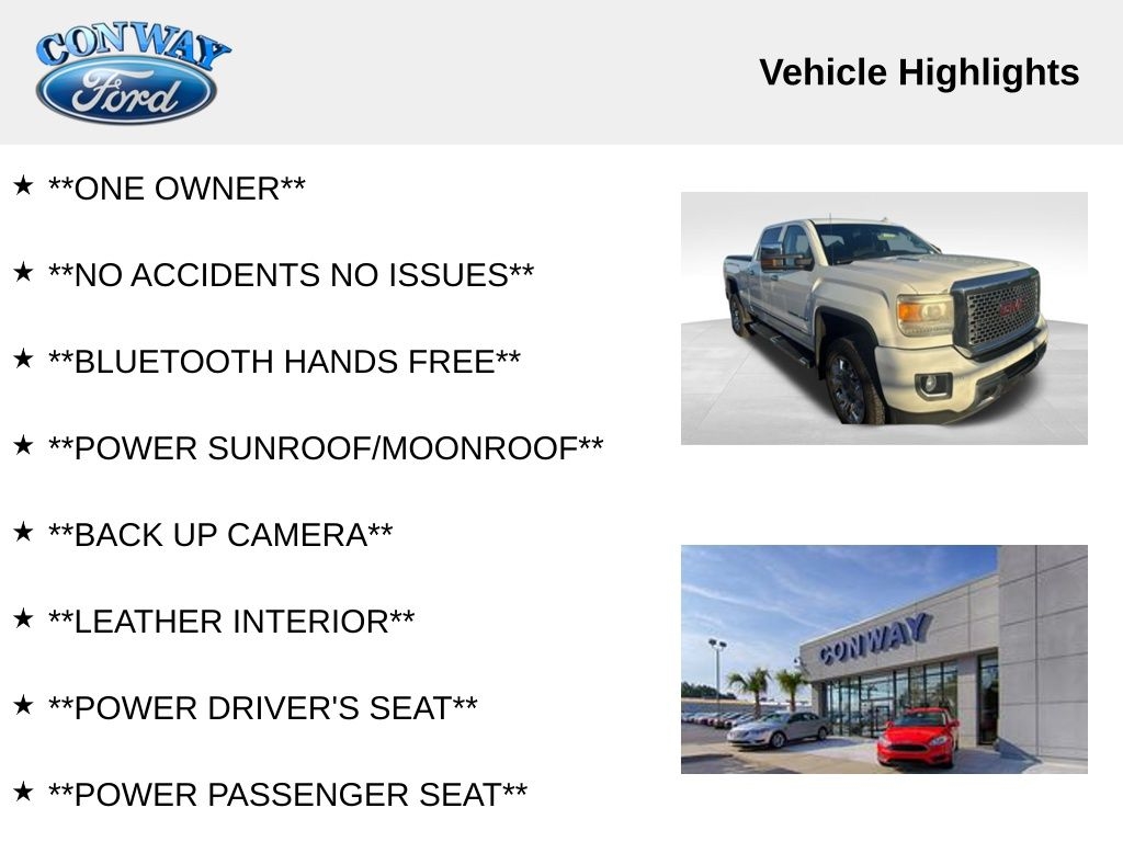 **ONE OWNER**, **NO ACCIDENTS NO ISSUES**, **BLUETOOTH HANDS FREE**, **POWER SUNROOF/MOONROOF**, **BACK UP CAMERA**, **LEATHER INTERIOR**, **POWER DRIVER'S SEAT**, **POWER PASSENGER SEAT**, **NAVIGATION**, **FULLY SERVICED AND DETAILED**, Remote Start, Satellite Radio, Lane Departure Warning, Duramax Plus Package, Sierra 2500HD Denali, 4D Crew Cab, Duramax 6.6L V8 Turbodiesel, Allison 1000 6-Speed Automatic, 4WD, Summit White, Jet Black Leather, 110-Volt AC Power Outlet, 150 Amps Alternator, 4-Wheel Disc Brakes, 8" Multi-Color Driver Instrument Info Display, ABS brakes, Adjustable pedals, Air Conditioning, AM/FM radio: SiriusXM, Auto-Dimming Inside Rear-View Mirror, Automatic temperature control, Black Frame-Mounted Front Recovery Hooks, Bluetooth® For Phone, Body-Color Front Bumper, BOSE Sound w/7 Speaker System, Brake assist, Bumpers: body-color, Chrome Bodyside Moldings, Chrome Door Handles, Color-Keyed Carpeted Floor Mats, Color-Keyed Carpeting Floor Covering, Compass, Cruise Control, Deep-Tinted Glass, Delay-off headlights, Denali Decor, Driver & Front Passenger Visors, Driver Alert Package, Driver door bin, Driver vanity mirror, Dual front impact airbags, Dual front side impact airbags, Dual Zone Auto A/C, Dual-Zone Automatic Climate Control, Duramax Plus Package, Electric Rear-Window Defogger, Electronic Shift Transfer Case, Electronic Stability Control, Exhaust Brake, Exterior Parking Camera Rear, EZ-Lift & Lower Tailgate, Front fog lights, Front Halogen Fog Lamps, Front reading lights, Front wheel independent suspension, Fully automatic headlights, Garage door transmitter, Heated & Cooled Front Bucket Seats, Heated door mirrors, Heated Driver & Front Passenger Seats, Heated Leather Steering Wheel, Heated Power-Adjustable Outside Mirrors, Heavy-Duty Trailering Equipment, Low tire pressure warning, Manual Tilt-Wheel/Telescoping Steering Column, Memory seat, Navigation System, OnStar 4G LTE Wi-Fi Hotspot, OnStar 6 Months Directions/Connections Plan, Outside temperature display, Panic alarm, Passenger door bin, Perforated Leather Appointed Seat Trim, Power door mirrors, Power driver seat, Power passenger seat, Power Sliding Rear Window w/Defogger, Power Sunroof, Power windows, Power Windows w/Driver Express Up & Down, Power-Adjustable Pedals For Accelerator & Brake, Radio: AM/FM/SiriusXM w/Navigation, Rear 60/40 Folding Bench Seat (Folds Up), Rear Body-Color Bumper w/Bumper CornerSteps, Rear step bumper, Rear Vision Camera w/Dynamic Guide Lines, Rear Wheelhouse Liners, Rear window defroster, Remote Keyless Entry, Remote Vehicle Starter System, Single Slot CD/MP3 Player, SiriusXM Satellite Radio, Standard Suspension Package, Steering Wheel Audio Controls, Steering wheel mounted audio controls, Tachometer, Telescoping steering wheel, Theft Deterrent System (Unauthorized Entry), Traction control, Trip computer, Turn signal indicator mirrors, Ultrasonic Front & Rear Park Assist, Universal Home Remote, Variably intermittent wipers, Ventilated front seats.