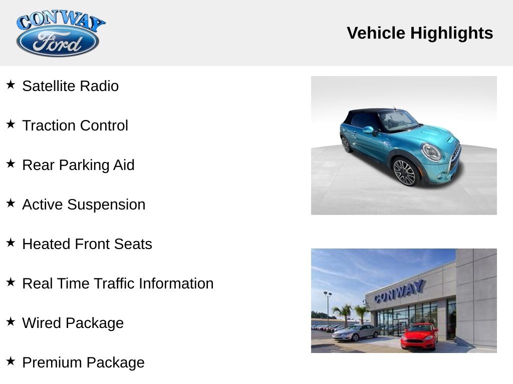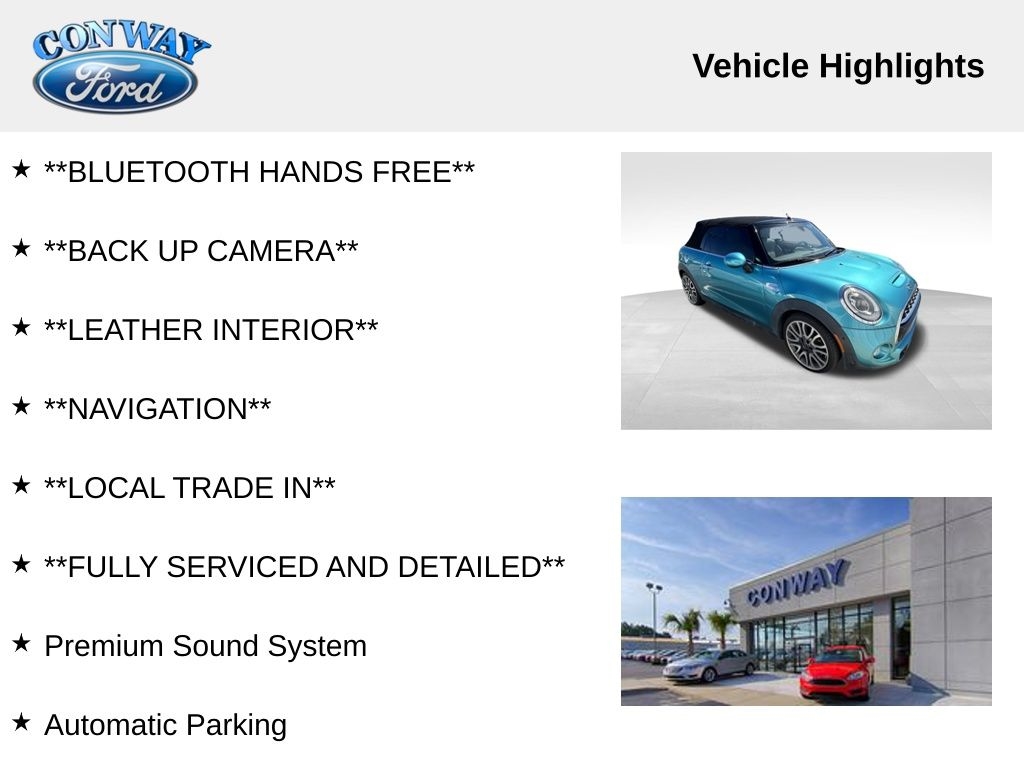 **BLUETOOTH HANDS FREE**, **BACK UP CAMERA**, **LEATHER INTERIOR**, **NAVIGATION**, **LOCAL TRADE IN**, **FULLY SERVICED AND DETAILED**, Premium Sound System, Automatic Parking, Satellite Radio, Traction Control, Rear Parking Aid, Active Suspension, Heated Front Seats, Cooper S S Sport/ Premium/ Technology, 2D Convertible, 2.0L 16V TwinPower Turbo, 6-Speed Automatic, FWD, Caribbean Aqua Metallic, 4-Wheel Disc Brakes, ABS brakes, Air Conditioning, Auto-Dimming Interior & Exterior Mirrors, Automatic temperature control, Brake assist, Bumpers: body-color, Comfort Access Keyless Entry, Convertible Wind Deflector, Delay-off headlights, Driver door bin, Driver vanity mirror, Dual front impact airbags, Dual front side impact airbags, Dual Zone Auto A/C, Dynamic Damper Control, Electronic Stability Control, Enhanced USB & Bluetooth, Exterior Parking Camera Rear, Four wheel independent suspension, Front fog lights, Front reading lights, Fully automatic headlights, harman/kardon® Logic 7® Digital Surround, Heated door mirrors, Heated Front Seats, Illuminated entry, Knee airbag, LED Fog Lights, LED Headlights, Low tire pressure warning, MINI Connected XL, Parking Assistant w/Front & Rear PDC, Passenger door bin, Power door mirrors, Power moonroof, Power windows, Premium Package, Rain sensing wipers, Real Time Traffic Information, Rear Parking Sensors, Rear window defroster, Rear window wiper, Remote keyless entry, SiriusXM Satellite Radio, Sport Package, Sport steering wheel, Steering wheel mounted audio controls, Tachometer, Technology Package, Telescoping steering wheel, Traction control, Trip computer, Variably intermittent wipers, Wired Package.