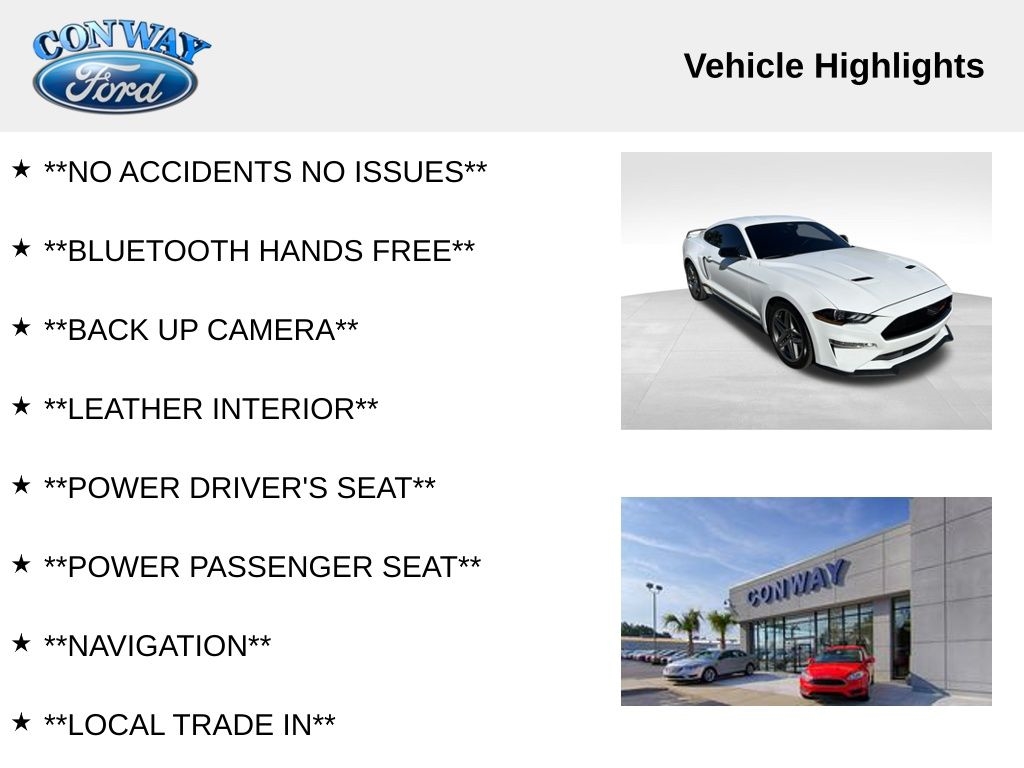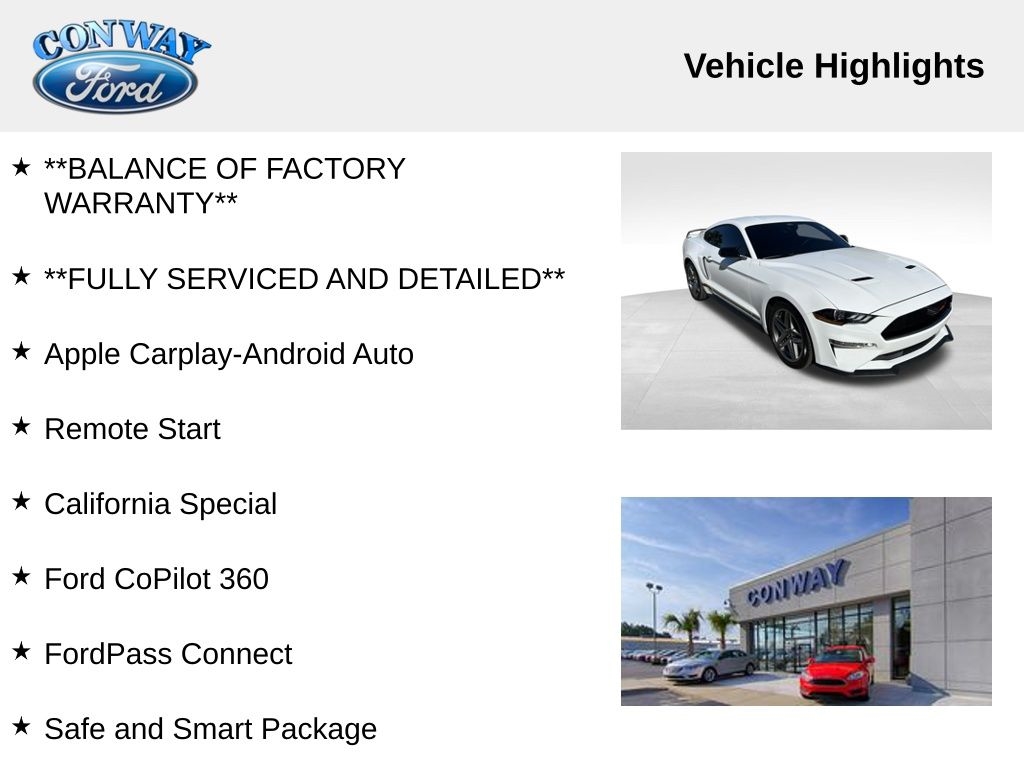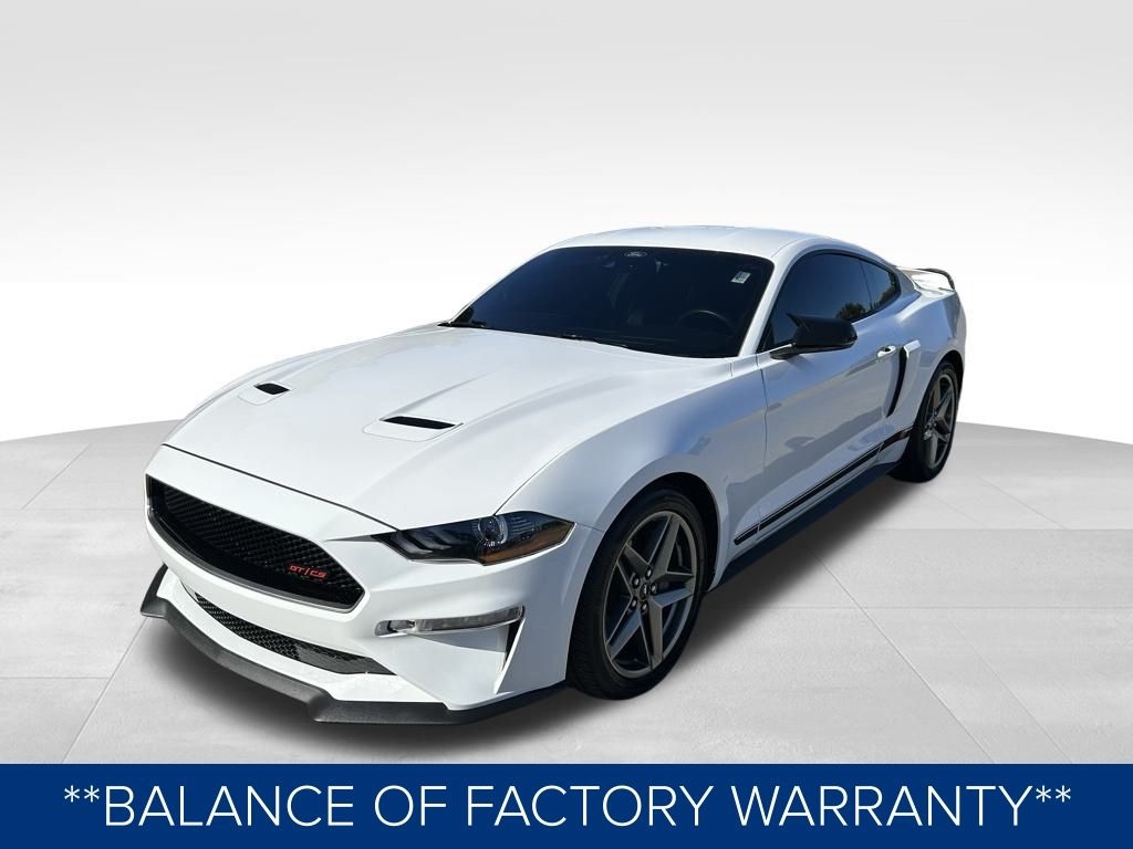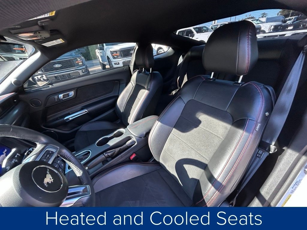 **NO ACCIDENTS NO ISSUES**, **BLUETOOTH HANDS FREE**, **BACK UP CAMERA**, **LEATHER INTERIOR**, **POWER DRIVER'S SEAT**, **POWER PASSENGER SEAT**, **NAVIGATION**, **LOCAL TRADE IN**, **BALANCE OF FACTORY WARRANTY**, **FULLY SERVICED AND DETAILED**, Apple Carplay-Android Auto, Remote Start, California Special, Ford CoPilot 360, FordPass Connect, Safe and Smart Package, Active Valve Performance Exhaust, Adaptive Cruise Control, Heated and Cooled Seats, Mustang GT Premium California Special, 2D Coupe, 5.0L V8 Ti-VCT, Oxford White, Ebony With Red Stitching Leather, 12" LCD Digital Instrument Cluster w/MyColor, 3.15 Limited Slip Rear Axle Ratio, 4-Wheel Disc Brakes, ABS brakes, Active Valve Performance Exhaust, Adaptive Cruise Control, Air Conditioning, AM/FM radio: SiriusXM, Auto High-beam Headlights, Automatic temperature control, Brake assist, Bumpers: body-color, California Special Package, California Special Script Rear Badging, Climate Controlled Heated/Cooled Front Seats, Compass, Delay-off headlights, Driver door bin, Driver vanity mirror, Dual front impact airbags, Dual front side impact airbags, Dual Zone Auto A/C, Electronic Stability Control, Equipment Group 401A, Exterior Parking Camera Rear, Floor Mats w/Red Contrast Stitching, Ford Safe & Smart Package, Four wheel independent suspension, Front fog lights, Front reading lights, Fully automatic headlights, Garage door transmitter, Heated door mirrors, Heated Steering Wheel, Illuminated entry, Integrated Turn Signals, Knee airbag, Leather Shift Knob, Leather-Trimmed Bucket Seats, Leather-Trimmed Bucket Seats w/Color Accents, Leather-Trimmed Bucket Seats w/Miko Suede Inserts, Low tire pressure warning, Memory Driver Seat, Mirrors & Ambient Lighting, Mesh 45 Aluminum Instrument Panel, Miko Suede Door Inserts w/Red Contrast Stitching, Outside temperature display, Panic alarm, Passenger door bin, Passenger vanity mirror, Power door mirrors, Power driver seat, Power passenger seat, Power windows, Radio data system, Rain sensing wipers, Rear Parking Sensors, Rear window defroster, Remote keyless entry, Remote Start System, Side Scoops, SiriusXM Radio, Spoiler, Steering wheel mounted audio controls, SYNC 3 Communications & Entertainment System, Tachometer, Telescoping steering wheel, Traction control, Trip computer, Unique Front Honeycomb Grilles w/GT/CS Badge, Variably intermittent wipers, Voice-Activated Touch-Screen Navigation System, Wheels: 19" x 8.5" Machined-Face Aluminum.
