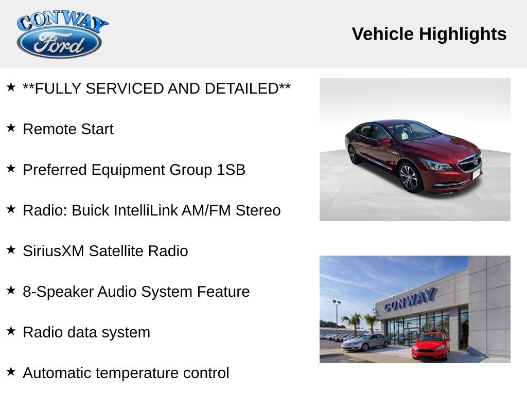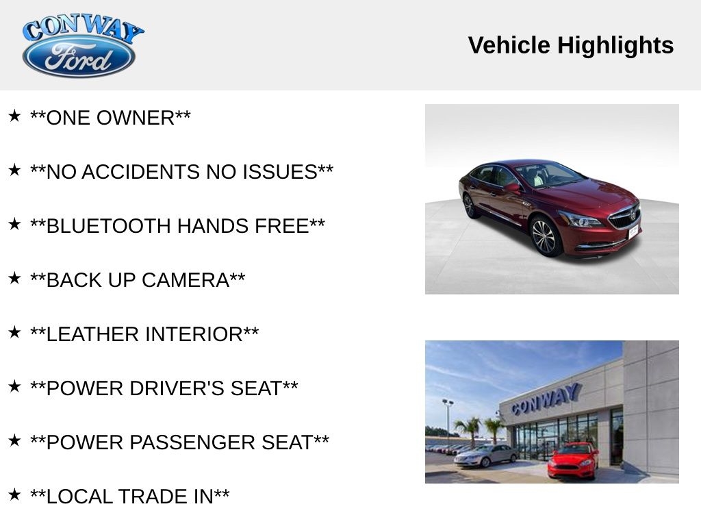 **ONE OWNER**, **NO ACCIDENTS NO ISSUES**, **BLUETOOTH HANDS FREE**, **BACK UP CAMERA**, **LEATHER INTERIOR**, **POWER DRIVER'S SEAT**, **POWER PASSENGER SEAT**, **LOCAL TRADE IN**, **FULLY SERVICED AND DETAILED**, Remote Start, LaCrosse Preferred, 4D Sedan, 3.6L V6 DI, Crimson Red Tintcoat, Light Neutral Artificial Leather, 2-Way Power Driver Lumbar Control Seat Adjuster, 4-Wheel Disc Brakes, 8-Speaker Audio System Feature, 8-Way Power Driver Seat Adjuster, 8-Way Power Front Passenger Seat Adjuster, ABS brakes, Air Conditioning, Automatic temperature control, Brake assist, Bumpers: body-color, Cruise Control, Delay-off headlights, Driver door bin, Driver vanity mirror, Dual front impact airbags, Dual front side impact airbags, Dual Zone Auto A/C, Electronic Stability Control, Exterior Parking Camera Rear, Four wheel independent suspension, Front fog lights, Front reading lights, Fully automatic headlights, Garage door transmitter, Heated door mirrors, Knee airbag, Leather Seat Trim, Leather Shift Knob, Leather steering wheel, Low tire pressure warning, Outside temperature display, Passenger door bin, Passenger vanity mirror, Power door mirrors, Power driver seat, Power passenger seat, Preferred Equipment Group 1SB, Radio data system, Radio: Buick IntelliLink AM/FM Stereo, Rear window defroster, Remote keyless entry, SiriusXM Satellite Radio, Steering wheel mounted audio controls, Tachometer, Telescoping steering wheel, Trip computer, Variably intermittent wipers, Wheels: 18" Ultra-Bright Machined-Faced Aluminum.
