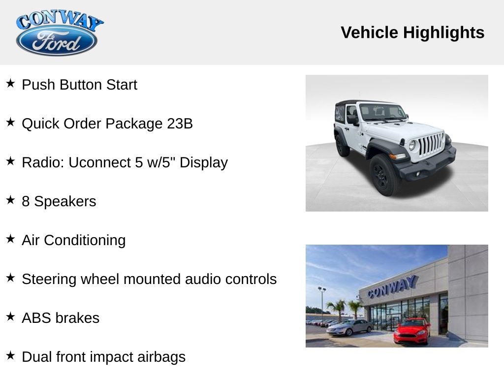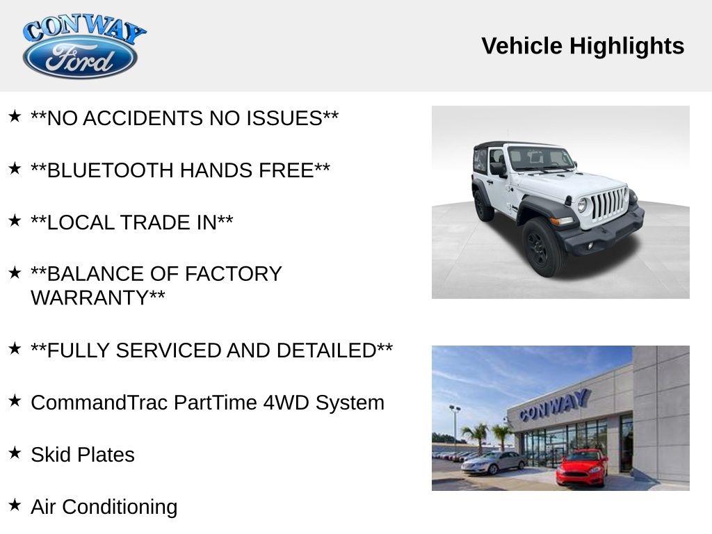 **NO ACCIDENTS NO ISSUES**, **BLUETOOTH HANDS FREE**, **LOCAL TRADE IN**, **BALANCE OF FACTORY WARRANTY**, **FULLY SERVICED AND DETAILED**, CommandTrac PartTime 4WD System, Skid Plates, Air Conditioning, Push Button Start, Wrangler Sport, 2D Sport Utility, 3.6L V6 24V VVT, 6-Speed Manual, 4WD, Bright White Clearcoat, 4-Wheel Disc Brakes, 8 Speakers, ABS brakes, Air Conditioning, Brake assist, Cloth Low-Back Bucket Seats, Driver door bin, Dual front impact airbags, Dual front side impact airbags, Electronic Stability Control, Front fog lights, Low tire pressure warning, ParkView Rear Back-Up Camera, Passenger door bin, Quick Order Package 23B, R1234YF A/C Refrigerant, Radio: Uconnect 5 w/5" Display, Steering wheel mounted audio controls, Variably intermittent wipers.