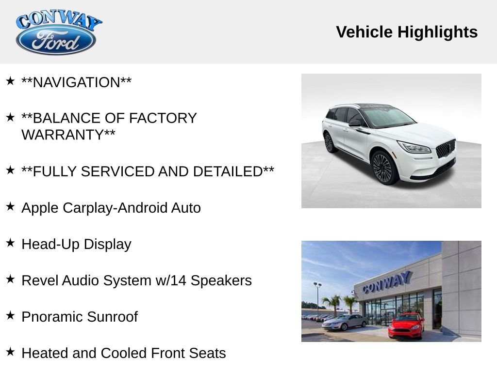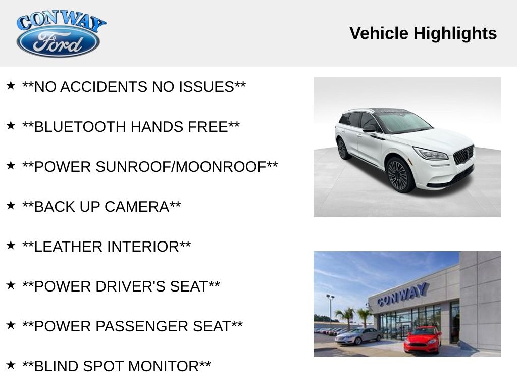 **NO ACCIDENTS NO ISSUES**, **BLUETOOTH HANDS FREE**, **POWER SUNROOF/MOONROOF**, **BACK UP CAMERA**, **LEATHER INTERIOR**, **POWER DRIVER'S SEAT**, **POWER PASSENGER SEAT**, **BLIND SPOT MONITOR**, **NAVIGATION**, **BALANCE OF FACTORY WARRANTY**, **FULLY SERVICED AND DETAILED**, Apple Carplay-Android Auto, Head-Up Display, Revel Audio System w/14 Speakers, Pnoramic Sunroof, Heated and Cooled Front Seats, Heated Rear Seats, Phone as a Key, Adaptive Cruise and Suspension, Corsair Grand Touring, AWD, Pristine White Metallic Tri-Coat, Sandstone Leather, 10 Speakers, 20" Premium Painted Wheels, 4-Wheel Disc Brakes, ABS brakes, Adaptive Cruise Control, Adaptive suspension, Air Conditioning, AM/FM radio: SiriusXM, Auto High-beam Headlights, Automatic temperature control, Brake assist, Bumpers: body-color, Compass, Delay-off headlights, Driver door bin, Driver vanity mirror, Dual front impact airbags, Dual front side impact airbags, Dual Zone Auto A/C, Electronic Stability Control, Elements Technology Bundle, Equipment Group 300A, Four wheel independent suspension, Front Bucket Seats, Front reading lights, Fully automatic headlights, Garage door transmitter, Heated door mirrors, Illuminated entry, Knee airbag, Leather steering wheel, Lincoln Co-Pilot360 1.5 Plus, Low tire pressure warning, Luxury Package, Memory seat, Navigation System, Outside temperature display, Panic alarm, Passenger door bin, Passenger vanity mirror, Power door mirrors, Power driver seat, Power Liftgate, Power moonroof: Panoramic Vista Roof, Power passenger seat, Power windows, Premium Leather Heated Comfort Seats, Radio data system, Radio: Revel Audio System w/HD Radio & MP3, Rear Parking Sensors, Rear window defroster, Rear window wiper, Remote keyless entry, Spoiler, Steering wheel memory, Steering wheel mounted audio controls, SYNC 3 Communications & Entertainment System, Tachometer, Telescoping steering wheel, Traction control, Trip computer, Variably intermittent wipers.