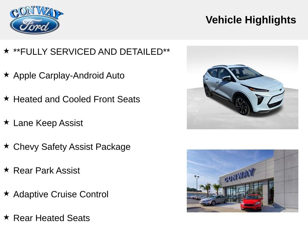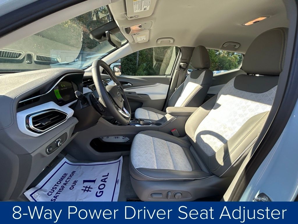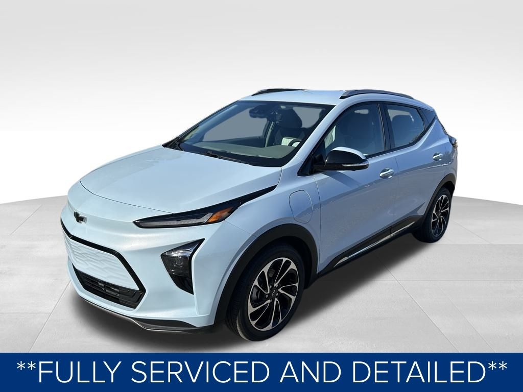 **ONE OWNER**, **NO ACCIDENTS NO ISSUES**, **BLUETOOTH HANDS FREE**, **BACK UP CAMERA**, **LEATHER INTERIOR**, **POWER DRIVER'S SEAT**, **LOCAL TRADE IN**, **BALANCE OF FACTORY WARRANTY**, **FULLY SERVICED AND DETAILED**, Apple Carplay-Android Auto, Heated and Cooled Front Seats, Lane Keep Assist, Chevy Safety Assist Package, Rear Park Assist, Adaptive Cruise Control, Rear Heated Seats, Rain Sensing Wipers, Bolt EUV Premier, 4D Sport Utility, Electric Motor, FWD, Ice Blue Metallic, Dark Ash Gray Sky Gray Leather, 4-Wheel Disc Brakes, 6-Speaker Audio System, 6-Way Manual Passenger Seat Adjuster, 8-Way Power Driver Seat Adjuster, ABS brakes, Adaptive Cruise Control, Air Conditioning, Apple CarPlay/Android Auto, Auto High-beam Headlights, Automatic temperature control, Brake assist, Bumpers: body-color, Compass, Delay-off headlights, Driver door bin, Driver vanity mirror, Dual front impact airbags, Dual front side impact airbags, Electronic Stability Control, Front reading lights, Front wheel independent suspension, Fully automatic headlights, Heated door mirrors, Heated Driver & Front Passenger Seats, Heated Rear Seats, Heated steering wheel, Knee airbag, Low tire pressure warning, Outside temperature display, Panic alarm, Passenger door bin, Passenger vanity mirror, Perforated Leather-Appointed Seat Trim, Power door mirrors, Power windows, Preferred Equipment Group 2LZ, Radio: Chevrolet Infotainment 3 Plus System, Rain sensing wipers, Rear reading lights, Rear window defroster, Rear window wiper, Remote keyless entry, SiriusXM Radio w/360L, Steering wheel mounted audio controls, Telescoping steering wheel, Traction control, Trip computer, Variably intermittent wipers, Ventilated Driver Seat, Ventilated Front Passenger Seat.