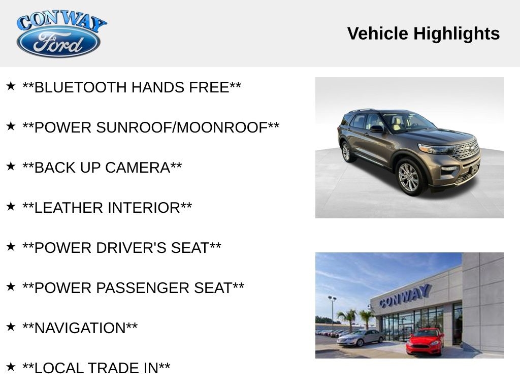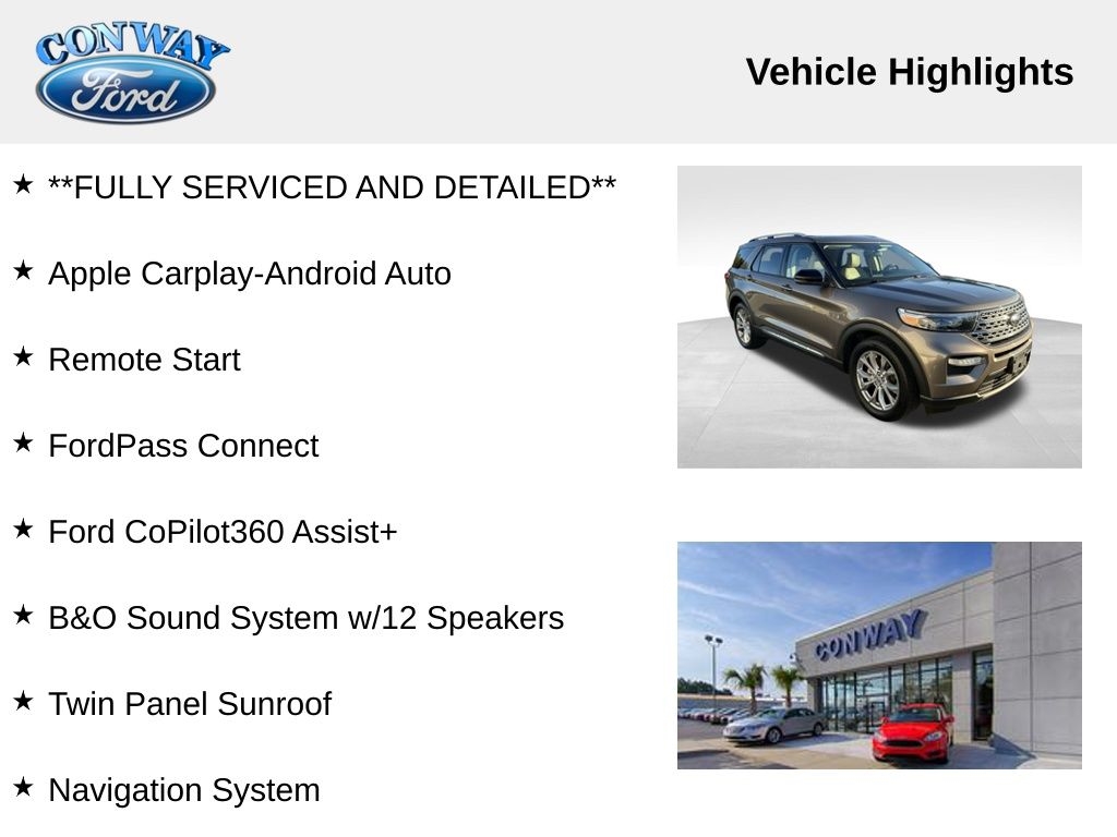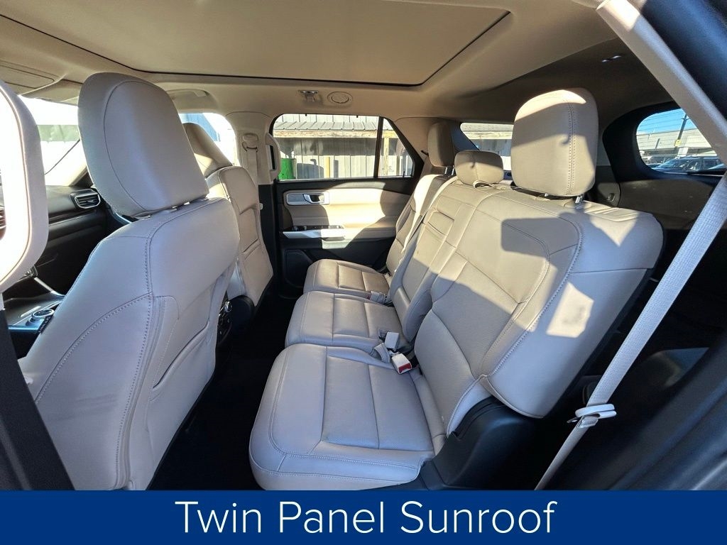 **BLUETOOTH HANDS FREE**, **POWER SUNROOF/MOONROOF**, **BACK UP CAMERA**, **LEATHER INTERIOR**, **POWER DRIVER'S SEAT**, **POWER PASSENGER SEAT**, **NAVIGATION**, **LOCAL TRADE IN**, **FULLY SERVICED AND DETAILED**, Apple Carplay-Android Auto, Remote Start, FordPass Connect, Ford CoPilot360 Assist+, B&O Sound System w/12 Speakers, Twin Panel Sunroof, Explorer Limited, 4D Sport Utility, 2.3L EcoBoost I-4, Stone Gray Metallic, Sandstone Leather, 110V/150W AC Power Outlet, 12 Speakers, 20" Premium Painted Aluminum Wheels, 3rd Row PowerFold Seat, 3rd row seats: bench, 4-Wheel Disc Brakes, ABS brakes, Air Conditioning, Auto High-beam Headlights, Automatic temperature control, Brake assist, Bumpers: body-color, Compass, Cruise Control, Delay-off headlights, Driver door bin, Driver vanity mirror, Dual front impact airbags, Dual front side impact airbags, Dual Zone Auto A/C, Electronic Stability Control, Equipment Group 301A, Exterior Parking Camera Rear, FordPass Connect, Four wheel independent suspension, Front fog lights, Front reading lights, Fully automatic headlights, Garage door transmitter: HomeLink, Hands-Free Foot-Activated Liftgate, Heated door mirrors, Heated Rear Seats, Heated Seats, Heated steering wheel, Knee airbag, Leather Heated/Ventilated Captain's Chairs, Leather steering wheel, Limited Convenience Package, Low tire pressure warning, Memory Driver's Seat, Navigation System, Panic alarm, Passenger door bin, Passenger vanity mirror, Power door mirrors, Power driver seat, Power Liftgate, Power passenger seat, Power Tilt/Telescoping Steering Column, Power windows, Radio data system, Radio: B&O Sound System by Bang & Olufsen, Rain sensing wipers, Rear air conditioning, Rear reading lights, Rear window defroster, Rear window wiper, Remote keyless entry, Sideview Mirrors w/Gloss Black Caps, Spoiler, Steering wheel mounted audio controls, SYNC 3 Communications & Entertainment System, SYNC 3/Apple CarPlay/Android Auto, Tachometer, Telescoping steering wheel, Traction control, Trip computer, Twin Panel Moonroof, Variably intermittent wipers, Ventilated front seats, Voice-Activated Touchscreen Navigation System.