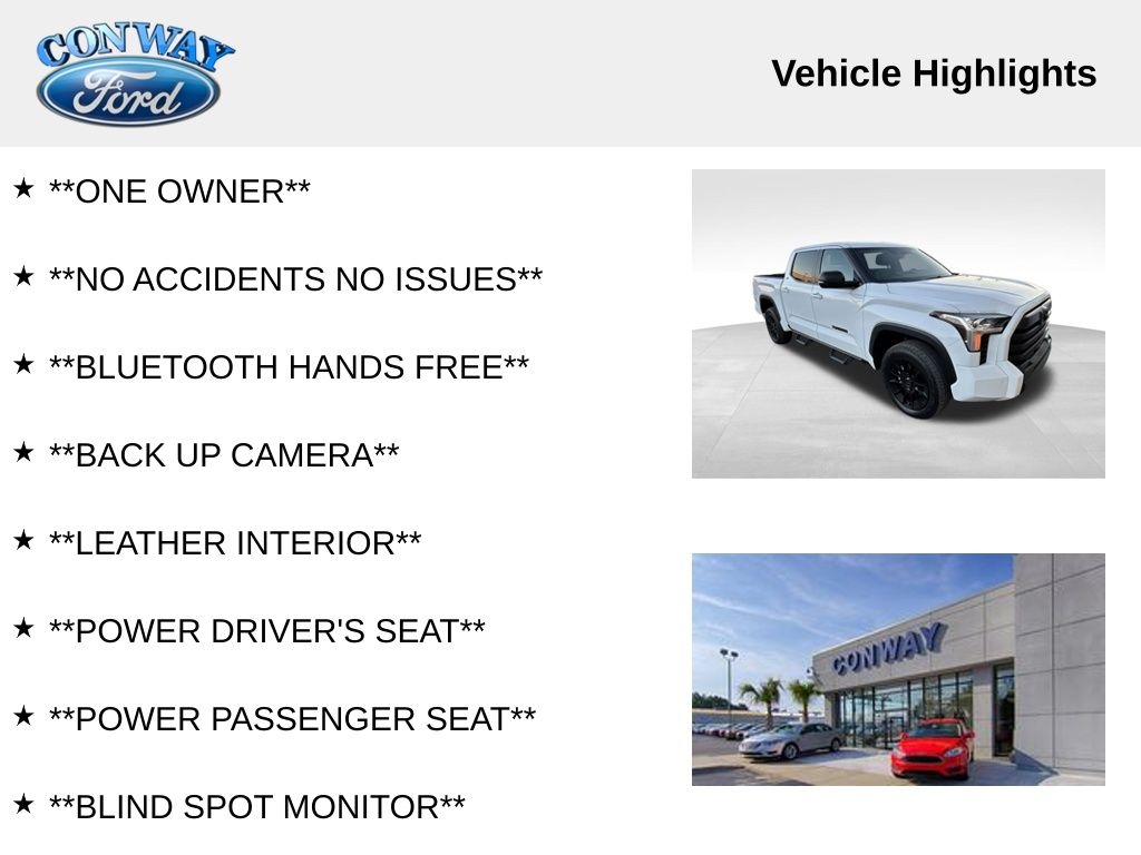 **ONE OWNER**, **NO ACCIDENTS NO ISSUES**, **BLUETOOTH HANDS FREE**, **BACK UP CAMERA**, **LEATHER INTERIOR**, **POWER DRIVER'S SEAT**, **POWER PASSENGER SEAT**, **BLIND SPOT MONITOR**, **BALANCE OF FACTORY WARRANTY**, **FULLY SERVICED AND DETAILED**, Apple Carplay-Android Auto, Radar Cruise Control, Front Heated and Power Seats, Parking Assist, Predator Bars, 9 Speaker Multimedia Sound System, Tundra SR5 Premium Package w/ XP Series, 4D CrewMax, 3.4L V6, 4WD, White, 32 Gallon Fuel Tank, 4-Wheel Disc Brakes, 8-Way Power-Adjustable Heated Front Seats, ABS brakes, Adaptive Cruise Control, Air Conditioning, AM/FM radio: SiriusXM, Apple CarPlay/Android Auto, Auto High-beam Headlights, Automatic temperature control, Blind Spot Monitor, Blind Spot Monitor w/Lane Change Assist, Brake assist, Bumpers: body-color, Delay-off headlights, Driver door bin, Driver vanity mirror, Dual front impact airbags, Dual front side impact airbags, Electronic Stability Control, Exterior Parking Camera Rear, Fabric Seat Trim, Front Bucket Seats, Front fog lights, Front reading lights, Front wheel independent suspension, Fully automatic headlights, Heated door mirrors, Knee airbag, Low tire pressure warning, Overhead console, Panic alarm, Parking Support Alert/Brake, Passenger door bin, Power door mirrors, Power windows, Radio data system, Radio: Audio Multimedia System, Radio: Premium Audio, Rear reading lights, Rear step bumper, Rear window defroster, Remote keyless entry, Safety Connect, SofTex Seat Trim, SR5 Convenience Package, SR5 Premium Package, Steering wheel mounted audio controls, SX Package, Tachometer, Telescoping steering wheel, Towing Package, Traction control, Trip computer, Variably intermittent wipers, Wheels: 20" Black Alloy.
