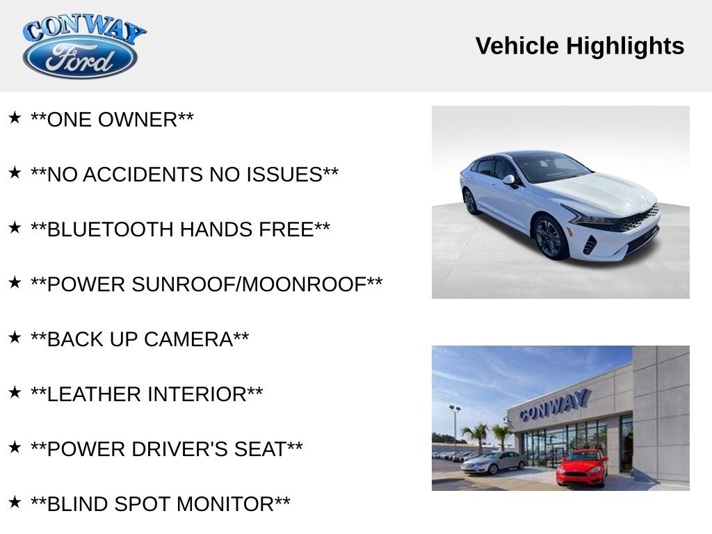 **ONE OWNER**, **NO ACCIDENTS NO ISSUES**, **BLUETOOTH HANDS FREE**, **POWER SUNROOF/MOONROOF**, **BACK UP CAMERA**, **LEATHER INTERIOR**, **POWER DRIVER'S SEAT**, **BLIND SPOT MONITOR**, **NAVIGATION**, **BALANCE OF FACTORY WARRANTY**, **FULLY SERVICED AND DETAILED**, Apple Carplay-Android Auto, Remote Start, Lane Keep Assist, Bose Premium Audio, Back-Up Sensors, Panoramic Sunroof, Smart Cruise Control, K5 EX, 4D Sedan, 1.6L I4 DGI Turbocharged DOHC 16V LEV3-ULEV70 180hp, FWD, Glacial White Pearl, Black, 4-Wheel Disc Brakes, ABS brakes, Active Sound Design, Air Conditioning, AM/FM radio: SiriusXM, Auto High-beam Headlights, Auto Up/Down Rear Windows, Automatic temperature control, Bose Premium Audio, Brake assist, Bumpers: body-color, Delay-off headlights, Driver door bin, Driver vanity mirror, Dual front impact airbags, Dual front side impact airbags, Dual Zone Auto A/C, Electronic Stability Control, EX Premium Package, Forward Collision Avoidance-Assist, Four wheel independent suspension, Front Bucket Seats, Front reading lights, Fully automatic headlights, Heated & Ventilated Front Bucket Seats, Heated door mirrors, Heated Steering Wheel, Highway Driving Assist, Knee airbag, Leather steering wheel, LED Rear Combination Lamps, Low tire pressure warning, Memory Driver's Seat & Outside Mirrors, Navigation System, Navigation-Based Smart Cruise Control - Curve, Outside temperature display, Panic alarm, Parking Collision Avoidance-Assist - Reverse, Parking Distance Warning - Forward & Reverse, Passenger door bin, Passenger vanity mirror, Power Child Lock, Power door mirrors, Power driver seat, Power Folding Outside Mirrors w/LED Turn Signals, Power Front Passenger Seat, Power moonroof, Power windows, Radio data system, Radio: AM/FM/MP3 Audio System, Rear window defroster, Remote keyless entry, Safe Exit Assist w/Lock, Smart Cruise Control w/Stop & Go, Smart Key w/ Push Button and Remote Start, Steering wheel mounted audio controls, Surround View Monitor, Tachometer, Telescoping steering wheel, Traction control, Trip computer, Variably intermittent wipers.