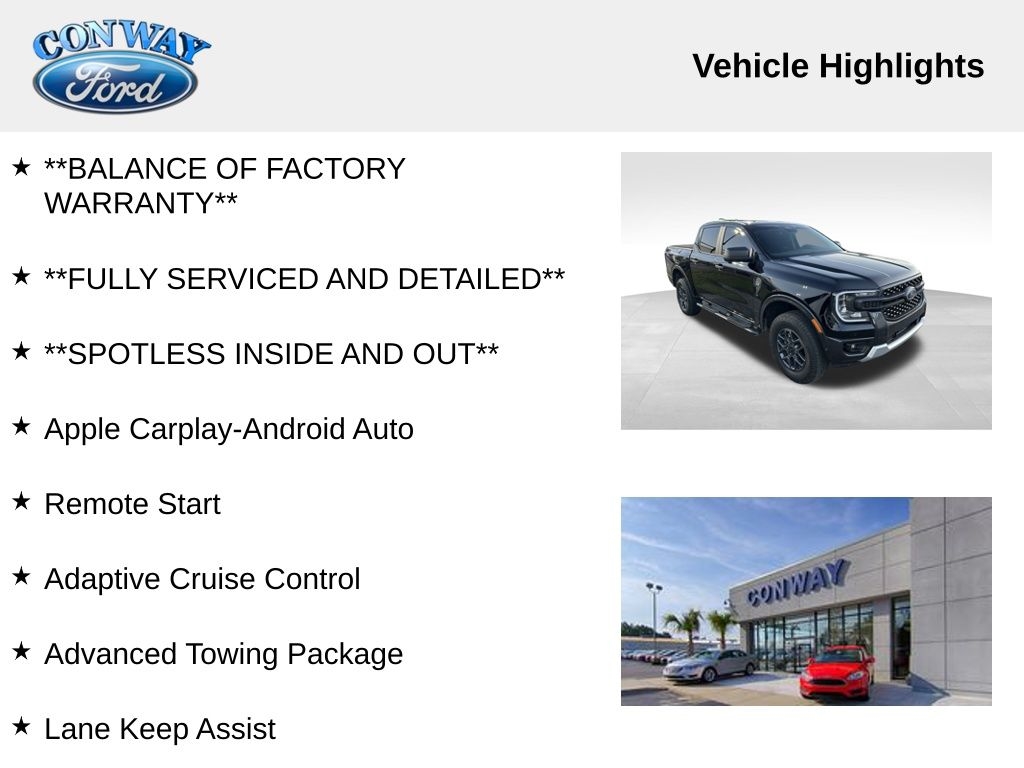 **ONE OWNER**, **NO ACCIDENTS NO ISSUES**, **BLUETOOTH HANDS FREE**, **BACK UP CAMERA**, **POWER DRIVER'S SEAT**, **BLIND SPOT MONITOR**, **NAVIGATION**, **LOCAL TRADE IN**, **BALANCE OF FACTORY WARRANTY**, **FULLY SERVICED AND DETAILED**, **SPOTLESS INSIDE AND OUT**, Apple Carplay-Android Auto, Remote Start, Adaptive Cruise Control, Advanced Towing Package, Lane Keep Assist, Sport Appearance Package, Ranger XLT, 4D Crew Cab, EcoBoost 2.3L I4 GTDi DOHC Turbocharged VCT, 4WD, Black Metallic, 12" Display in Center Stack, 360-Degree Camera, 4-Wheel Disc Brakes, ABS brakes, Adaptive Cruise Control, Advanced Towing Package Plus Technology Package, Air Conditioning, AM/FM radio: SiriusXM, Auto High-beam Headlights, Brake assist, Class IV Trailer Hitch Receiver, Compass, Connected Built-In Navigation, Delay-off headlights, Driver door bin, Driver vanity mirror, Dual front impact airbags, Dual front side impact airbags, Dual-Zone Electronic Climate Control (DEATC), Electronic Stability Control, Enhanced Active Park Assist, Equipment Group 301A High, Front fog lights, Front Parking Sensors, Front reading lights, Front wheel independent suspension, Fully automatic headlights, Gray Painted Center Bar & Grille Surround, Gray Painted Front Fascia & Rear Bumper, Gray Painted Wheel Lip Molding, Leather Shift Knob, Low tire pressure warning, Navigation system: Connected Navigation, Outside temperature display, Panic alarm, Passenger door bin, Passenger vanity mirror, Power door mirrors, Power windows, Power-Sliding Rear Window, Premium Cloth Front Bucket Seats, Premium Cloth Front Heated Bucket Seats, Pro Trailer Backup Assist, Rear window defroster, Remote keyless entry, Reverse Park Aid w/Trailer Guidance, SiriusXM Satellite Radio, Sport Appearance Package, Sport Box Decal, Steering wheel mounted audio controls, SYNC 4A w/Connected Navigation, Telescoping steering wheel, Traction control, Trailer Brake Controller, Trailer Tow, Trip computer, Variably intermittent wipers, Wheels: 17" Gray-Painted Aluminum.