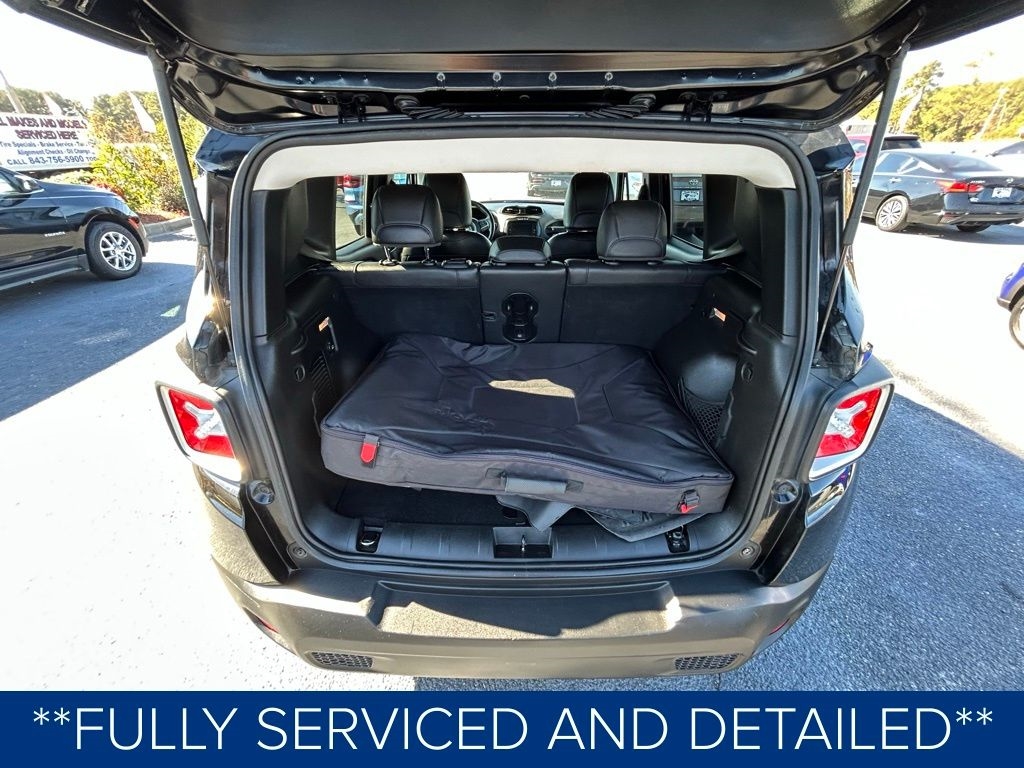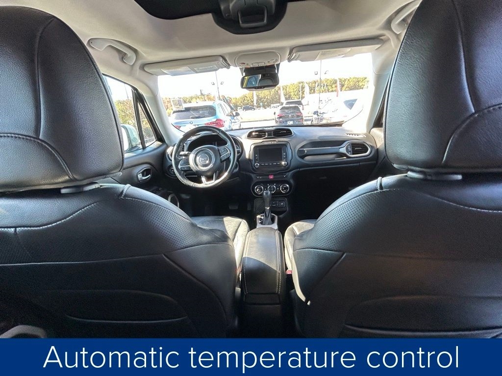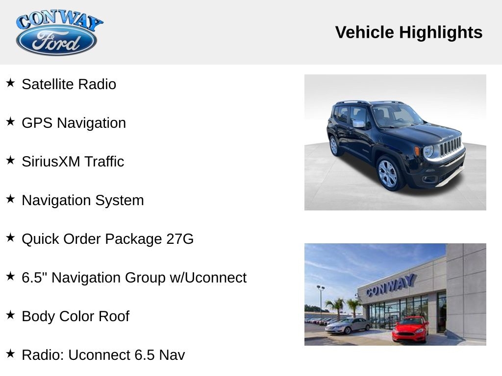 **ONE OWNER**, **BLUETOOTH HANDS FREE**, **LEATHER INTERIOR**, **POWER DRIVER'S SEAT**, **NAVIGATION**, **FULLY SERVICED AND DETAILED**, Remote Start, Power Retractable Roof, Satellite Radio, Renegade Limited, 4D Sport Utility, 2.4L I4 MultiAir, FWD, Black w/Leather Trimmed Bucket Seats, 1 Yr Trial (Registration Required), 18" x 7.0" Aluminum Polished Wheels, 4-Wheel Disc Brakes, 5-Year SiriusXM Traffic Service, 5-Year SiriusXM Travel Link Service, 6.5" Navigation Group w/Uconnect, 6.5" Touchscreen Display, ABS brakes, Air Conditioning, Automatic temperature control, Body Color Roof, Brake assist, Compass, Cruise Control, Delay-off headlights, Driver door bin, Driver vanity mirror, Dual front impact airbags, Dual front side impact airbags, Dual Zone Auto A/C, Electronic Stability Control, For Details Visit DriveUconnect.com, Four wheel independent suspension, Front Bucket Seats, Front fog lights, Front reading lights, Fully automatic headlights, GPS Navigation, HD Radio, Heated door mirrors, Heated Seats, Heated steering wheel, Knee airbag, Leather Shift Knob, Leather steering wheel, Leather Trimmed Bucket Seats, Low tire pressure warning, My Sky Power/Removable Sunroof, Navigation System, Outside temperature display, Panic alarm, ParkView Rear Back-Up Camera, Passenger door bin, Power door mirrors, Power driver seat, Power windows, Quick Order Package 27G, Radio: Uconnect 6.5 Nav, Rear window defroster, Rear window wiper, Remote keyless entry, Remote USB Port, SiriusXM Traffic, SiriusXM Travel Link, Spoiler, Steering wheel mounted audio controls, Tachometer, Telescoping steering wheel, Trip computer, Uconnect Access, Variably intermittent wipers.