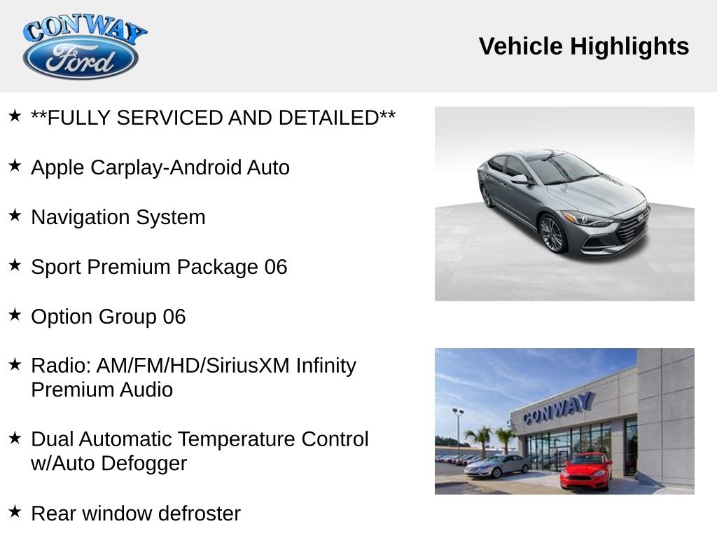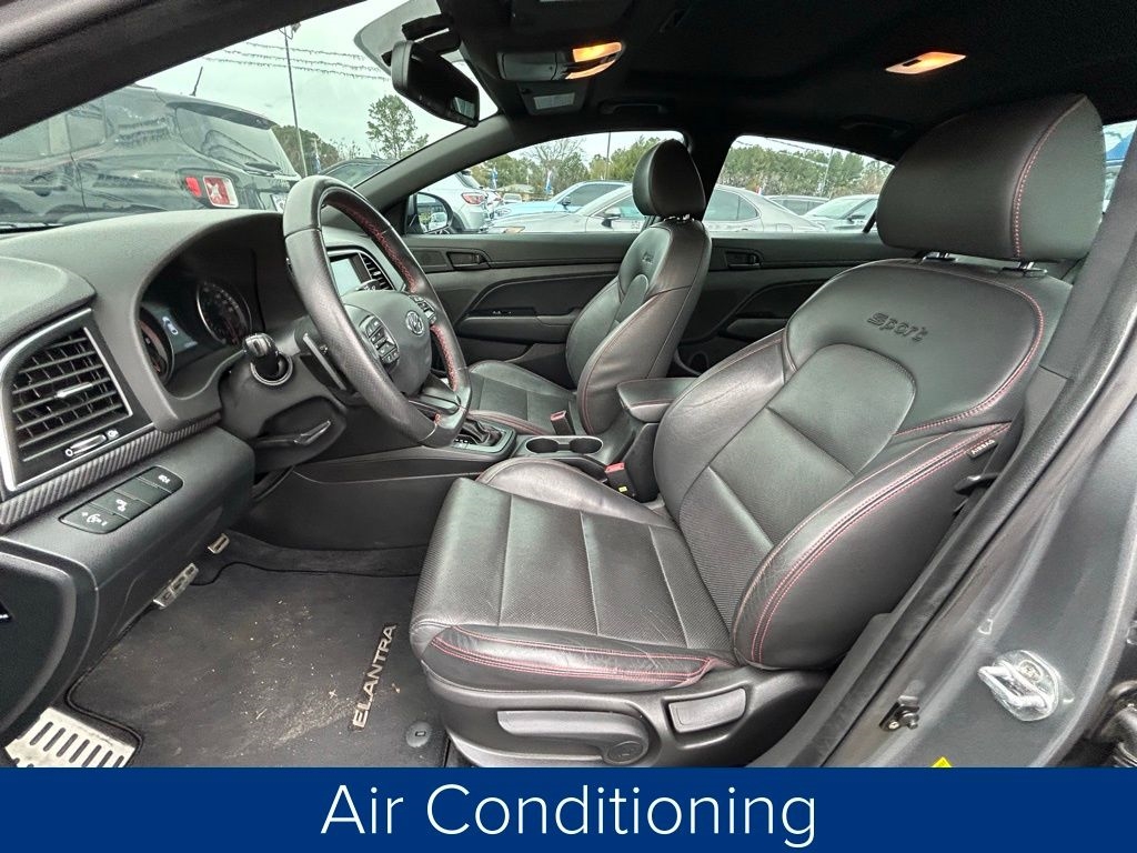 **NO ACCIDENTS NO ISSUES**, **BLUETOOTH HANDS FREE**, **POWER SUNROOF/MOONROOF**, **BACK UP CAMERA**, **LEATHER INTERIOR**, **POWER DRIVER'S SEAT**, **BLIND SPOT MONITOR**, **NAVIGATION**, **FULLY SERVICED AND DETAILED**, Apple Carplay-Android Auto, Elantra Sport Premium, 4D Sedan, 1.6L Turbo GDI 4-Cylinder, FWD, Galactic Gray, Black Leather, 4-Wheel Disc Brakes, ABS brakes, Air Conditioning, Auto-Dimming Rear-View Mirror, Blind Spot Detection w/Rear Cross-Traffic Alert, Brake assist, Bumpers: body-color, Cruise Control, Delay-off headlights, Driver door bin, Driver vanity mirror, Dual Automatic Temperature Control w/Auto Defogger, Dual front impact airbags, Dual front side impact airbags, Electronic Stability Control, Exterior Parking Camera Rear, Four wheel independent suspension, Front reading lights, Fully automatic headlights, Heated door mirrors, Heated Front Sport Seats, High-Intensity Discharge Headlights, Knee airbag, Leather Seating Surfaces, Leather Shift Knob, Leather steering wheel, Low tire pressure warning, Navigation System, Option Group 06, Outside temperature display, Panic alarm, Passenger door bin, Passenger vanity mirror, Power door mirrors, Power Tilt & Slide Sunroof, Power windows, Radio: AM/FM/HD/SiriusXM Infinity Premium Audio, Rear window defroster, Remote keyless entry, Sport Premium Package 06, Sport steering wheel, Steering wheel mounted audio controls, Tachometer, Telescoping steering wheel, Traction control, Trip computer, Turn signal indicator mirrors.