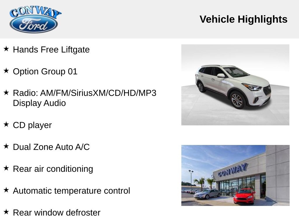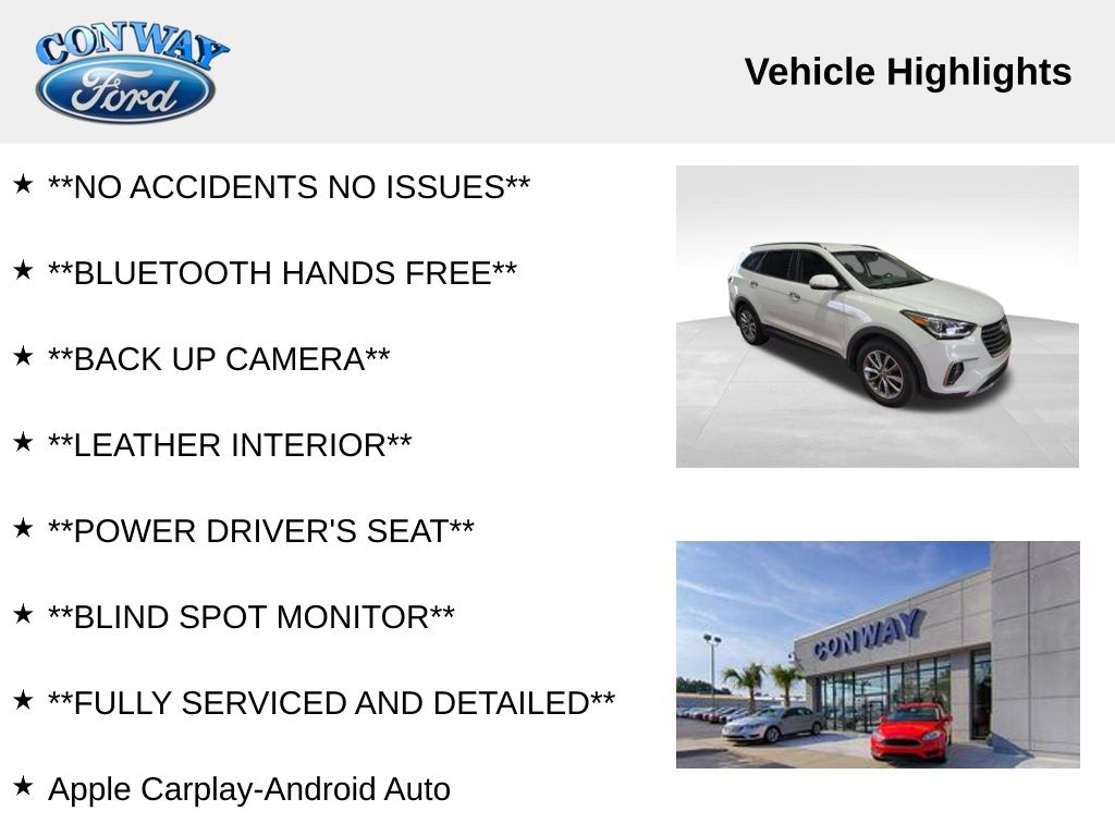 **NO ACCIDENTS NO ISSUES**, **BLUETOOTH HANDS FREE**, **BACK UP CAMERA**, **LEATHER INTERIOR**, **POWER DRIVER'S SEAT**, **BLIND SPOT MONITOR**, **FULLY SERVICED AND DETAILED**, Apple Carplay-Android Auto, Hands Free Liftgate, Santa Fe Limited, 4D Sport Utility, 3.3L V6 DGI DOHC 24V, FWD, Monaco, Black Leather, 18" x 7.5J Aluminum Alloy Wheels, 4-Wheel Disc Brakes, ABS brakes, Air Conditioning, Automatic temperature control, Brake assist, Bumpers: body-color, CD player, Compass, Cruise Control, Delay-off headlights, Driver door bin, Driver vanity mirror, Dual front impact airbags, Dual front side impact airbags, Dual Zone Auto A/C, Electronic Stability Control, Exterior Parking Camera Rear, Four wheel independent suspension, Front fog lights, Front reading lights, Fully automatic headlights, Garage door transmitter: HomeLink, Heated door mirrors, Heated Multi-Adjustable Bucket Seats, Heated Seats, Knee airbag, Leather Seating Surfaces, Low tire pressure warning, Mudguards, Option Group 01, Outside temperature display, Panic alarm, Passenger door bin, Power door mirrors, Power driver seat, Power Folding 3rd row seats: split-bench, Power Liftgate, Power passenger seat, Power windows, Radio: AM/FM/SiriusXM/CD/HD/MP3 Display Audio, Rear air conditioning, Rear window defroster, Rear window wiper, Remote keyless entry, Spoiler, Steering wheel mounted audio controls, Tachometer, Telescoping steering wheel, Traction control, Variably intermittent wipers.