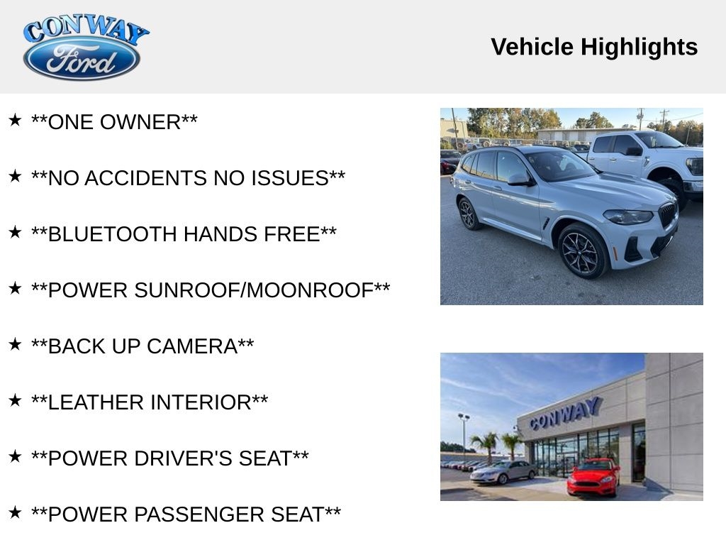 **ONE OWNER**, **NO ACCIDENTS NO ISSUES**, **BLUETOOTH HANDS FREE**, **POWER SUNROOF/MOONROOF**, **BACK UP CAMERA**, **LEATHER INTERIOR**, **POWER DRIVER'S SEAT**, **POWER PASSENGER SEAT**, **BLIND SPOT MONITOR**, **NAVIGATION**, **BALANCE OF FACTORY WARRANTY**, **FULLY SERVICED AND DETAILED**, Apple Carplay-Android Auto, Dynamic Cruise Control, Pano Sunroof, M Sport, Premium Package, HiFi Sound System, X3 sDrive30i M Sport Package, 4D Sport Utility, 2.0L I4 TwinPower Turbo, 8-Speed Automatic Sport, Brooklyn Gray Metallic, Tacora Red w/Perforated SensaTec Upholstery, 4-Wheel Disc Brakes, ABS brakes, Active Park Distance Control, Aerodynamic Kit, Air Conditioning, AM/FM radio: SiriusXM, Apple CarPlay & Android Auto Compatibility, Auto High-beam Headlights, Automatic temperature control, Brake assist, Bumpers: body-color, Connected Package Pro, ConnectedDrive Services, Cruise Control, Delay-off headlights, Driver door bin, Driver Lumbar Support, Driver vanity mirror, Dual front impact airbags, Dual front side impact airbags, Dual Zone Auto A/C, Electronic Stability Control, Extended Shadowline Trim, Four wheel independent suspension, Front Bucket Seats, Front reading lights, Fully automatic headlights, Heated door mirrors, Heated Front Seats, Heated Steering Wheel, Knee airbag, Live Cockpit Pro w/Navigation, M Shadowline Lights, M Sport Package, M Sport Package (337), M Steering Wheel, Memory seat, Navigation, Outside temperature display, Panic alarm, Panoramic Moonroof, Parking Assistance Package, Parking Assistant Plus, Passenger door bin, Power door mirrors, Power driver seat, Power Liftgate, Power passenger seat, Power windows, Premium Package, Radio data system, Rain sensing wipers, Rear air conditioning, Rear reading lights, Rear window defroster, Rear window wiper, Rear-View Camera, Remote keyless entry, Roof Rails in High-Gloss Shadowline, Shadowline Exterior Trim, Shadowline Package, SiriusXM Satellite Radio, Smoke Grey Aluminum Rhombicle Trim, Spoiler, Steering wheel mounted audio controls, Surround View w/3D View, Tachometer, Telescoping steering wheel, Traction control, Trip computer, Variably intermittent wipers, Wheels: 19" x 7.5" M Y-Spoke Bi-Color (Style 887M), WiFi Hotspot, Wireless Charging, Without Exterior Lines Designation.