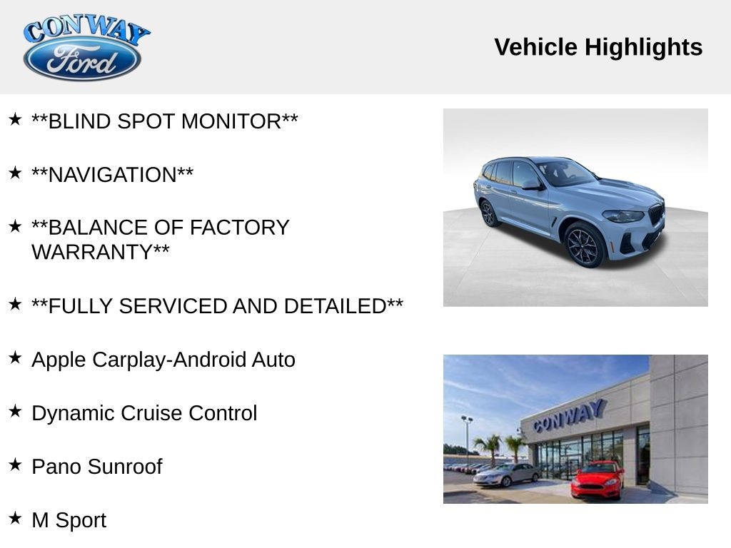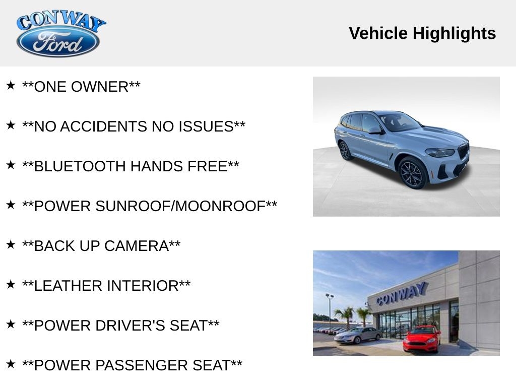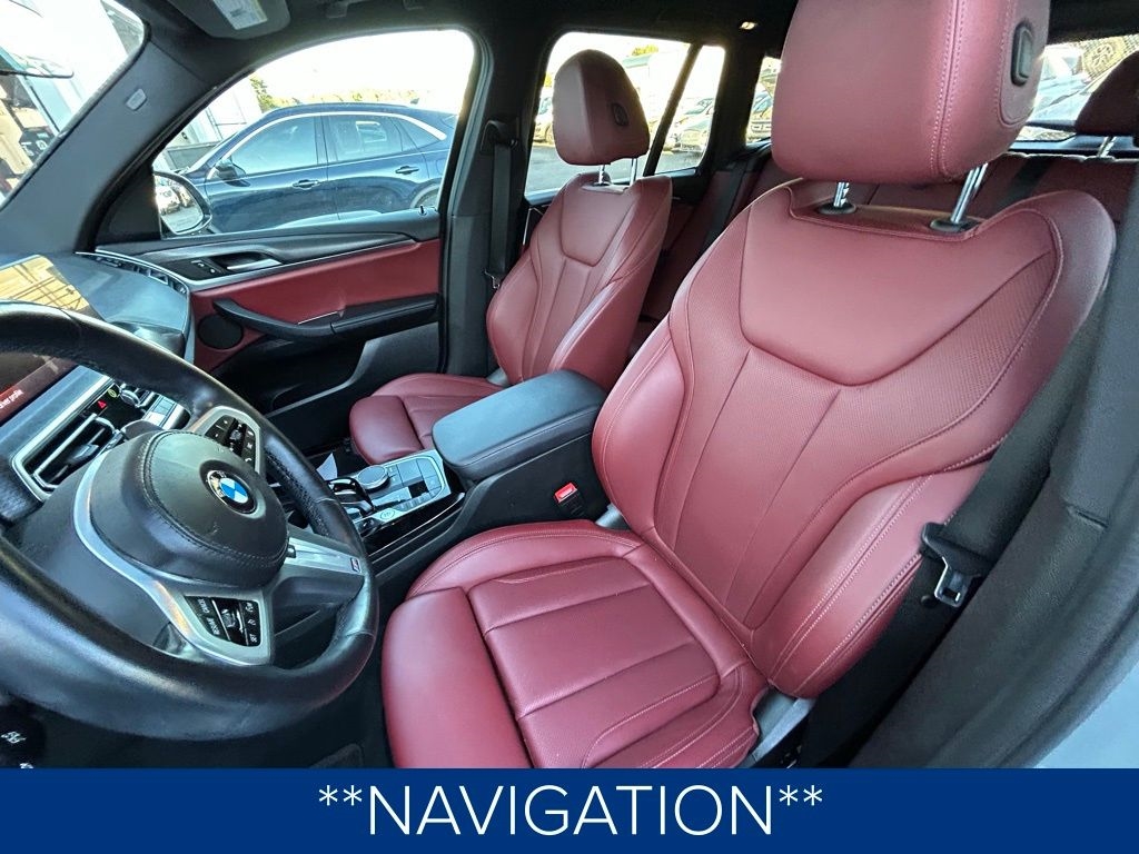 **ONE OWNER**, **NO ACCIDENTS NO ISSUES**, **BLUETOOTH HANDS FREE**, **POWER SUNROOF/MOONROOF**, **BACK UP CAMERA**, **LEATHER INTERIOR**, **POWER DRIVER'S SEAT**, **POWER PASSENGER SEAT**, **BLIND SPOT MONITOR**, **NAVIGATION**, **BALANCE OF FACTORY WARRANTY**, **FULLY SERVICED AND DETAILED**, Apple Carplay-Android Auto, Dynamic Cruise Control, Pano Sunroof, M Sport, Premium Package, HiFi Sound System, X3 sDrive30i M Sport Package, 4D Sport Utility, 2.0L I4 TwinPower Turbo, 8-Speed Automatic Sport, Brooklyn Gray Metallic, Tacora Red w/Perforated SensaTec Upholstery, 4-Wheel Disc Brakes, ABS brakes, Active Park Distance Control, Aerodynamic Kit, Air Conditioning, AM/FM radio: SiriusXM, Apple CarPlay & Android Auto Compatibility, Auto High-beam Headlights, Automatic temperature control, Brake assist, Bumpers: body-color, Connected Package Pro, ConnectedDrive Services, Cruise Control, Delay-off headlights, Driver door bin, Driver Lumbar Support, Driver vanity mirror, Dual front impact airbags, Dual front side impact airbags, Dual Zone Auto A/C, Electronic Stability Control, Extended Shadowline Trim, Four wheel independent suspension, Front Bucket Seats, Front reading lights, Fully automatic headlights, Heated door mirrors, Heated Front Seats, Heated Steering Wheel, Knee airbag, Live Cockpit Pro w/Navigation, M Shadowline Lights, M Sport Package, M Sport Package (337), M Steering Wheel, Memory seat, Navigation, Outside temperature display, Panic alarm, Panoramic Moonroof, Parking Assistance Package, Parking Assistant Plus, Passenger door bin, Power door mirrors, Power driver seat, Power Liftgate, Power passenger seat, Power windows, Premium Package, Radio data system, Rain sensing wipers, Rear air conditioning, Rear reading lights, Rear window defroster, Rear window wiper, Rear-View Camera, Remote keyless entry, Roof Rails in High-Gloss Shadowline, Shadowline Exterior Trim, Shadowline Package, SiriusXM Satellite Radio, Smoke Grey Aluminum Rhombicle Trim, Spoiler, Steering wheel mounted audio controls, Surround View w/3D View, Tachometer, Telescoping steering wheel, Traction control, Trip computer, Variably intermittent wipers, Wheels: 19" x 7.5" M Y-Spoke Bi-Color (Style 887M), WiFi Hotspot, Wireless Charging, Without Exterior Lines Designation.