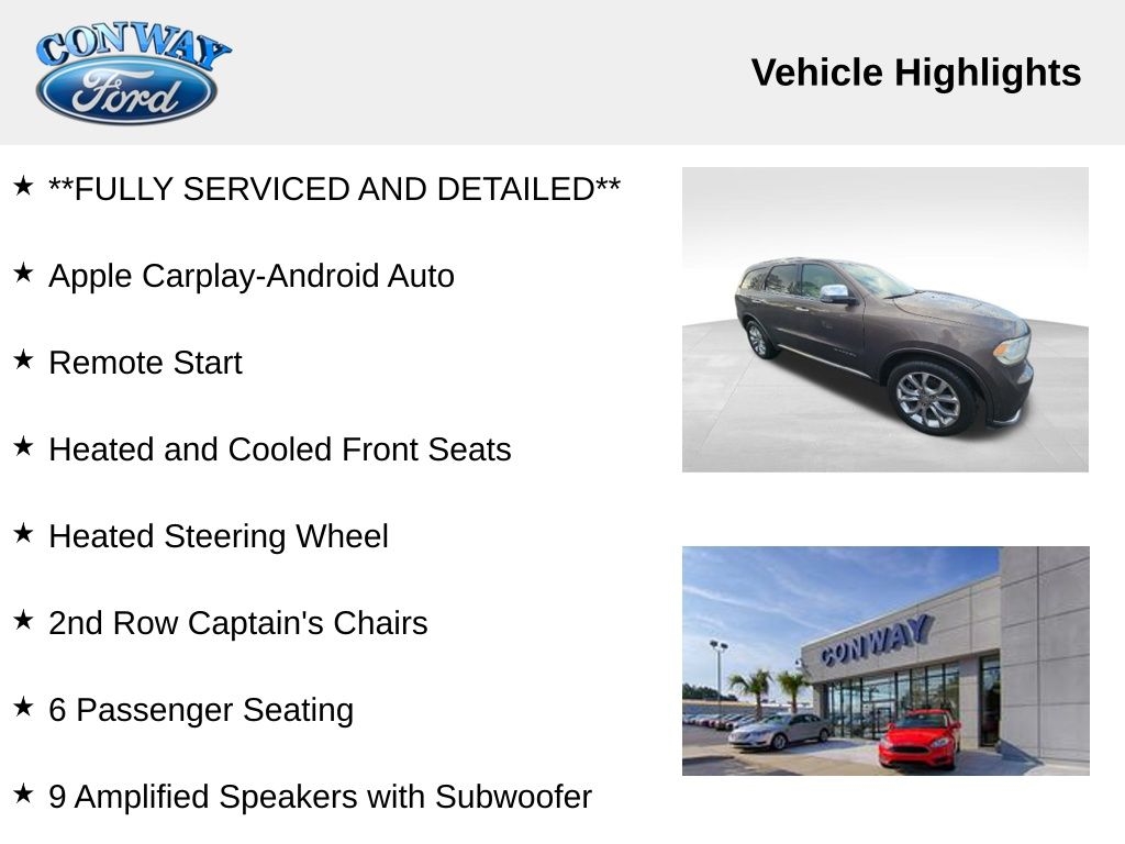 **NO ACCIDENTS NO ISSUES**, **BLUETOOTH HANDS FREE**, **POWER SUNROOF/MOONROOF**, **BACK UP CAMERA**, **LEATHER INTERIOR**, **POWER DRIVER'S SEAT**, **POWER PASSENGER SEAT**, **NAVIGATION**, **FULLY SERVICED AND DETAILED**, Apple Carplay-Android Auto, Remote Start, Heated and Cooled Front Seats, Heated Steering Wheel, 2nd Row Captain's Chairs, 6 Passenger Seating, 9 Amplified Speakers with Subwoofer, Power Liftgate, Front and Rear Park Assist, Durango Citadel, 4D Sport Utility, 3.6L V6 24V VVT, Stout Brown Met. Clearcoat, Lt Frost Beige/Black Leather, 20" Premium Painted Wheels, 2nd Row Mini Console w/Cupholders, 3rd Row Floor Mat & Mini Console, 4-Wheel Disc Brakes, 6-Passenger Seating, 7 & 4 Pin Wiring Harness, ABS brakes, Air Conditioning, AM/FM radio: SiriusXM, Apple CarPlay, Apple CarPlay/Android Auto, Auto High-beam Headlights, Auto-leveling suspension, Automatic temperature control, Brake assist, Bumpers: body-color, Class IV Receiver Hitch, Compass, Cruise Control, Delay-off headlights, Driver door bin, Driver vanity mirror, Dual front impact airbags, Dual front side impact airbags, Dual Zone Auto A/C, Electronic Stability Control, Four wheel independent suspension, Front fog lights, Front reading lights, Fully automatic headlights, Google Android Auto, Heated door mirrors, Heated Seats, Heated steering wheel, Heavy-Duty Engine Cooling, Knee airbag, Low tire pressure warning, Lux Leather Trimmed Bucket Seats, Memory seat, Navigation System, Outside temperature display, Panic alarm, ParkView Rear Back-Up Camera, Passenger door bin, Passenger vanity mirror, Power door mirrors, Power driver seat, Power Liftgate, Power moonroof, Power passenger seat, Power windows, Quick Order Package 2BJ, Radio data system, Radio: Uconnect 4C Nav w/8.4" Display, Rain sensing wipers, Rear air conditioning, Rear Load Leveling Suspension, Rear reading lights, Rear window defroster, Rear window wiper, Remote keyless entry, Spoiler, Steering wheel mounted audio controls, Tachometer, Telescoping steering wheel, Traction control, Trailer Tow w/ Controller, Trip computer, Variably intermittent wipers, Ventilated front seats.