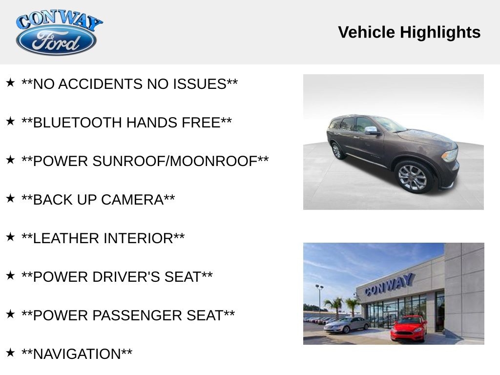 **NO ACCIDENTS NO ISSUES**, **BLUETOOTH HANDS FREE**, **POWER SUNROOF/MOONROOF**, **BACK UP CAMERA**, **LEATHER INTERIOR**, **POWER DRIVER'S SEAT**, **POWER PASSENGER SEAT**, **NAVIGATION**, **FULLY SERVICED AND DETAILED**, Apple Carplay-Android Auto, Remote Start, Heated and Cooled Front Seats, Heated Steering Wheel, 2nd Row Captain's Chairs, 6 Passenger Seating, 9 Amplified Speakers with Subwoofer, Power Liftgate, Front and Rear Park Assist, Durango Citadel, 4D Sport Utility, 3.6L V6 24V VVT, Stout Brown Met. Clearcoat, Lt Frost Beige/Black Leather, 20" Premium Painted Wheels, 2nd Row Mini Console w/Cupholders, 3rd Row Floor Mat & Mini Console, 4-Wheel Disc Brakes, 6-Passenger Seating, 7 & 4 Pin Wiring Harness, ABS brakes, Air Conditioning, AM/FM radio: SiriusXM, Apple CarPlay, Apple CarPlay/Android Auto, Auto High-beam Headlights, Auto-leveling suspension, Automatic temperature control, Brake assist, Bumpers: body-color, Class IV Receiver Hitch, Compass, Cruise Control, Delay-off headlights, Driver door bin, Driver vanity mirror, Dual front impact airbags, Dual front side impact airbags, Dual Zone Auto A/C, Electronic Stability Control, Four wheel independent suspension, Front fog lights, Front reading lights, Fully automatic headlights, Google Android Auto, Heated door mirrors, Heated Seats, Heated steering wheel, Heavy-Duty Engine Cooling, Knee airbag, Low tire pressure warning, Lux Leather Trimmed Bucket Seats, Memory seat, Navigation System, Outside temperature display, Panic alarm, ParkView Rear Back-Up Camera, Passenger door bin, Passenger vanity mirror, Power door mirrors, Power driver seat, Power Liftgate, Power moonroof, Power passenger seat, Power windows, Quick Order Package 2BJ, Radio data system, Radio: Uconnect 4C Nav w/8.4" Display, Rain sensing wipers, Rear air conditioning, Rear Load Leveling Suspension, Rear reading lights, Rear window defroster, Rear window wiper, Remote keyless entry, Spoiler, Steering wheel mounted audio controls, Tachometer, Telescoping steering wheel, Traction control, Trailer Tow w/ Controller, Trip computer, Variably intermittent wipers, Ventilated front seats.