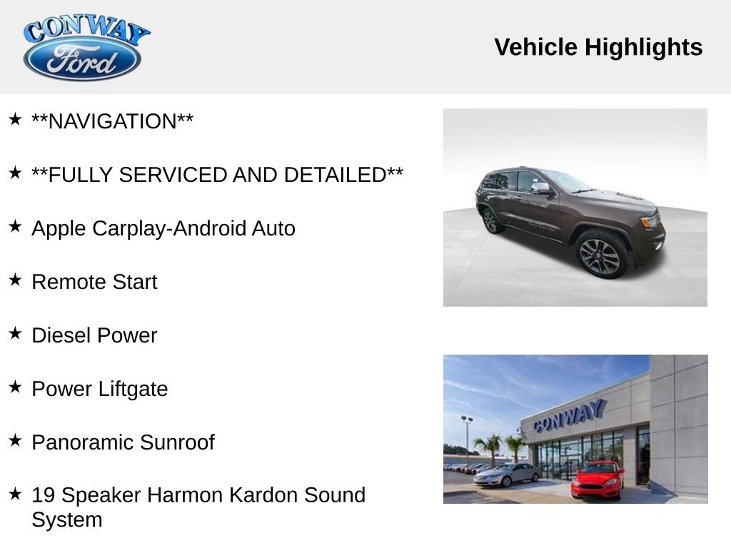 **NO ACCIDENTS NO ISSUES**, **BLUETOOTH HANDS FREE**, **POWER SUNROOF/MOONROOF**, **BACK UP CAMERA**, **LEATHER INTERIOR**, **POWER DRIVER'S SEAT**, **POWER PASSENGER SEAT**, **BLIND SPOT MONITOR**, **NAVIGATION**, **FULLY SERVICED AND DETAILED**, Apple Carplay-Android Auto, Remote Start, Diesel Power, Power Liftgate, Panoramic Sunroof, 19 Speaker Harmon Kardon Sound System, Lane Sense and Adaptive Cruise, Heated and Cooled Front Seats-Heated Rear Seats, Heated Steering Wheel, Grand Cherokee Overland, 4D Sport Utility, 3.0L V6 Turbodiesel, 4WD, Walnut Brown Metallic Clearcoat, Brown w/Leather Trim Seats w/Edge Welting, 19 Speakers High Performance Audio, 4-Wheel Disc Brakes, 825 Watt Amplifier, ABS brakes, Active Noise Control System, Adaptive Cruise Control w/Stop, Advanced Brake Assist, Air Conditioning, Apple CarPlay/Android Auto, Auto High-beam Headlights, Auto-leveling suspension, Automatic temperature control, Blind Spot & Cross Path Detection, Brake assist, Bumpers: body-color, Compass, Delay-off headlights, Driver door bin, Driver vanity mirror, Dual front impact airbags, Dual front side impact airbags, Dual Zone Auto A/C, Electronic Stability Control, Four wheel independent suspension, Front Bucket Seats, Front fog lights, Front reading lights, Full Speed FWD Collision Warn Plus, Fully automatic headlights, Garage door transmitter, Heated door mirrors, Heated Rear Seats, Heated Seats, Heated steering wheel, Jeep Advanced Active Safety Group, Knee airbag, Lane Departure Warning Plus, Leather Shift Knob, Leather steering wheel, Leather Trim Seats w/Edge Welting, Low tire pressure warning, Memory seat, Navigation System, Outside temperature display, Panic alarm, Parallel & Perp Park Assist w/Stop, ParkView Rear Back-Up Camera, Passenger door bin, Power door mirrors, Power driver seat, Power Liftgate, Power moonroof, Power passenger seat, Power windows, Quick Order Package 2CP, Radio data system, Radio: Uconnect 4C Nav w/8.4" Display, Rain Sensitive Windshield Wipers, Rear reading lights, Rear window defroster, Rear window wiper, Remote keyless entry, Spoiler, Steering wheel mounted audio controls, Tachometer, Telescoping steering wheel, Traction control, Trip computer, Variably intermittent wipers, Ventilated front seats, Wheels: 20" x 8.0" Tech Gray Aluminum.