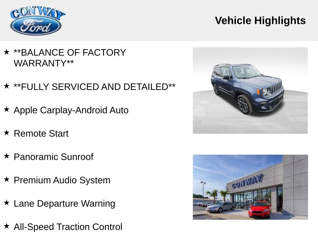 **NO ACCIDENTS NO ISSUES**, **BLUETOOTH HANDS FREE**, **POWER SUNROOF/MOONROOF**, **BACK UP CAMERA**, **LEATHER INTERIOR**, **POWER DRIVER'S SEAT**, **BLIND SPOT MONITOR**, **NAVIGATION**, **BALANCE OF FACTORY WARRANTY**, **FULLY SERVICED AND DETAILED**, Apple Carplay-Android Auto, Remote Start, Panoramic Sunroof, Premium Audio System, Lane Departure Warning, All-Speed Traction Control, Heated Front Seats and Steering Wheel, Renegade Limited, 4D Sport Utility, 1.3L I4, 4WD, Slate Blue Pearlcoat, Black Leather, 4-Wheel Disc Brakes, ABS brakes, Air Conditioning, AM/FM radio: SiriusXM, Apple CarPlay/Android Auto, Automatic temperature control, Brake assist, Compass, Cruise Control, Delay-off headlights, Driver door bin, Driver vanity mirror, Dual front impact airbags, Dual Zone Auto A/C, Dual-Pane Panoramic Power Sunroof, Electronic Stability Control, Four wheel independent suspension, Front Bucket Seats, Front reading lights, Fully automatic headlights, Heated door mirrors, Heated Seats, Heated steering wheel, Knee airbag, Leather Shift Knob, Leather steering wheel, Leather Trimmed Bucket Seats, Low tire pressure warning, Navigation System, Outside temperature display, Panic alarm, ParkView Rear Back-Up Camera, Passenger door bin, Power door mirrors, Power driver seat, Power windows, Premium Audio, Quick Order Package 22D, Radio data system, Radio: Uconnect 4C Nav w/8.4" Display, Rear window defroster, Rear window wiper, Remote keyless entry, Spoiler, Steering wheel mounted audio controls, Sun, Sound & Wheels Group, Tachometer, Telescoping steering wheel, Traction control, Trip computer, Variably intermittent wipers, Wheels: 19" x 7.5" Diamond Cut Aluminum.