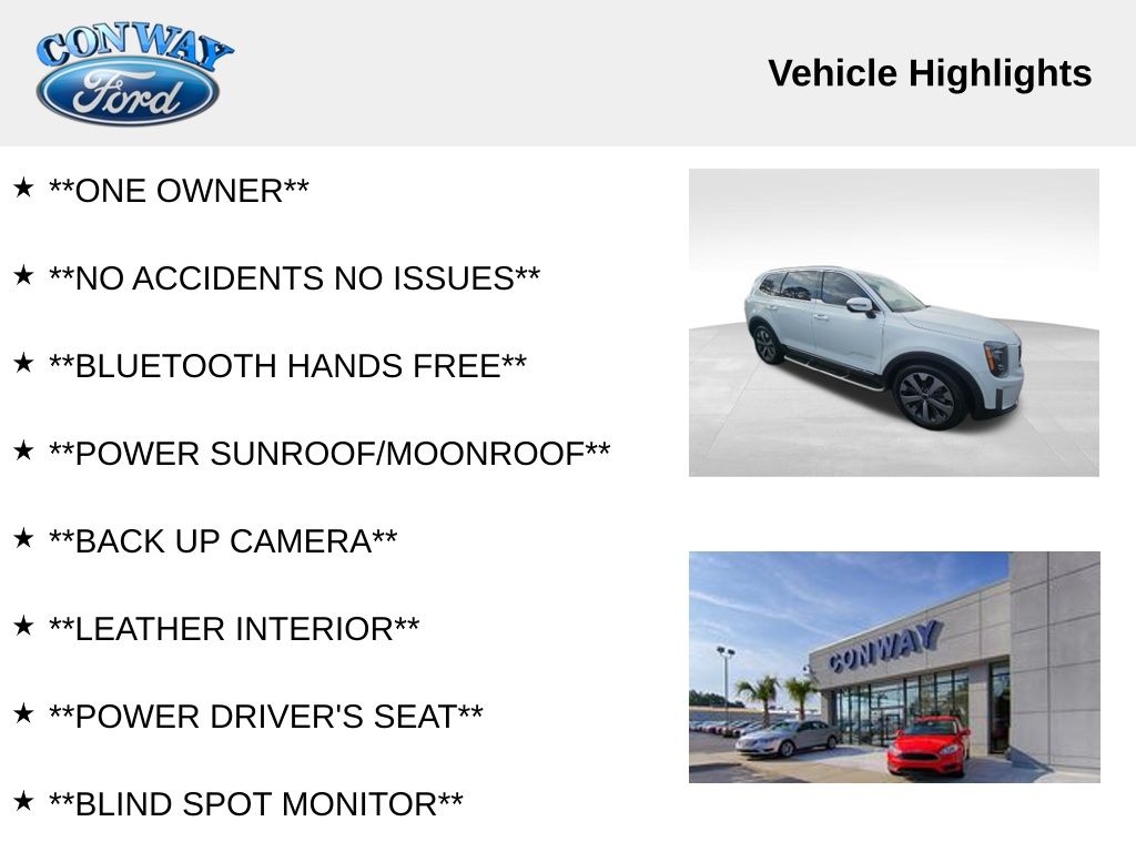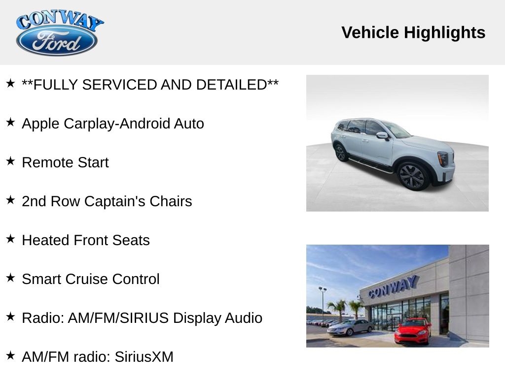 **ONE OWNER**, **NO ACCIDENTS NO ISSUES**, **BLUETOOTH HANDS FREE**, **POWER SUNROOF/MOONROOF**, **BACK UP CAMERA**, **LEATHER INTERIOR**, **POWER DRIVER'S SEAT**, **BLIND SPOT MONITOR**, **FULLY SERVICED AND DETAILED**, Apple Carplay-Android Auto, Remote Start, 2nd Row Captain's Chairs, Heated Front Seats, Smart Cruise Control, Telluride S, 4D Sport Utility, 3.8L V6 DGI DOHC Dual CVVT, AWD, Snow White Pearl, Gray w/SOFINO Leathertte Seat Trim, 20" Premium Painted Wheels, 4-Wheel Disc Brakes, ABS brakes, Adaptive Cruise Control, Air Conditioning, AM/FM radio: SiriusXM, Brake assist, Bumpers: body-color, Delay-off headlights, Driver door bin, Driver vanity mirror, Dual front impact airbags, Dual front side impact airbags, Electronic Stability Control, Four wheel independent suspension, Front Bucket Seats, Front reading lights, Fully automatic headlights, Heated door mirrors, Heated Seats, Knee airbag, Leather Shift Knob, Leather steering wheel, Low tire pressure warning, Outside temperature display, Panic alarm, Passenger door bin, Power door mirrors, Power driver seat, Power moonroof, Power windows, Radio data system, Radio: AM/FM/SIRIUS Display Audio, Rear air conditioning, Rear reading lights, Rear window defroster, Rear window wiper, Reclining 3rd row seat, Remote keyless entry, Side Step Bars, Smart Key w/ Push Button and Remote Start, SOFINO Leathertte Seat Trim, Split folding rear seat, Spoiler, Steering wheel mounted audio controls, Tachometer, Telescoping steering wheel, Traction control, Trip computer, Variably intermittent wipers.